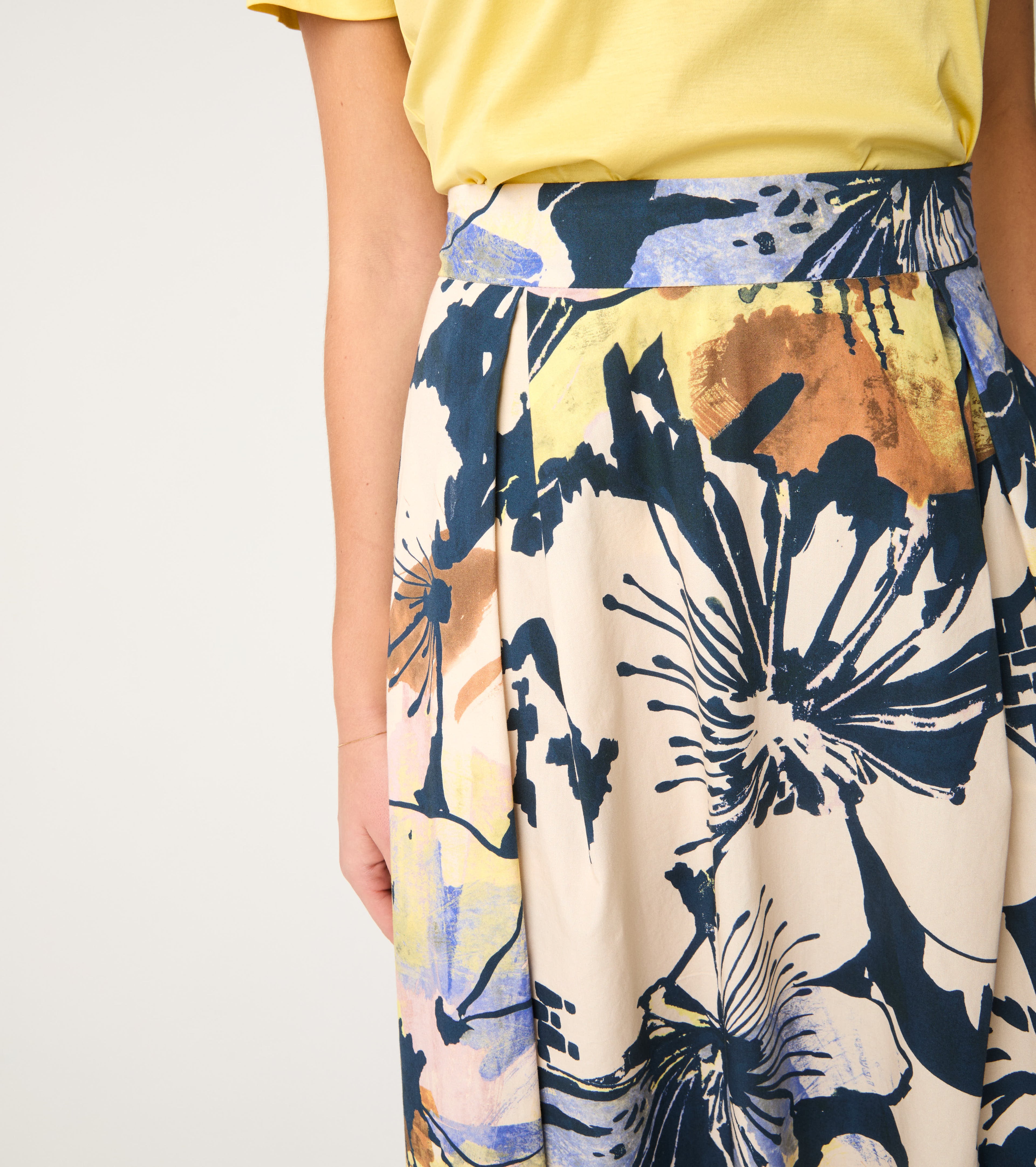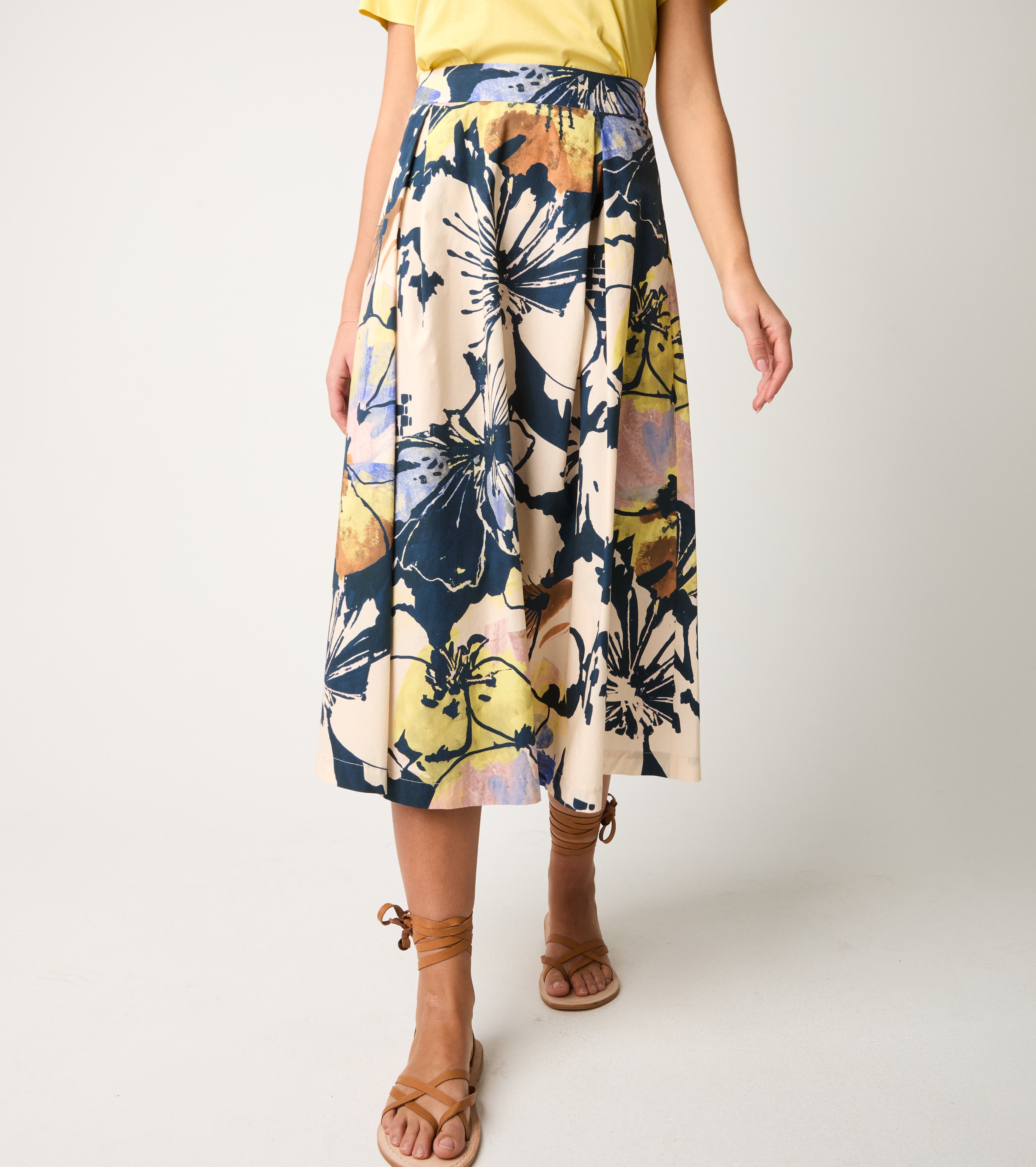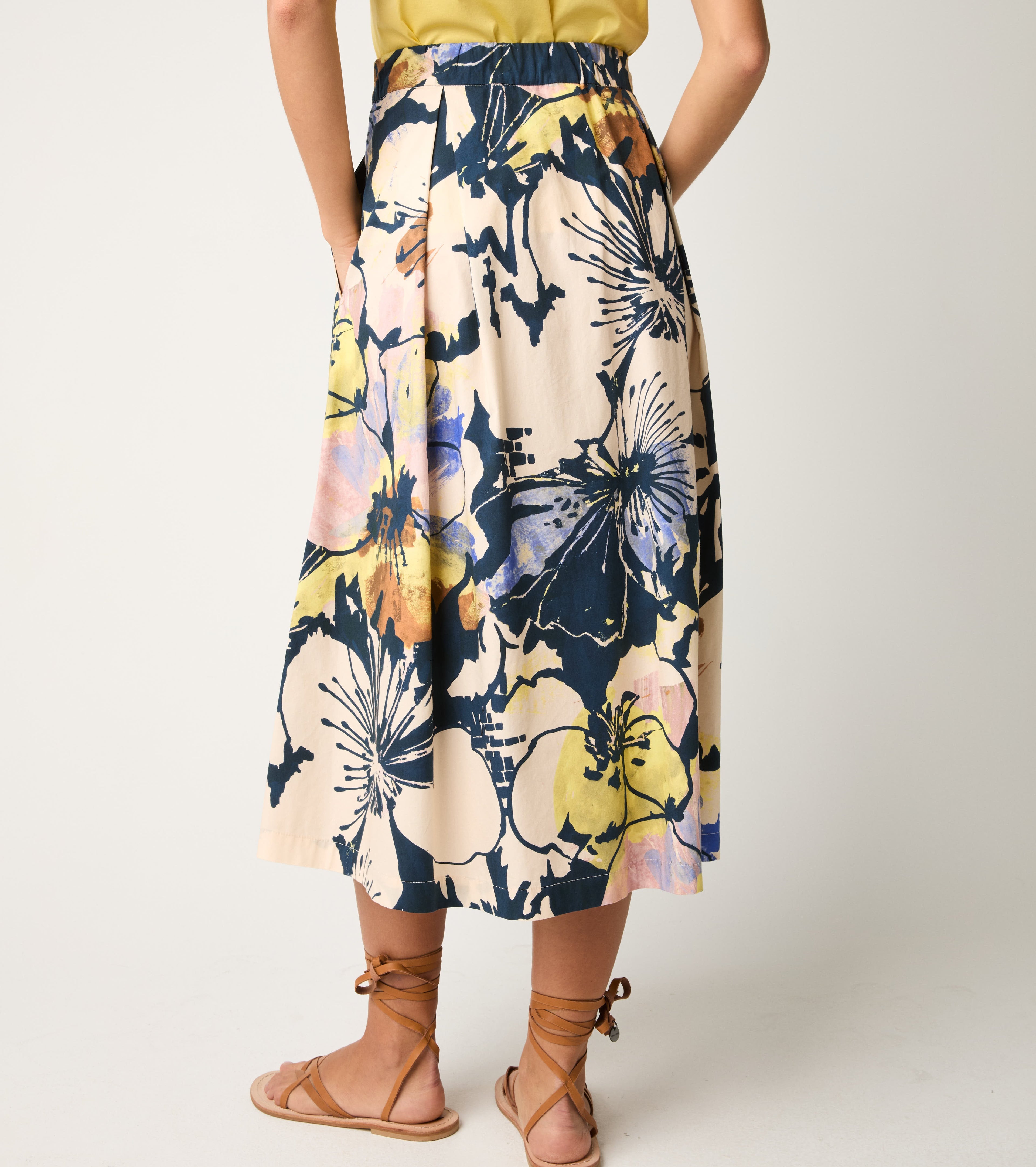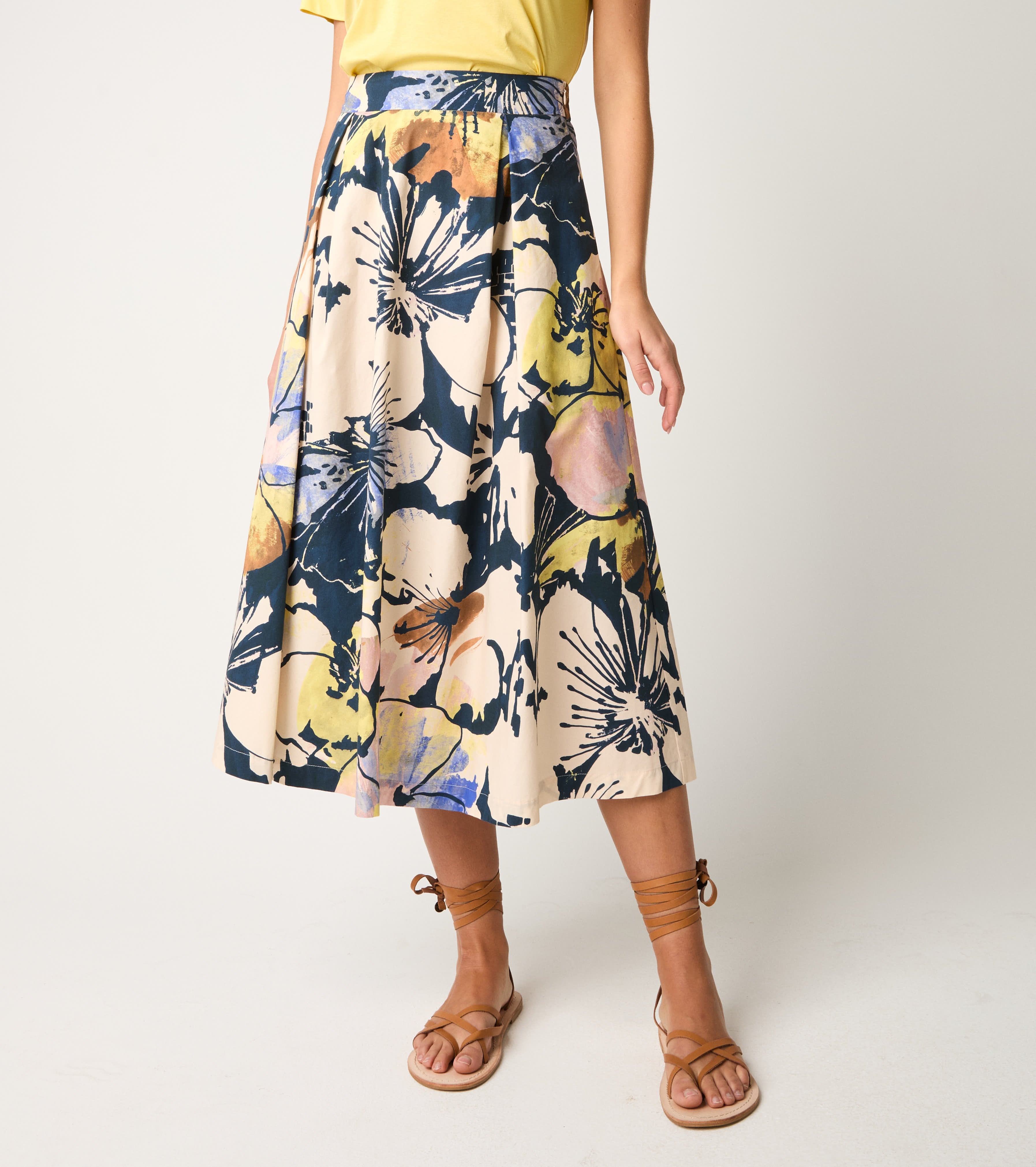 Изберете полата с дължина до коляното, изработена от памучен поплин и украсена с ярък флорален принт.