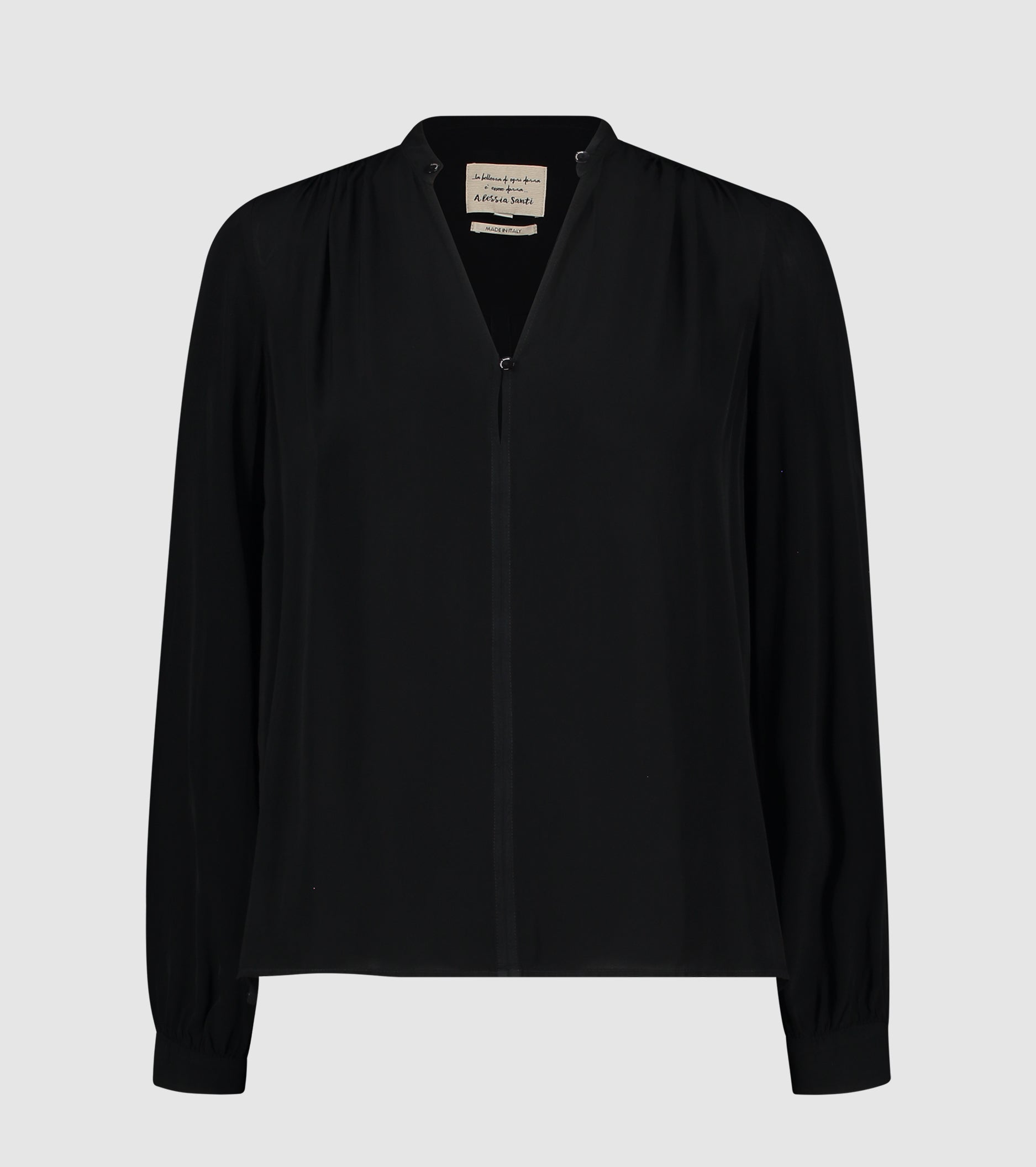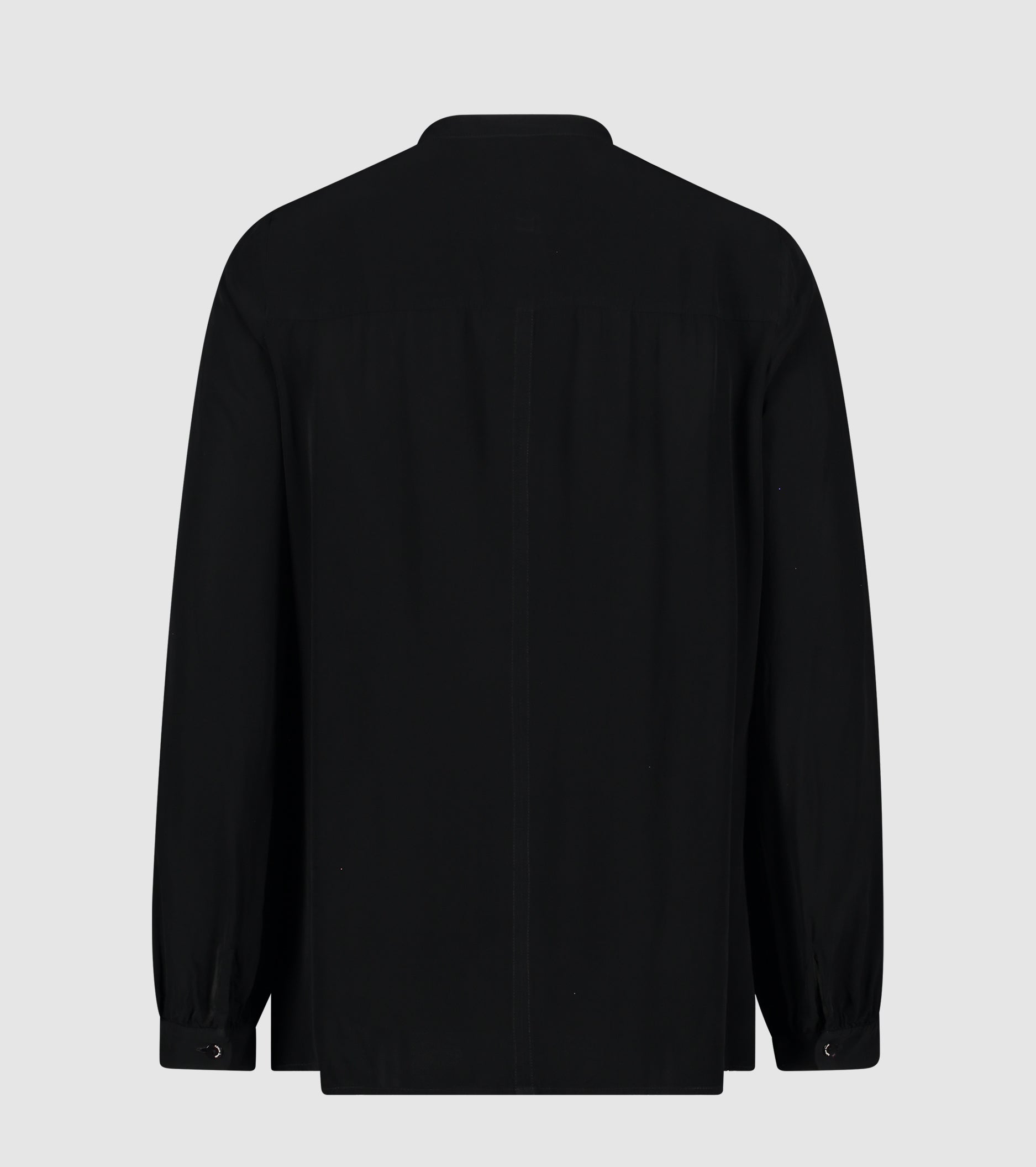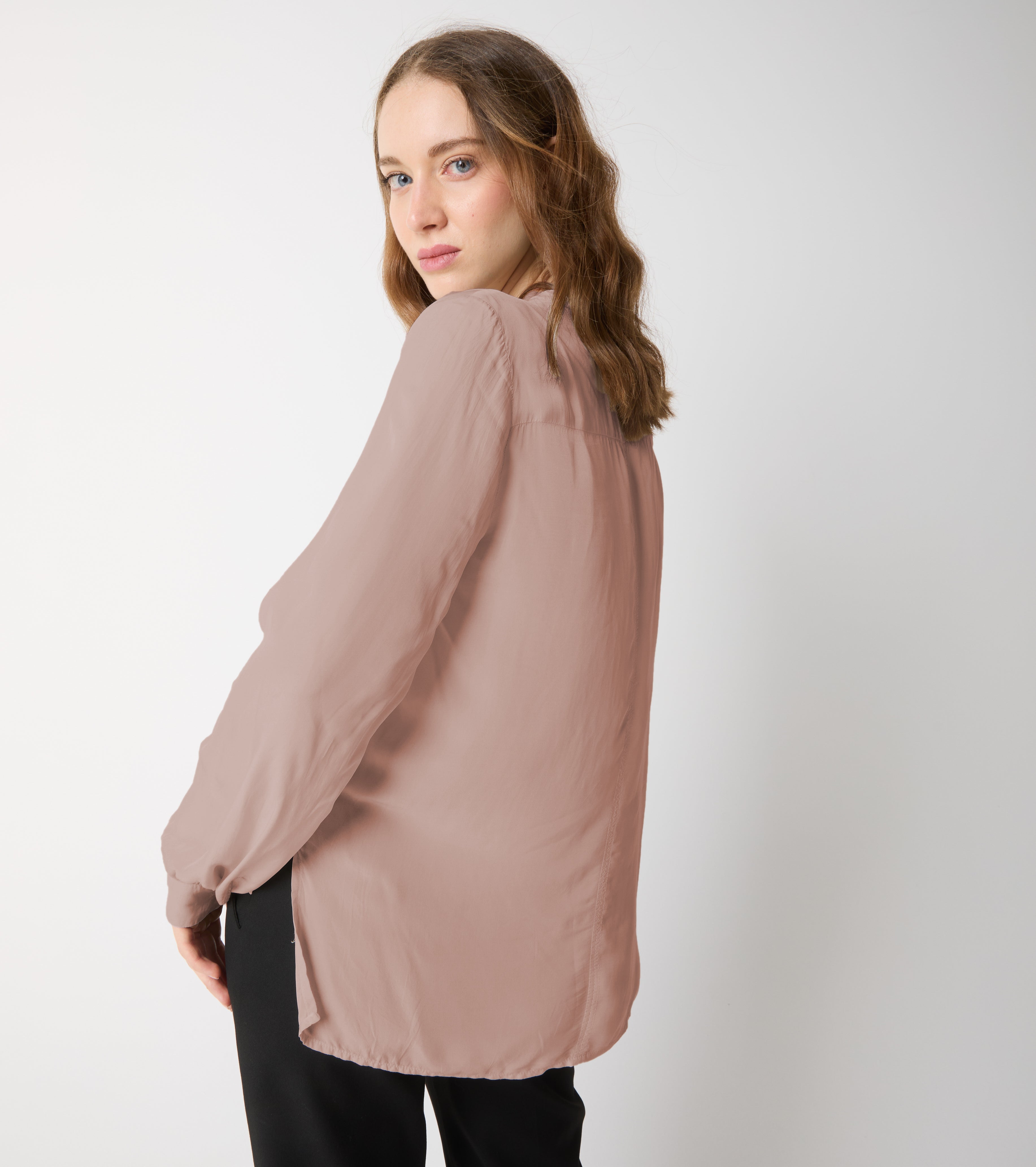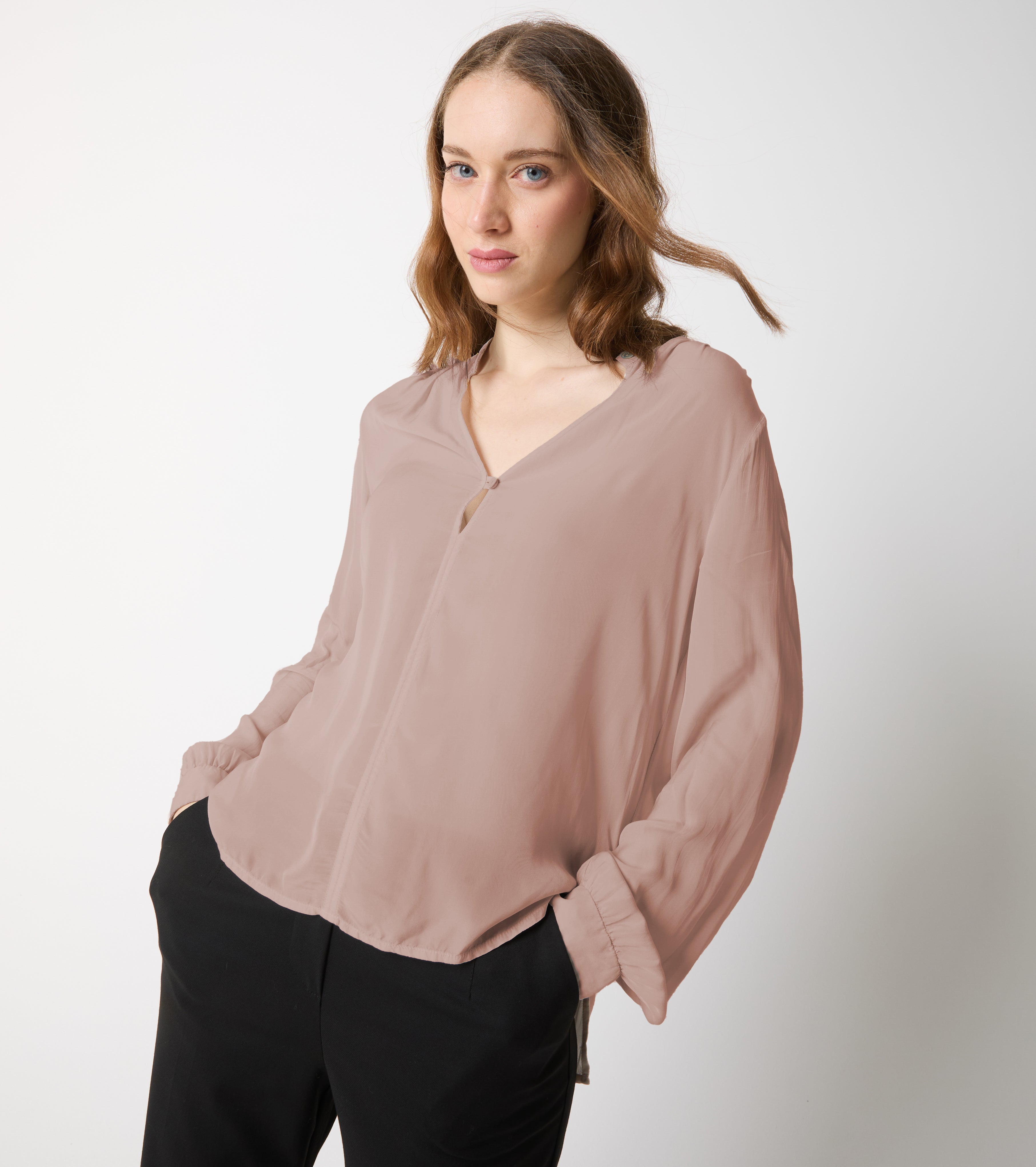 Моделът е с свободна кройка, V-образно деколте с копчета, дълги ръкави и деликатни набори на раменете. Проста и женствена дреха за изтънчена елегантност.