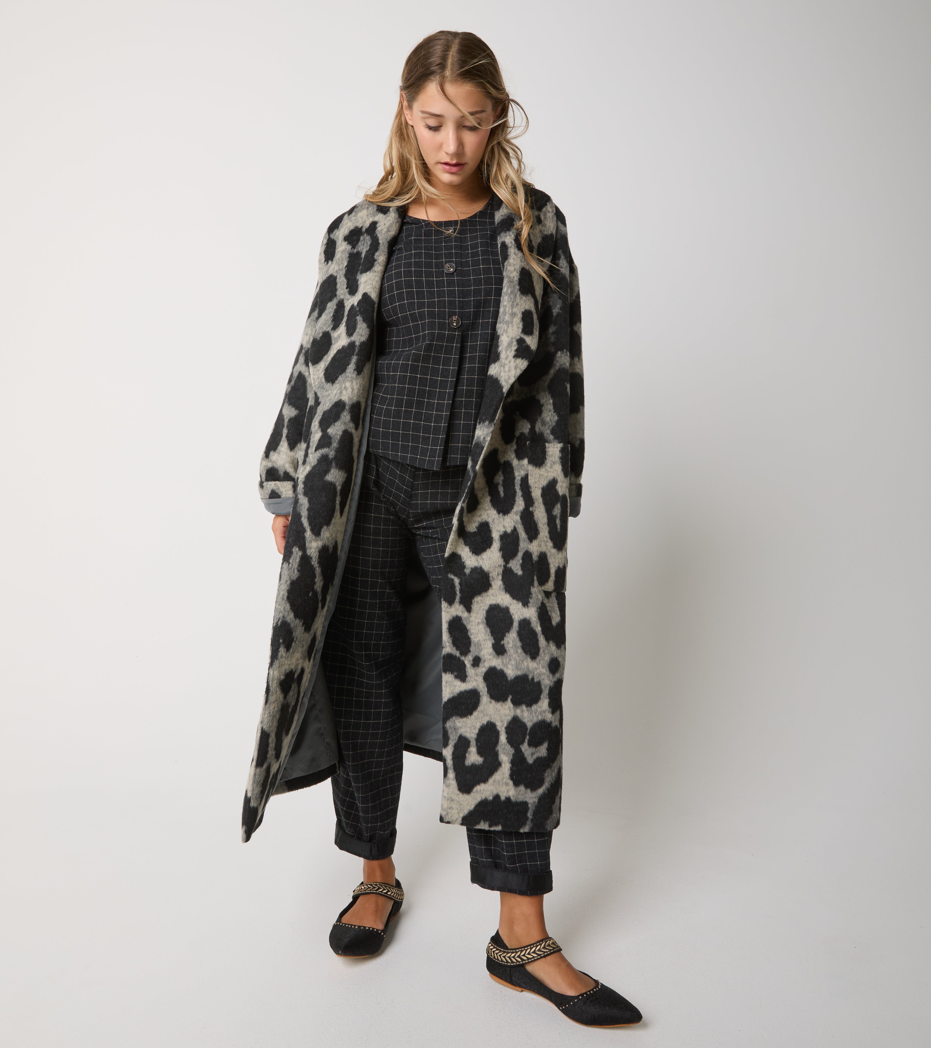 Il modello ha collo a giro, maniche a tre quarti e bottoni sul davanti. Linea boxy per un look retrò e raffinato.