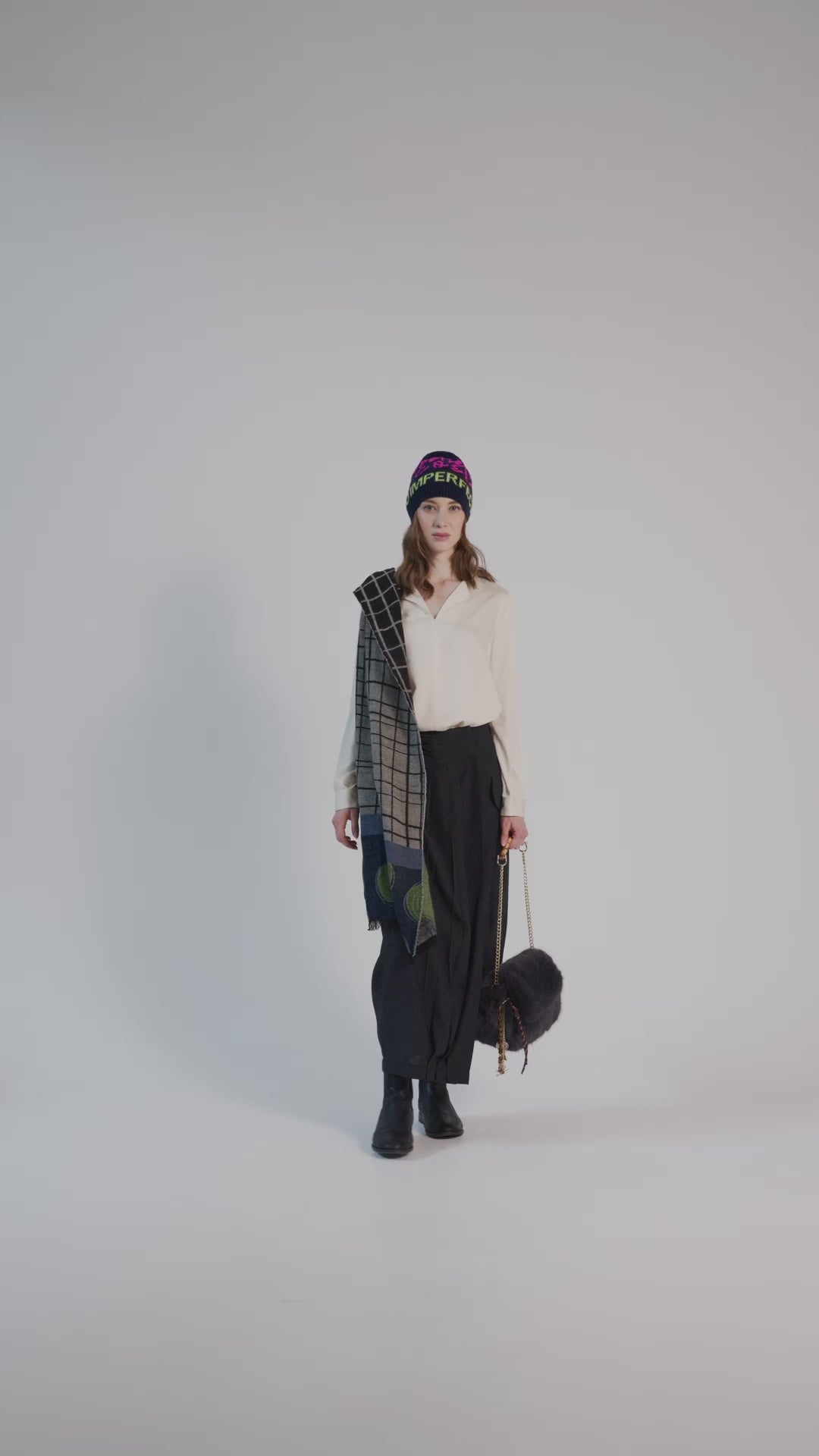 La blusa color avorio si abbina perfettamente al pantalone scuro dal design sartoriale e all’eleganza scenografica della stola in ecopelliccia, per un look sofisticato e glamour.