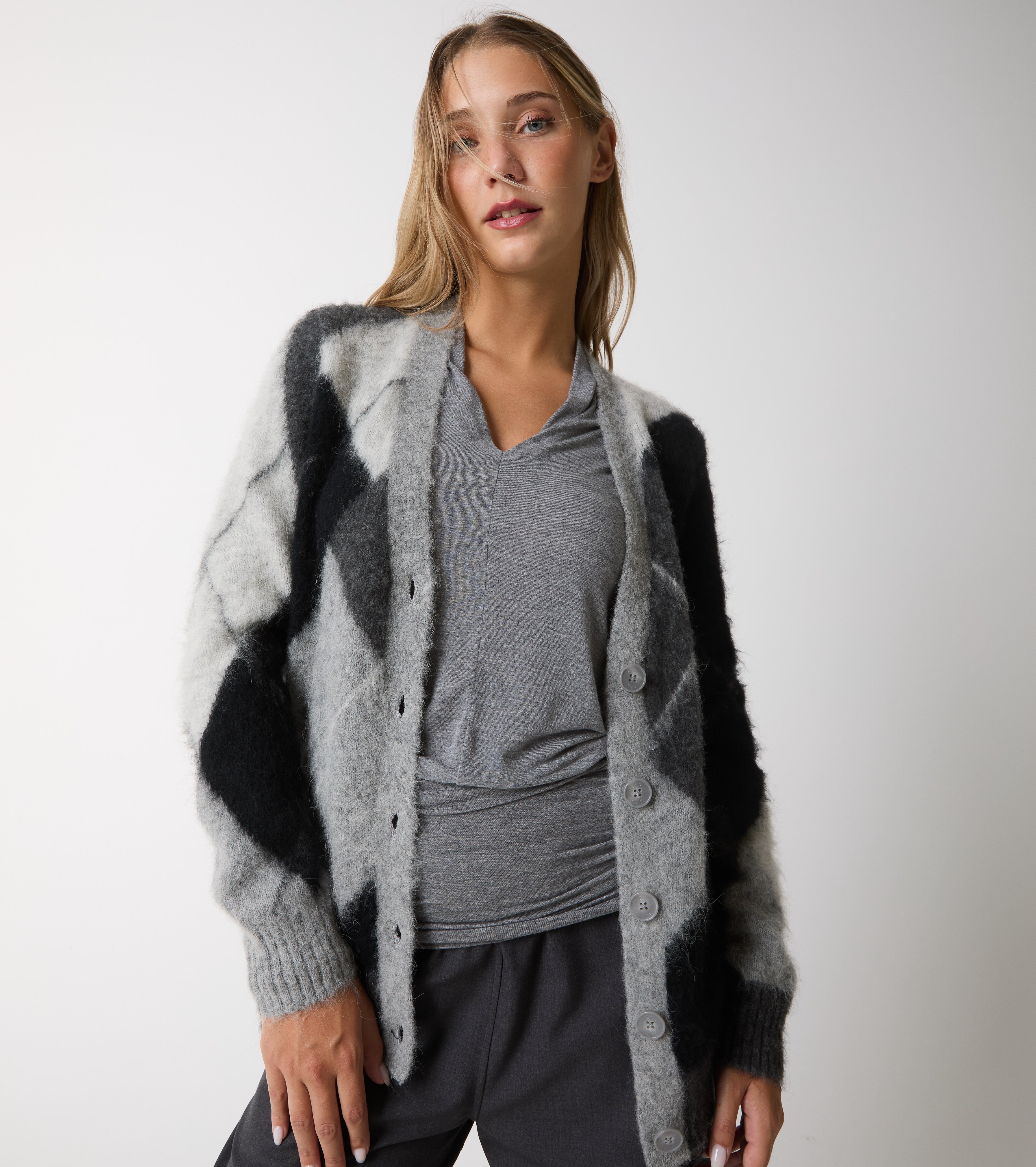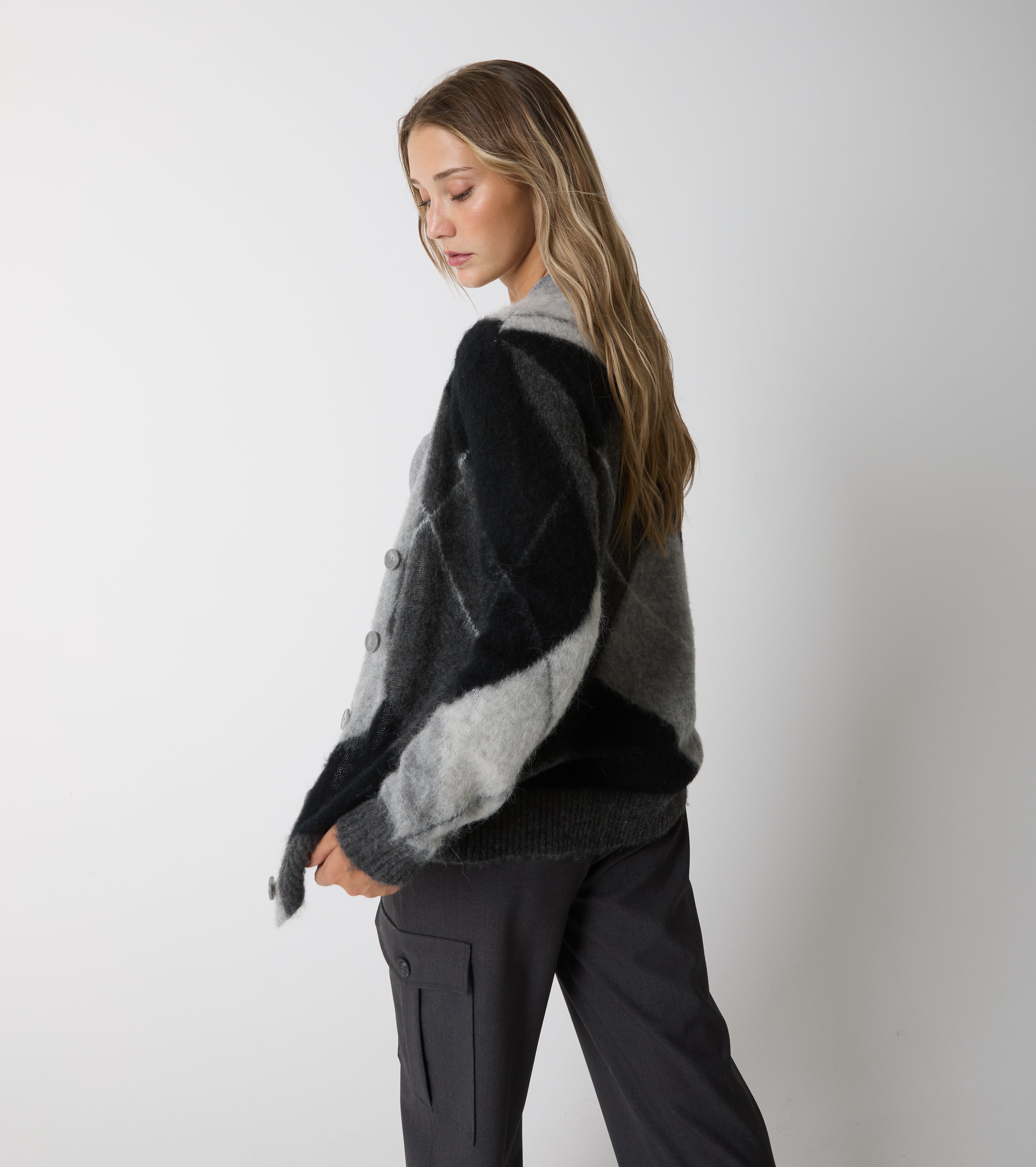 Scegli il cardigan realizzato in morbido filato di misto lana e alpaca con maxi motivo a rombi.