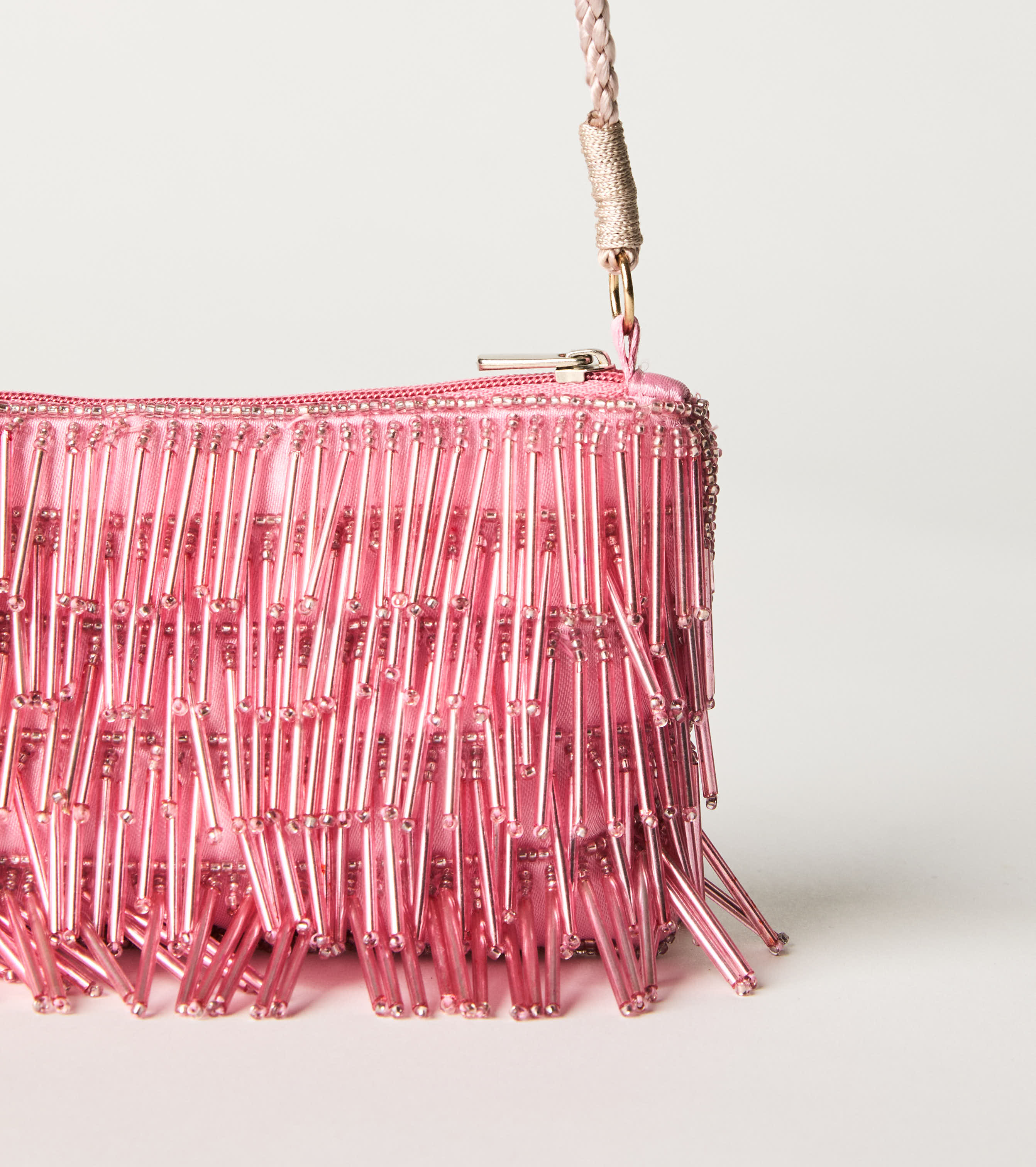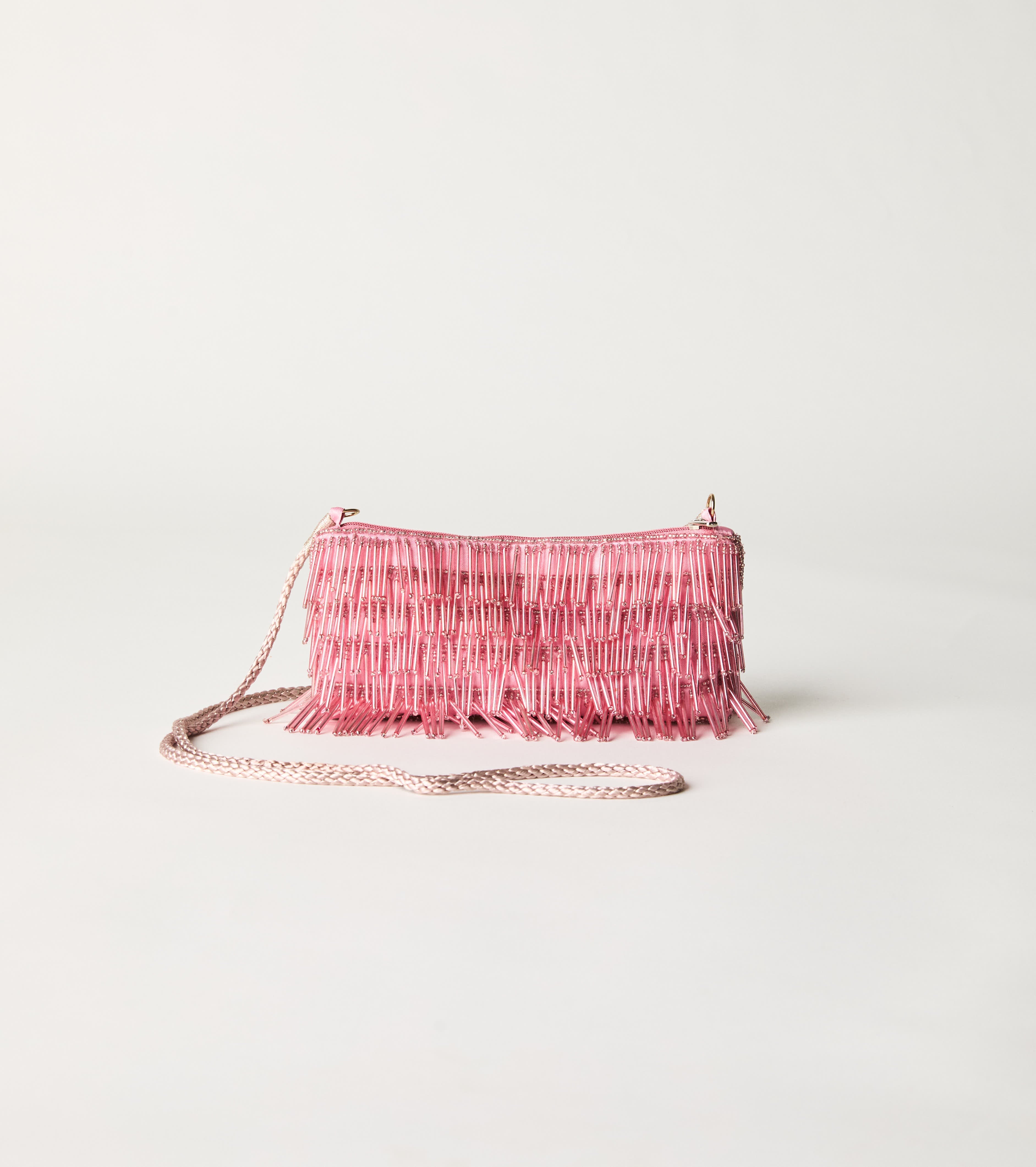 Изберете чантата с презрамка, изработена от мека материя и украсена с стъклени ресни.