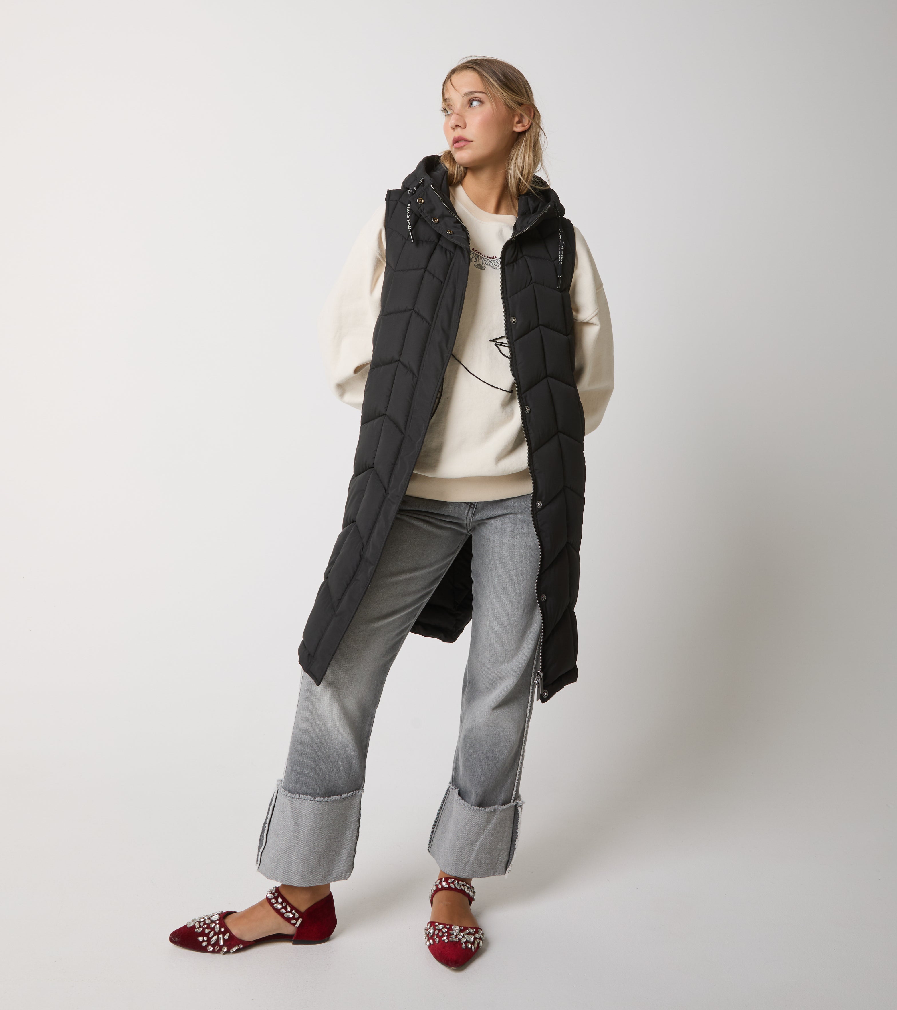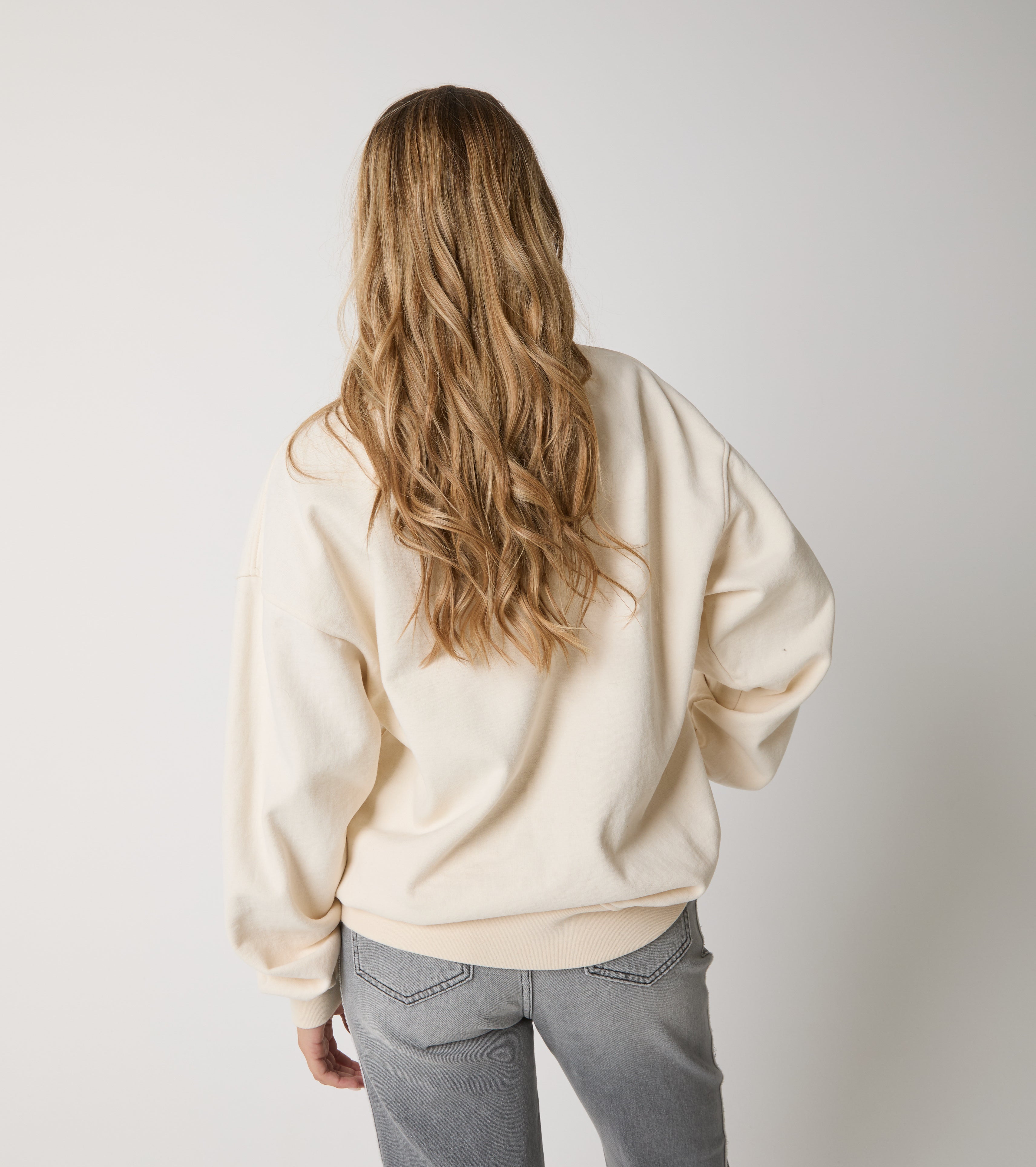 Il modello ha una vestibilità over, collo a giro e maniche ampie. Per un outfit sporty-chic che celebra l’identità e la bellezza autentica.