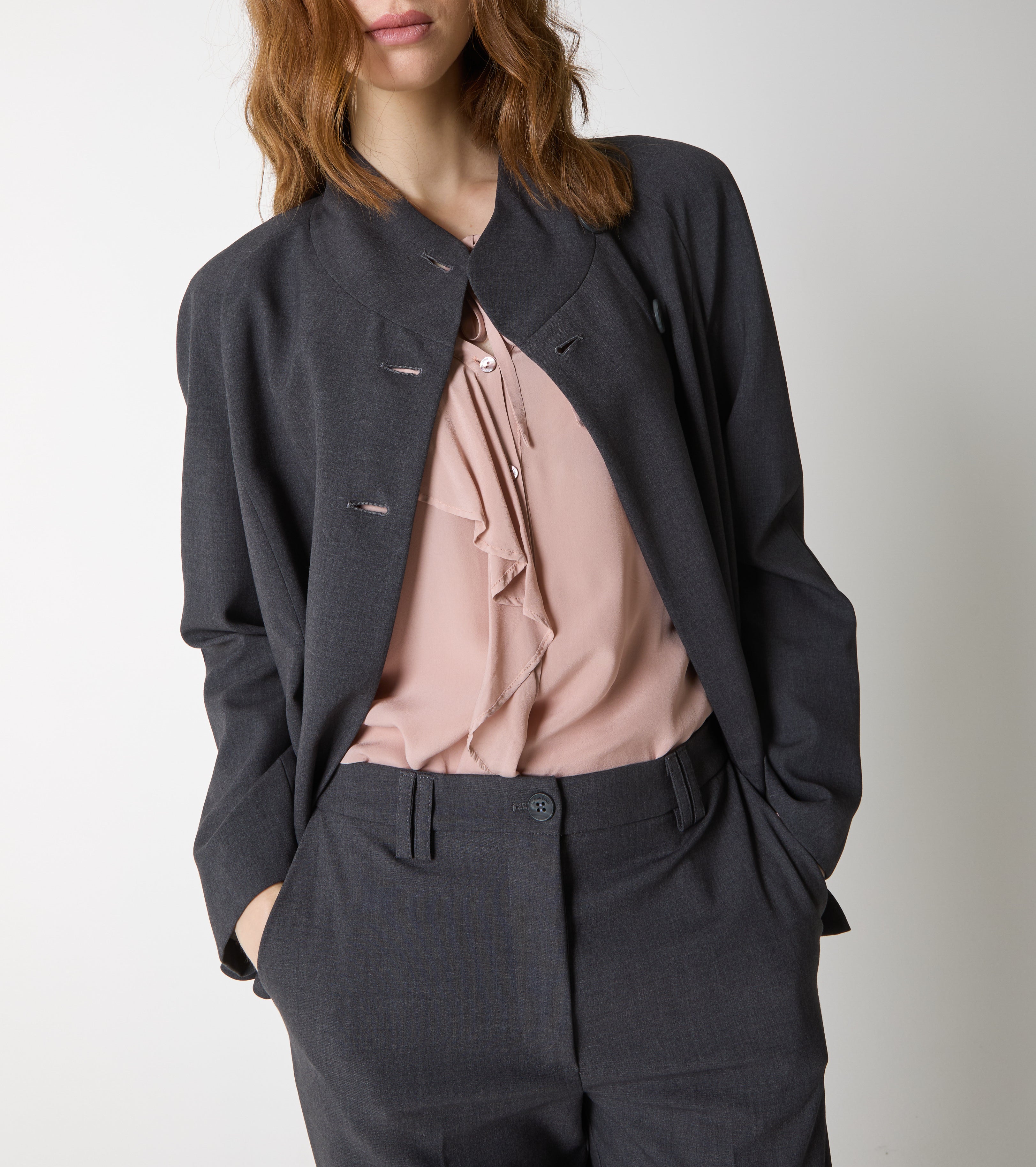 Il modello dalla linea leggermente svasata presenta collo alto, tasche laterali e maniche raglan. Design sartoriale per un look minimal-chic.