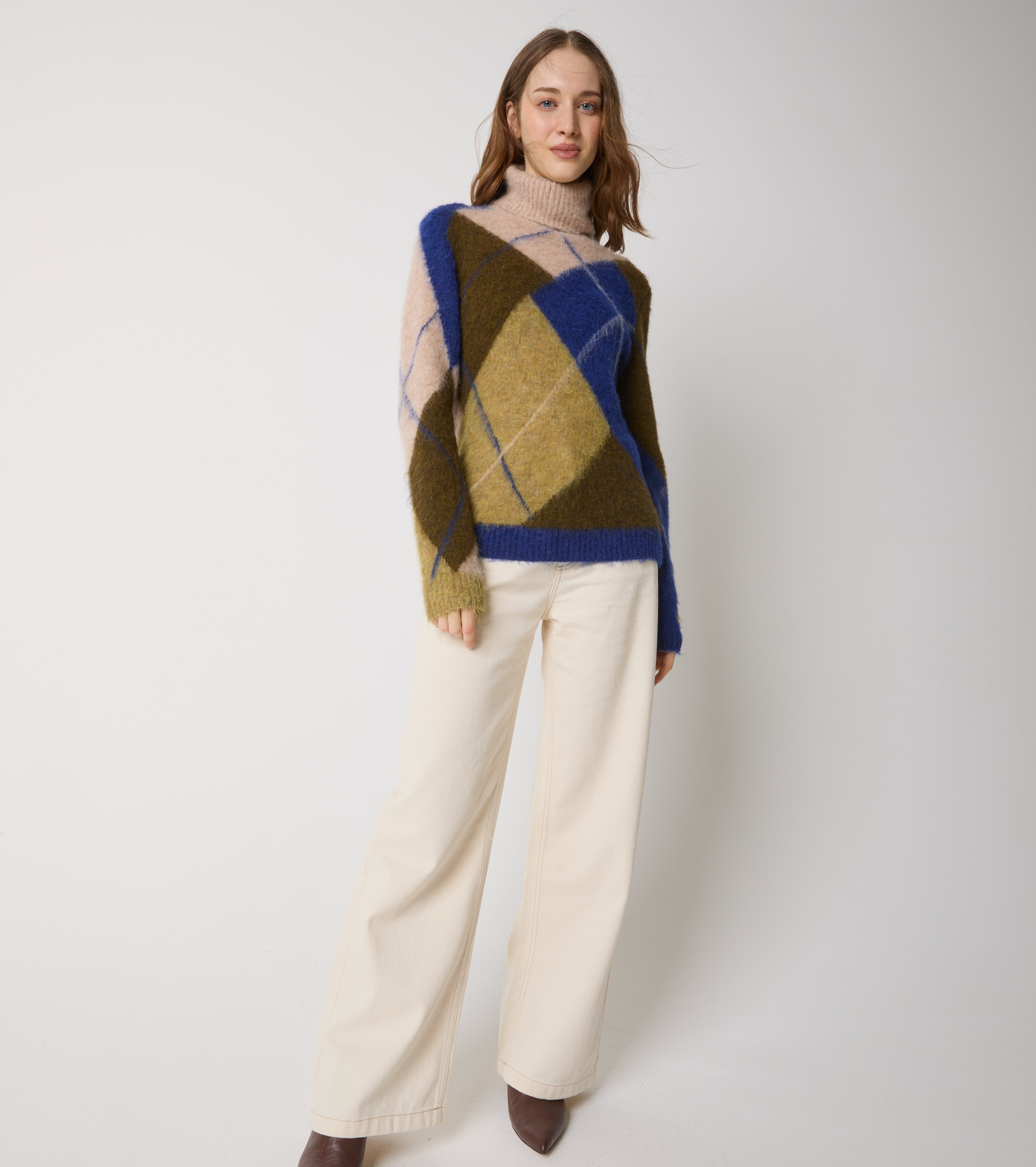 Scegli la maglia realizzata in morbido filato di misto lana e alpaca con maxi motivo a rombi dai toni caldi e vibranti.