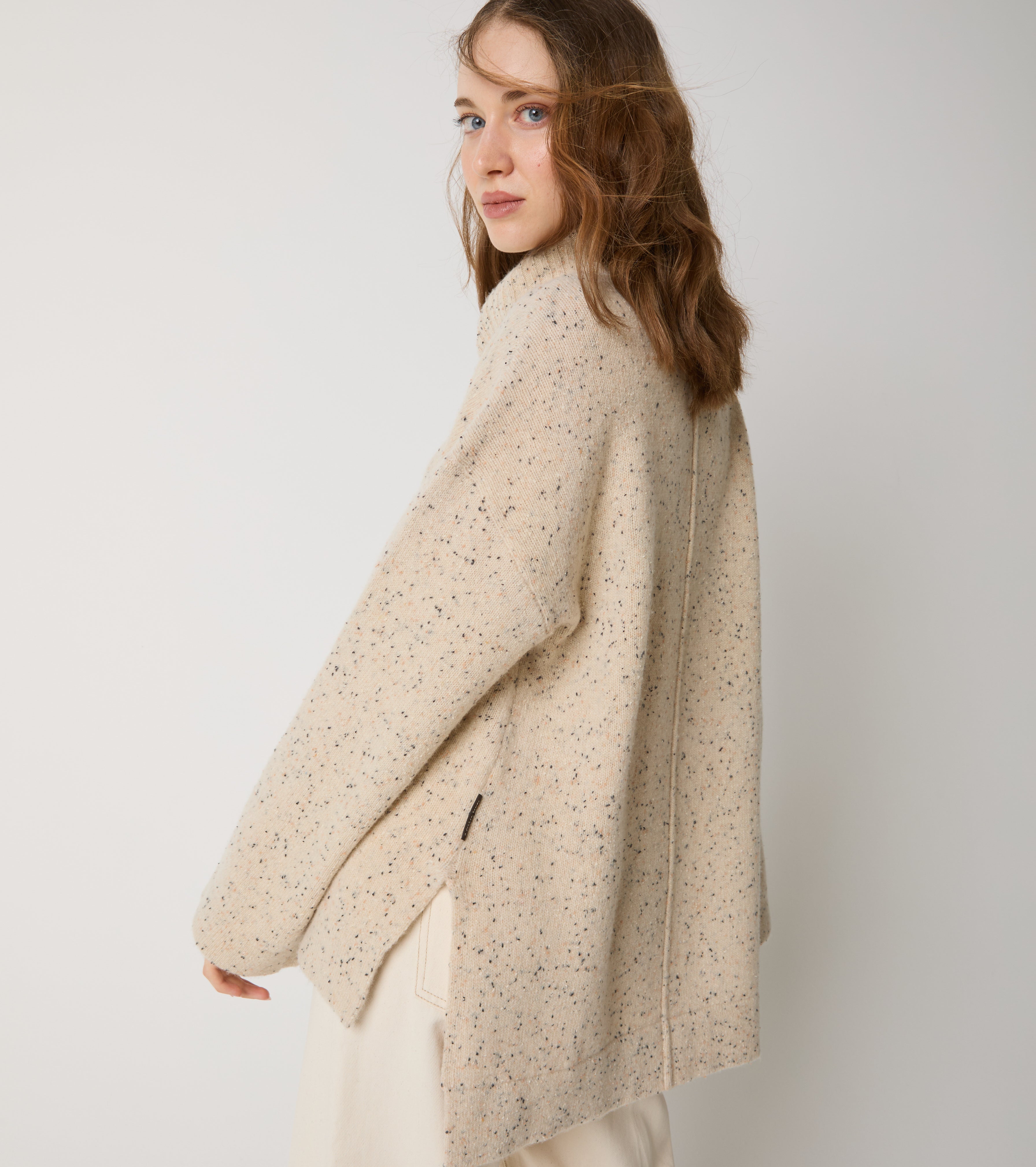 Il modello ha una linea over con collo dolcevita a coste, maniche ampie e spacchi laterali. Per un look cozy-chic contemporaneo dal mood rilassato.