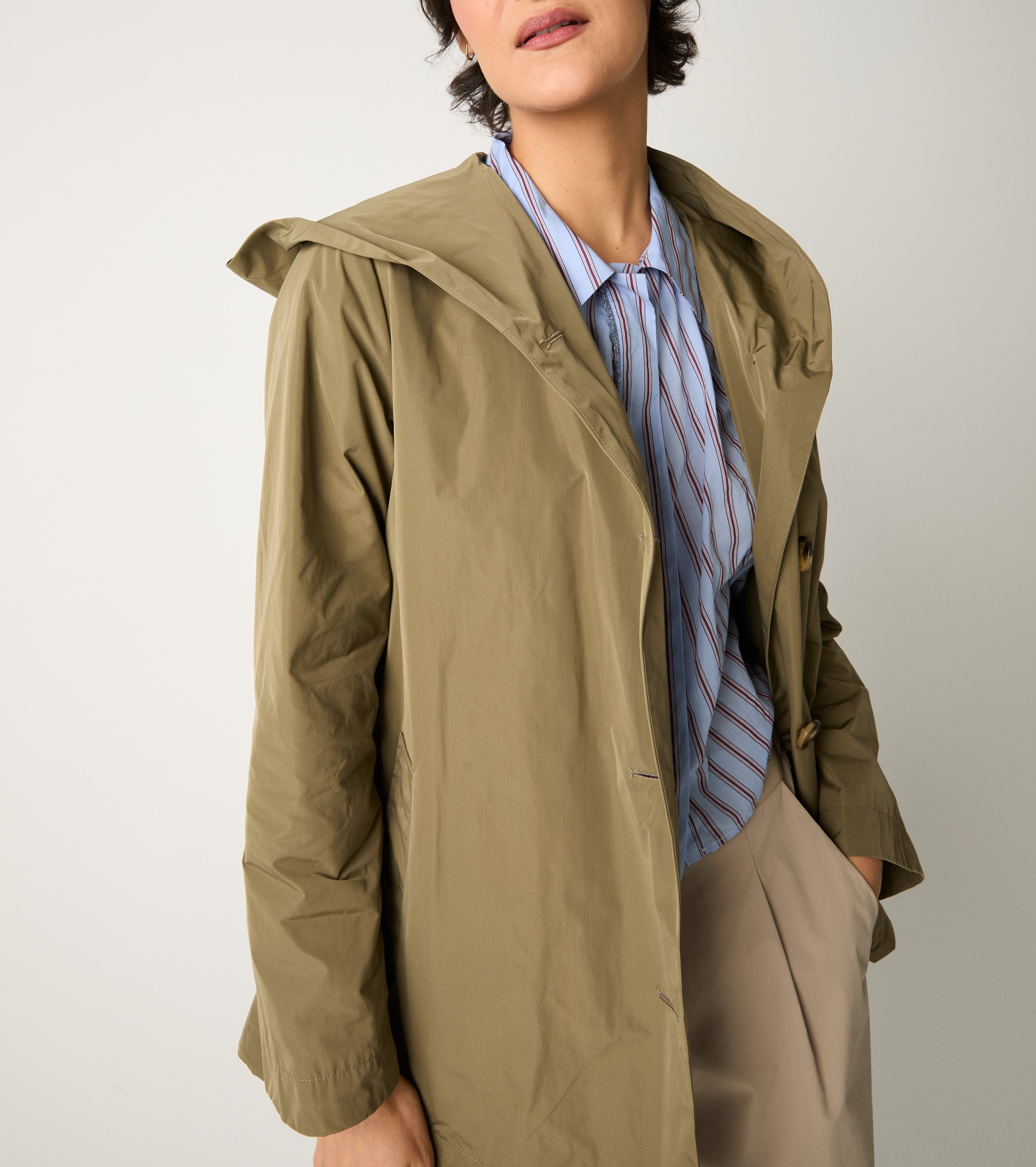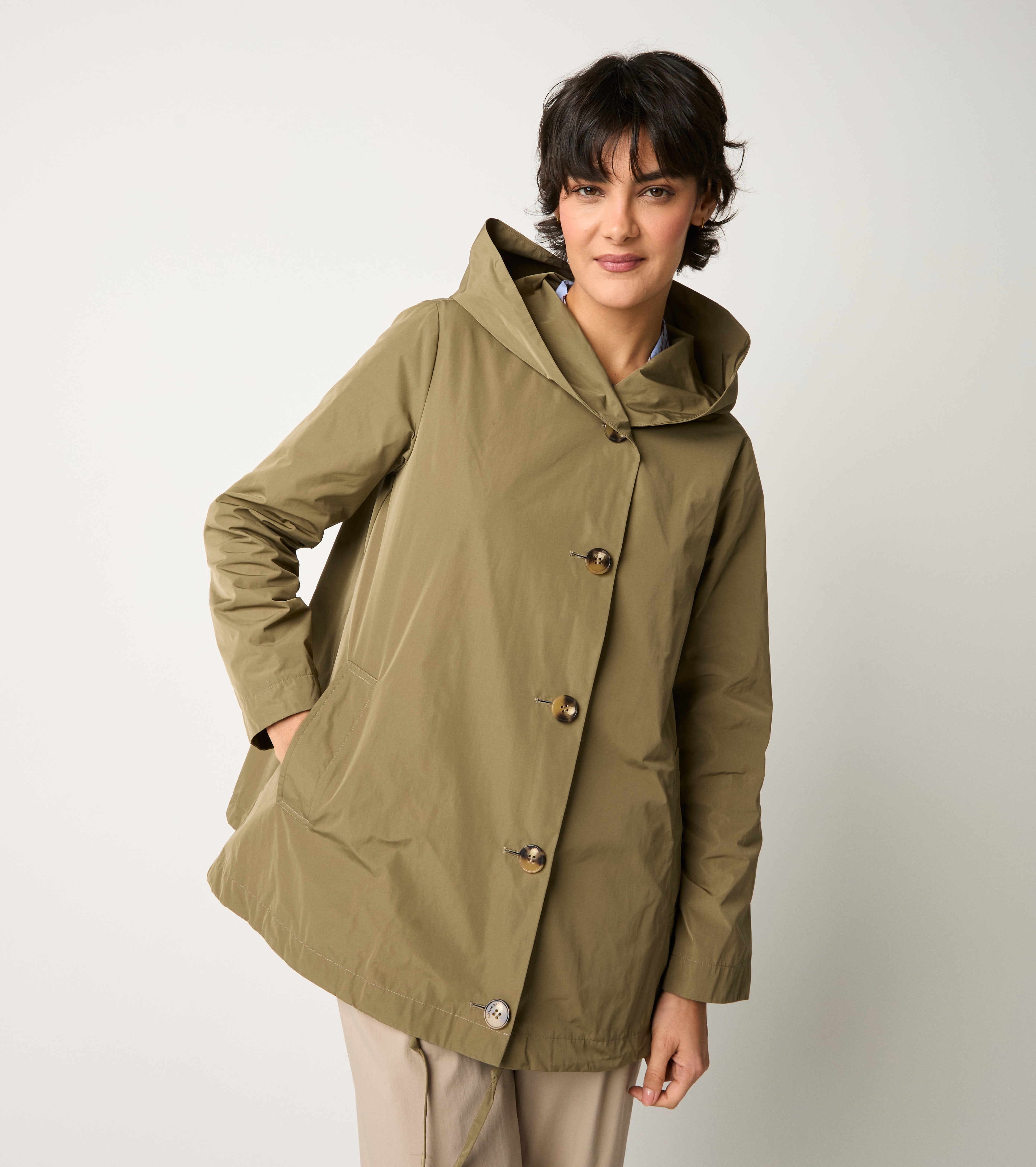 Моделът с разкроена линия има качулка, джобове отстрани и шнур в долната част. За обгръщащ комфорт и изчистен стил, идеален за междинните сезони.