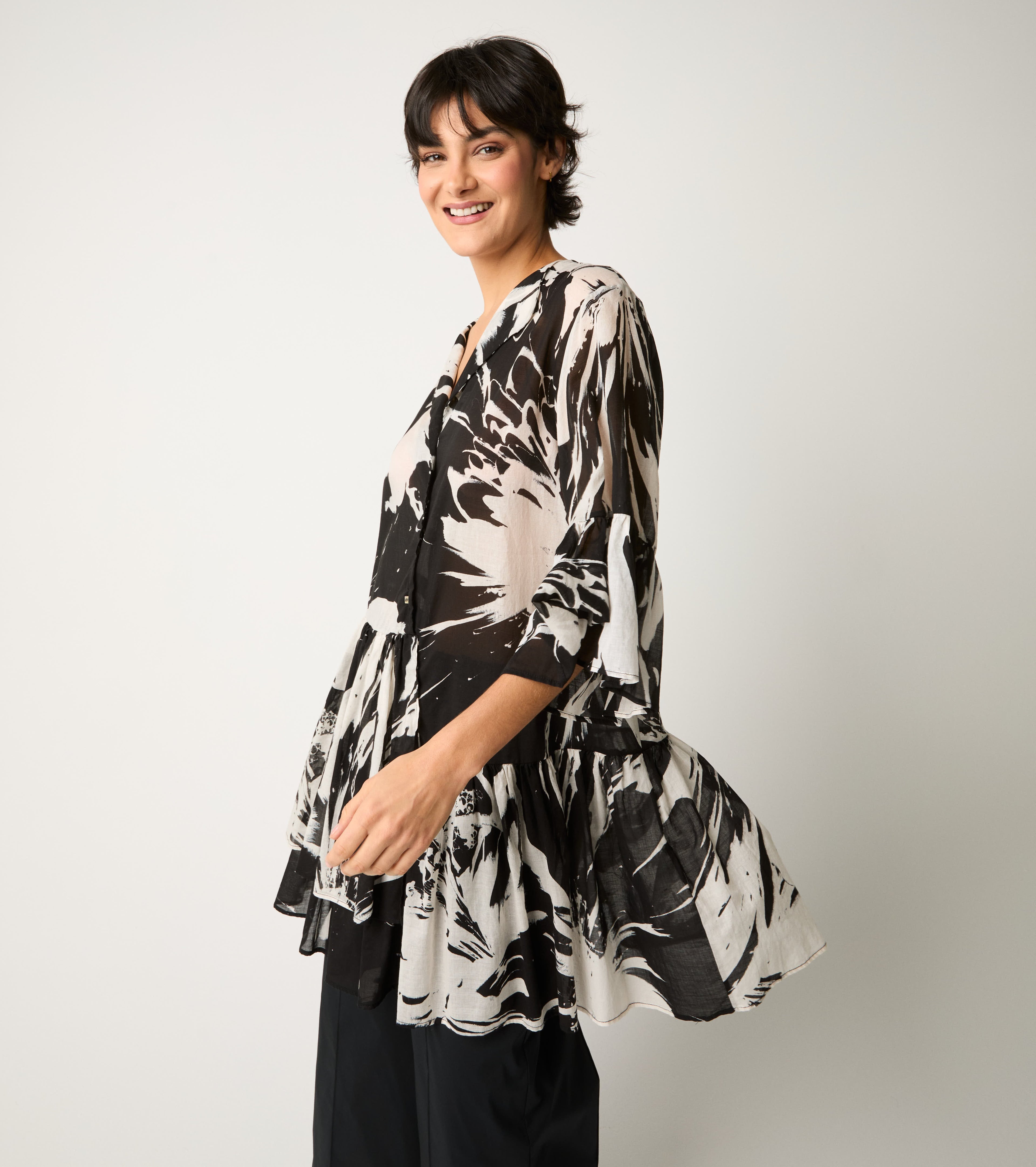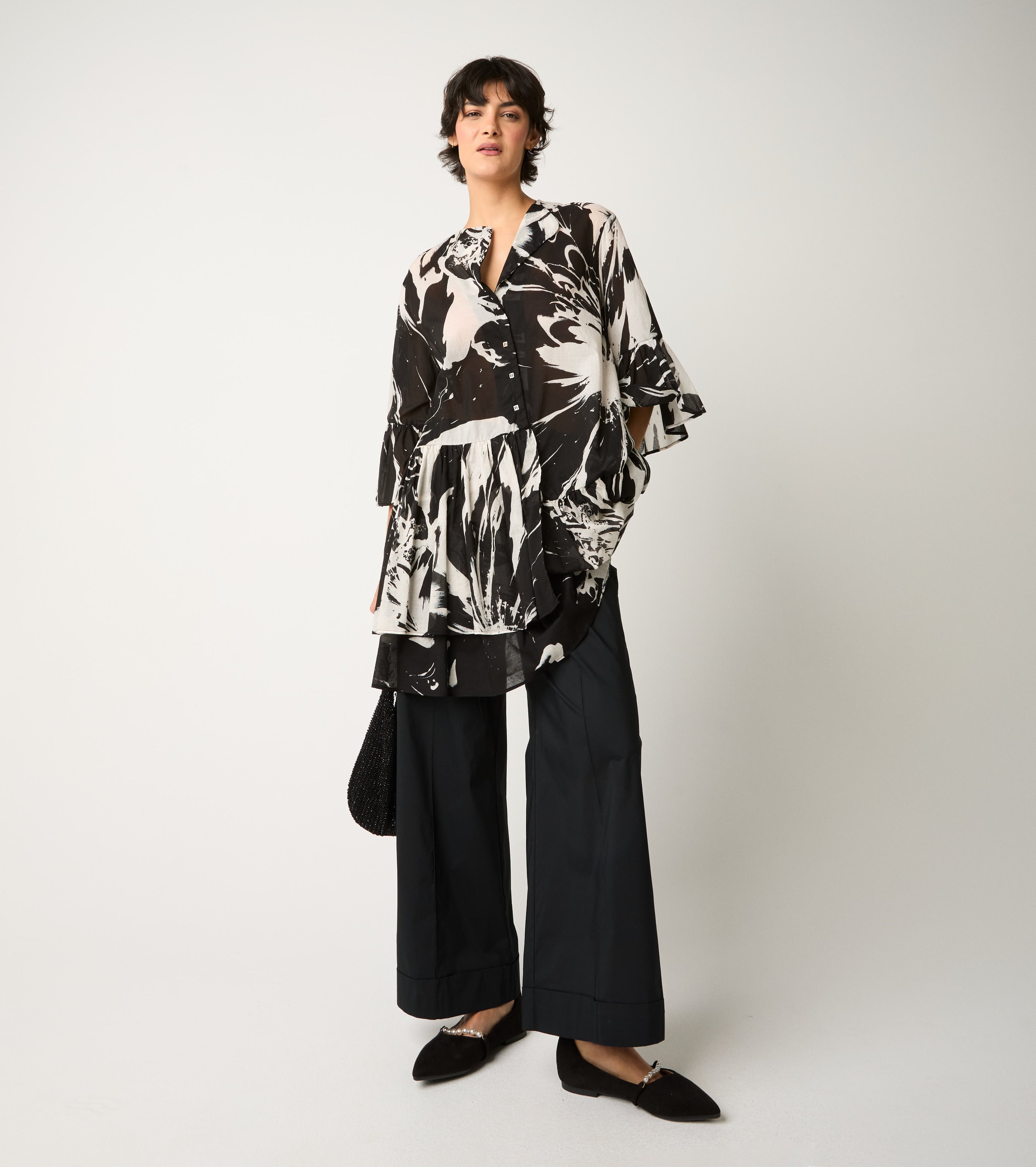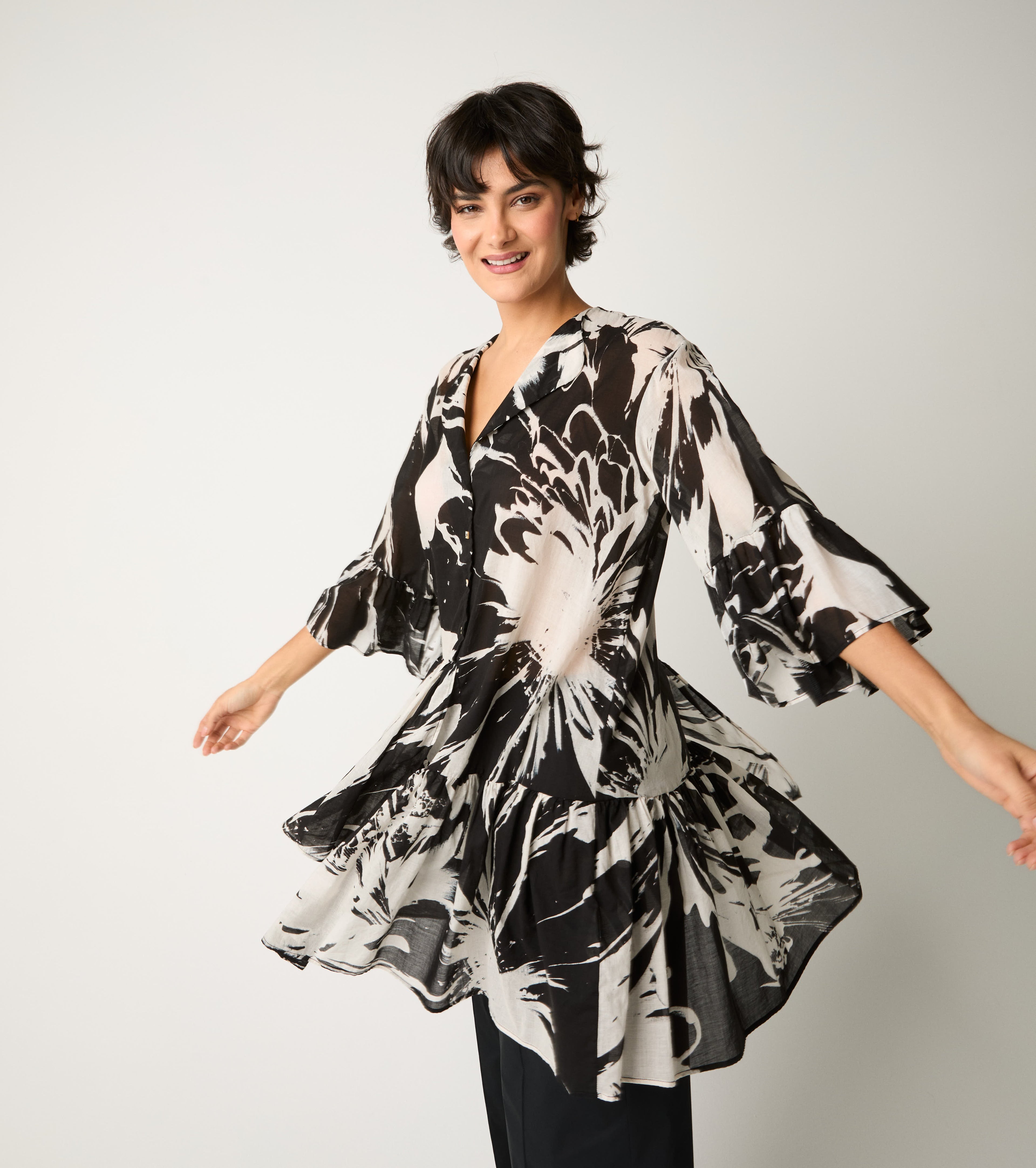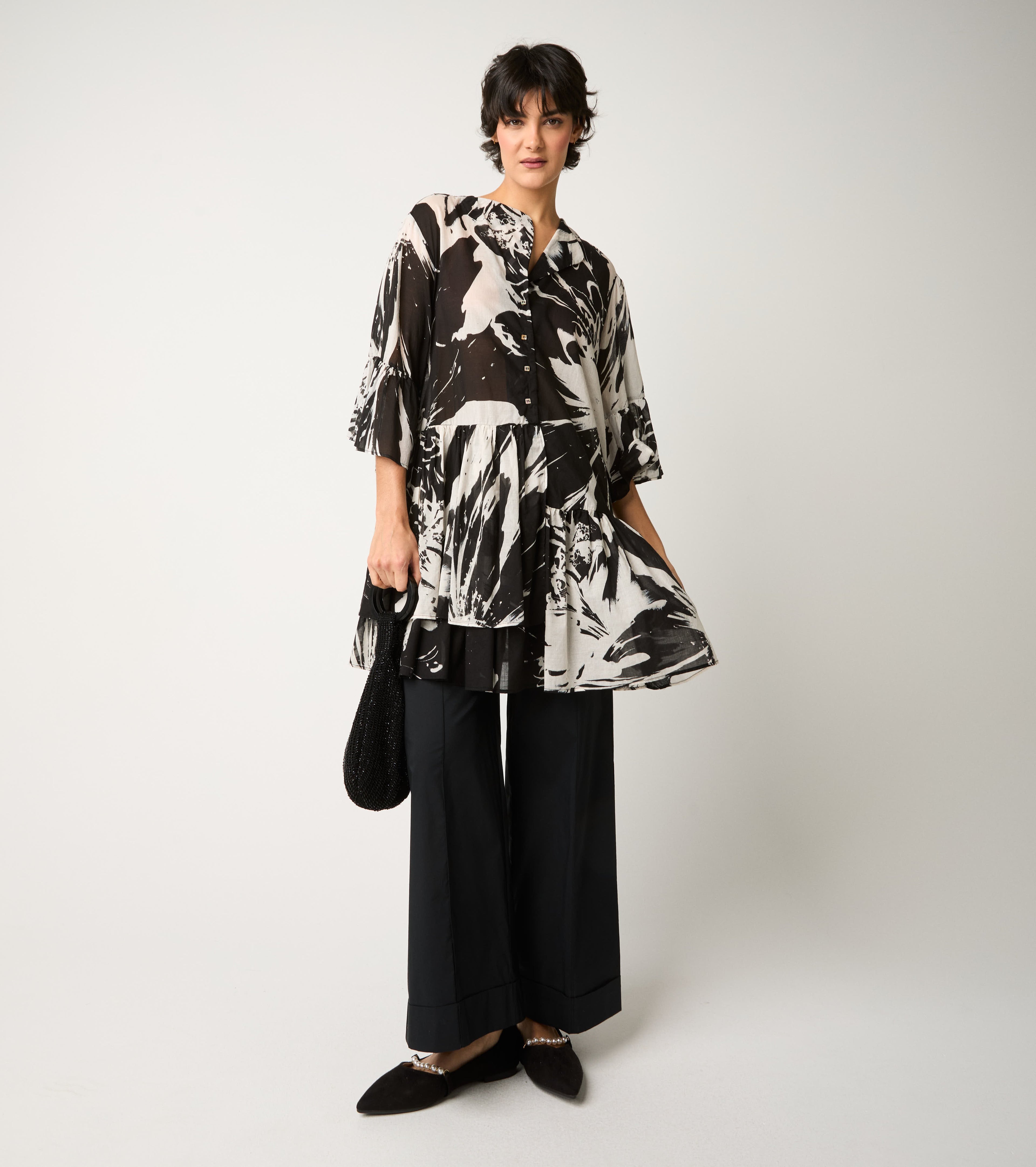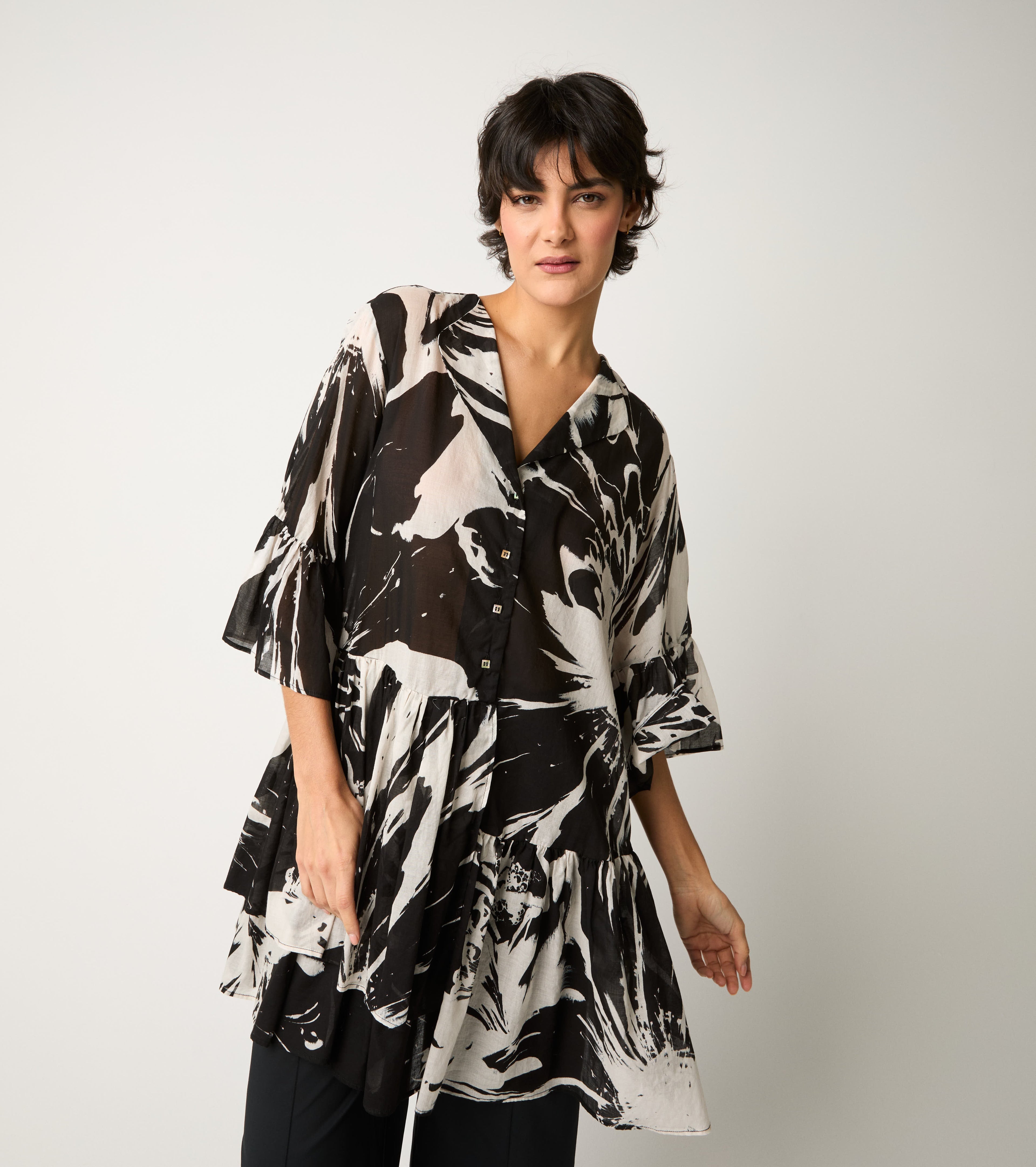 Leggero e fluido, il modello presenta scollo a V con revers, maniche a tre quarti e balza al fondo. Per un look confortevole e disinvolto.