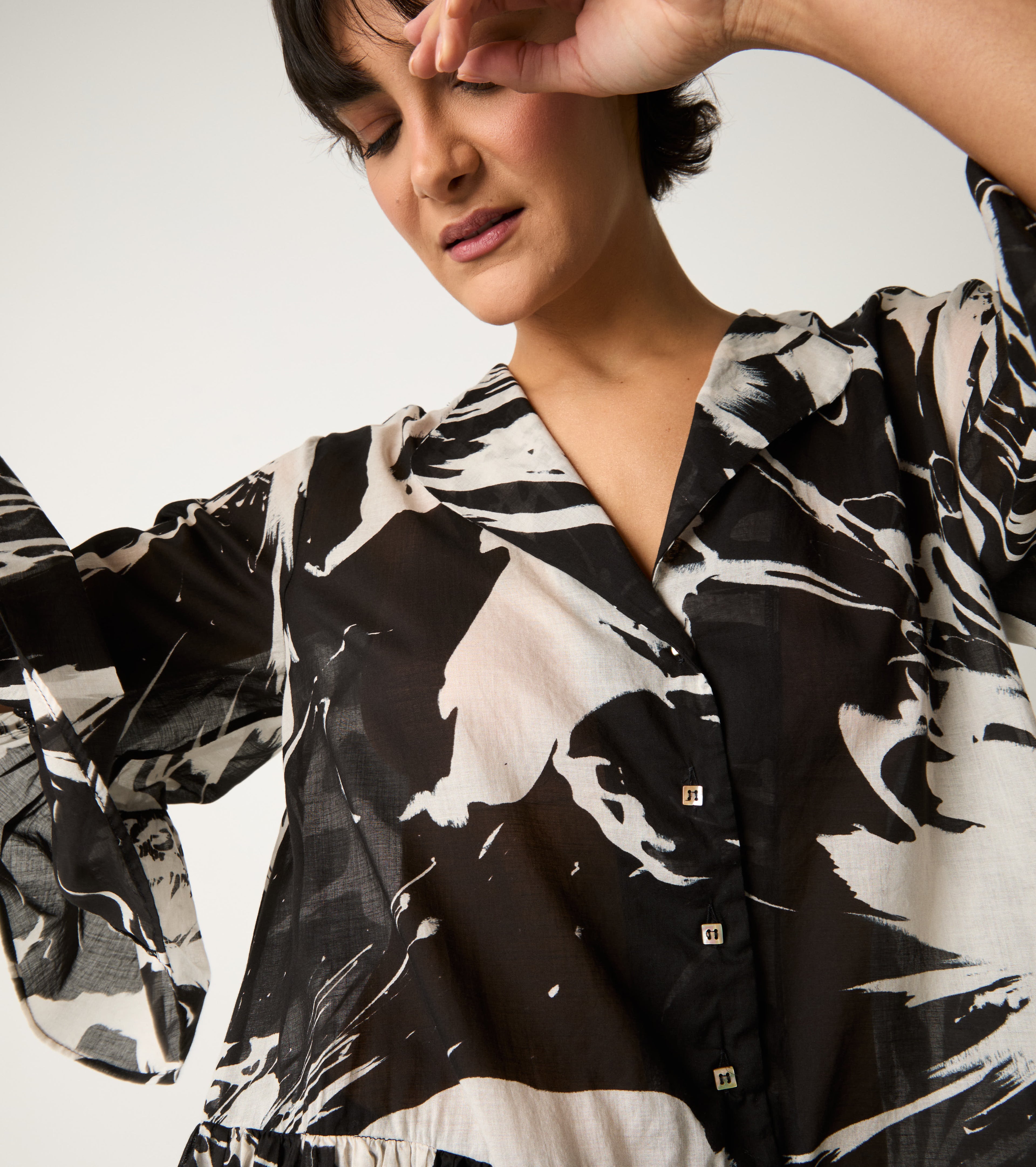 Scegli l'abito corto realizzato in cotone e impreziosito da una vivace stampa astratta.