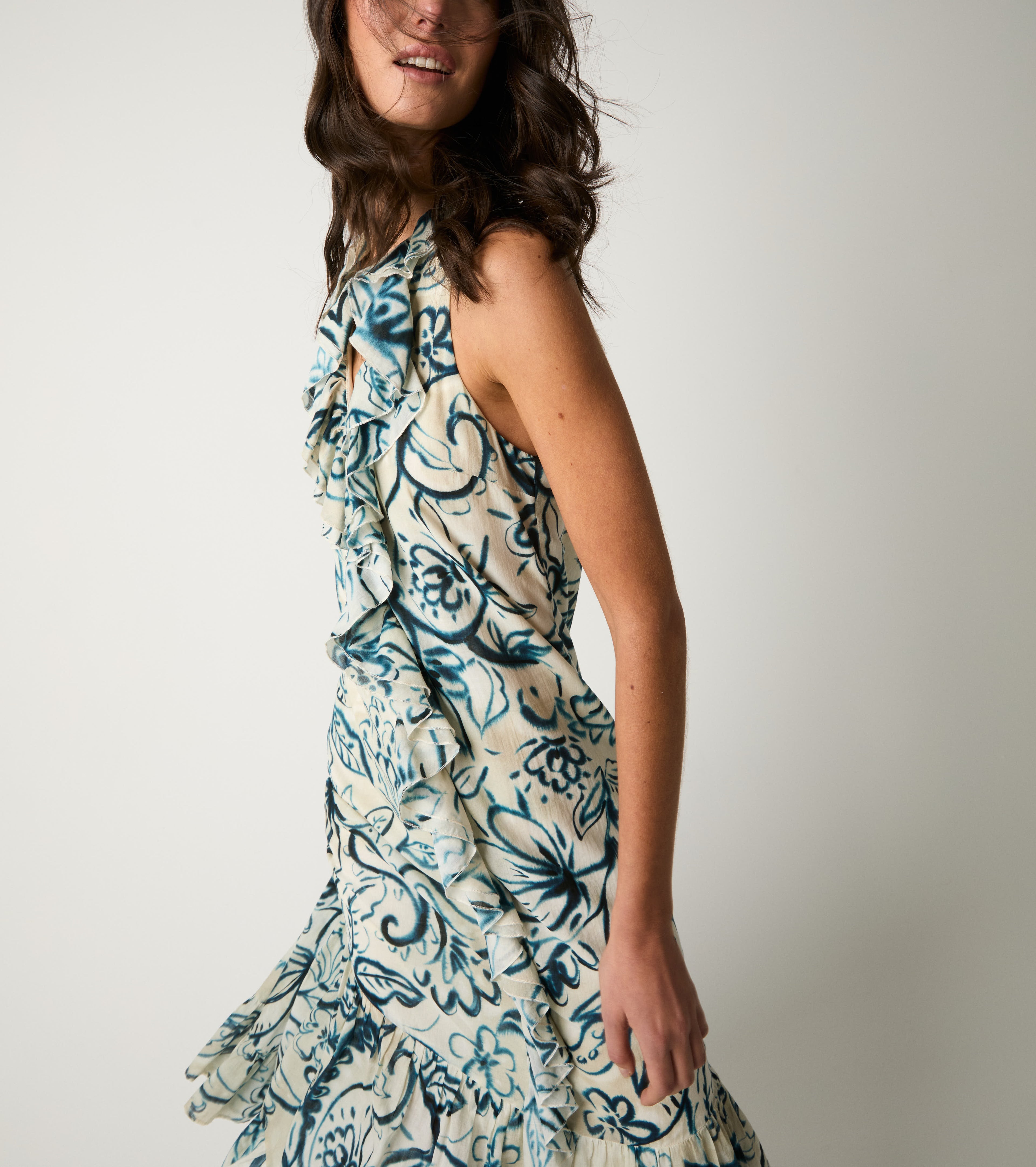 Scegli l'abito lungo realizzato in cotone fresco e leggero, impreziosito da una stampa floreale all over.