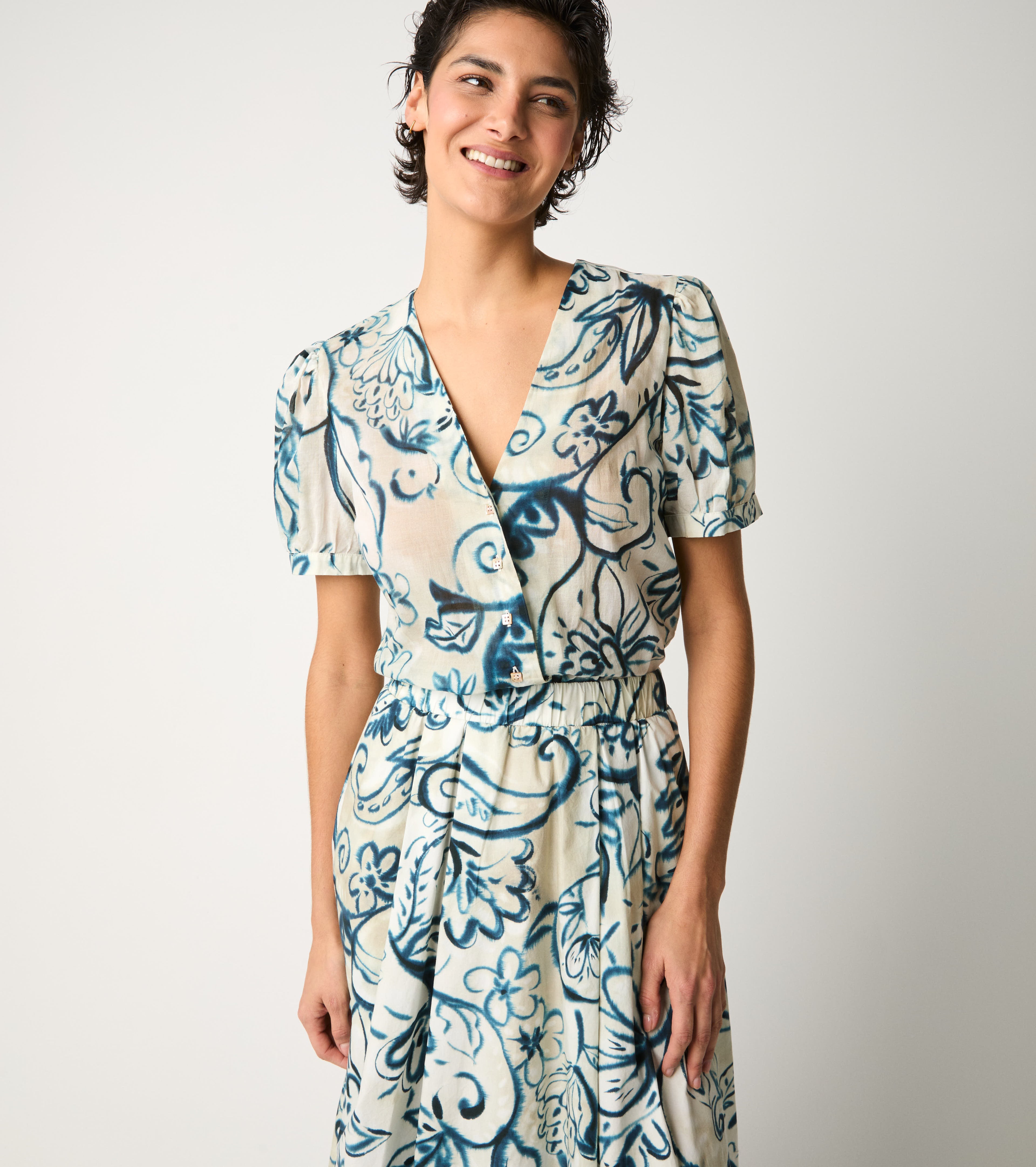 Il modello dal design leggero e fluido presenta scollo a V, maniche corte ed elastico in vita che esalta la silhouette.