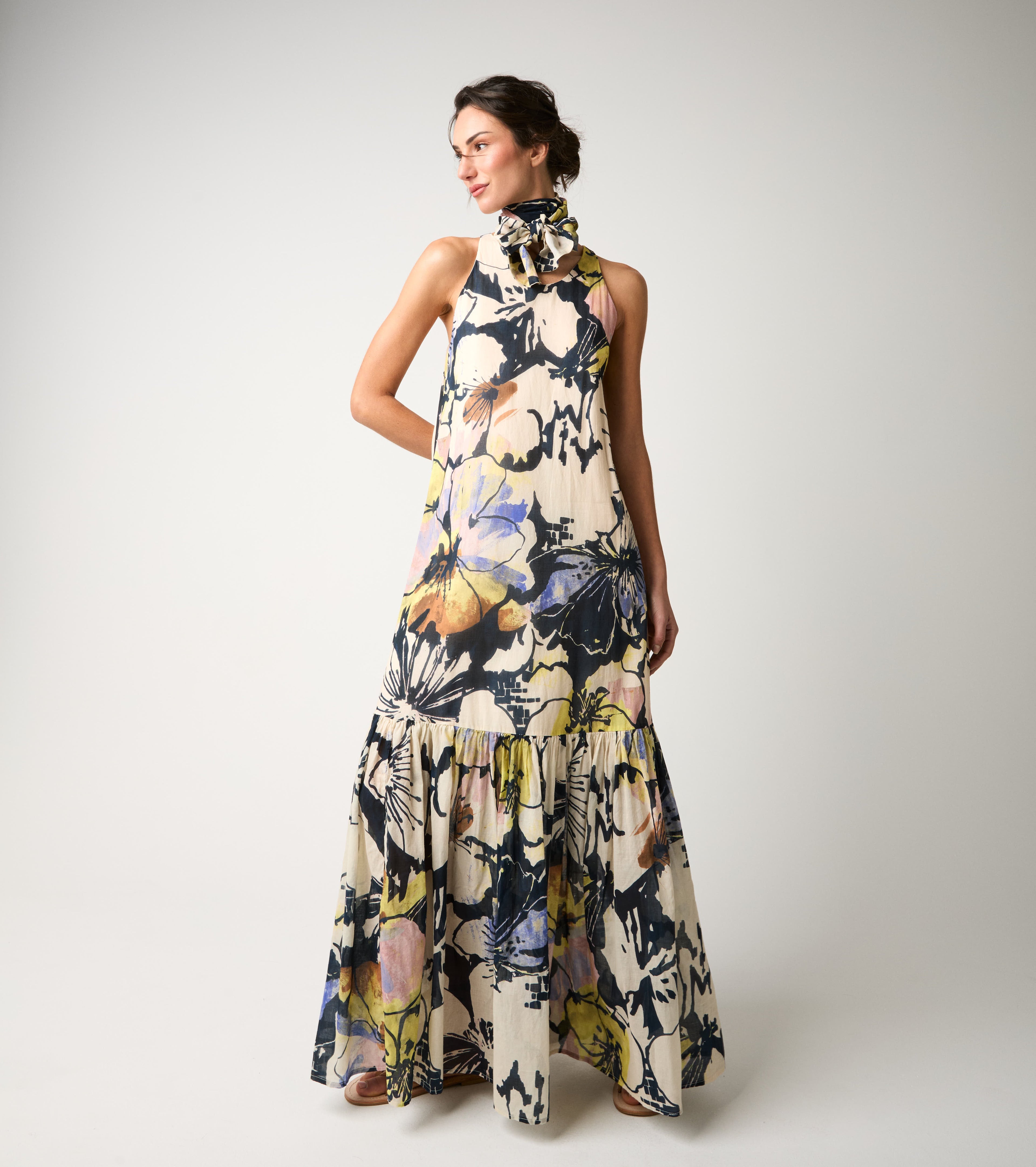 Scegli l'abito lungo realizzato in cotone fresco e leggero, impreziosito da una stampa floreale all over.