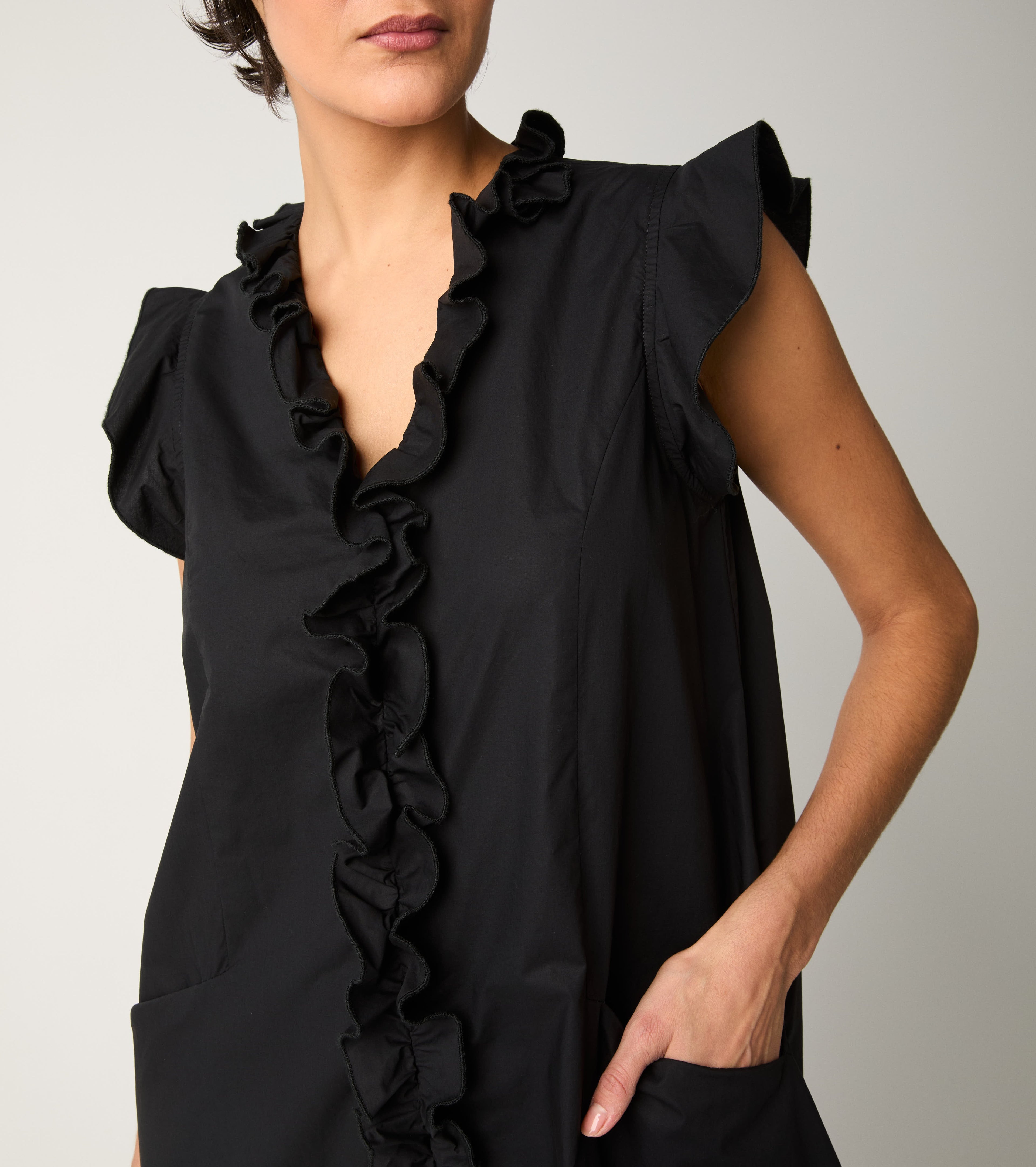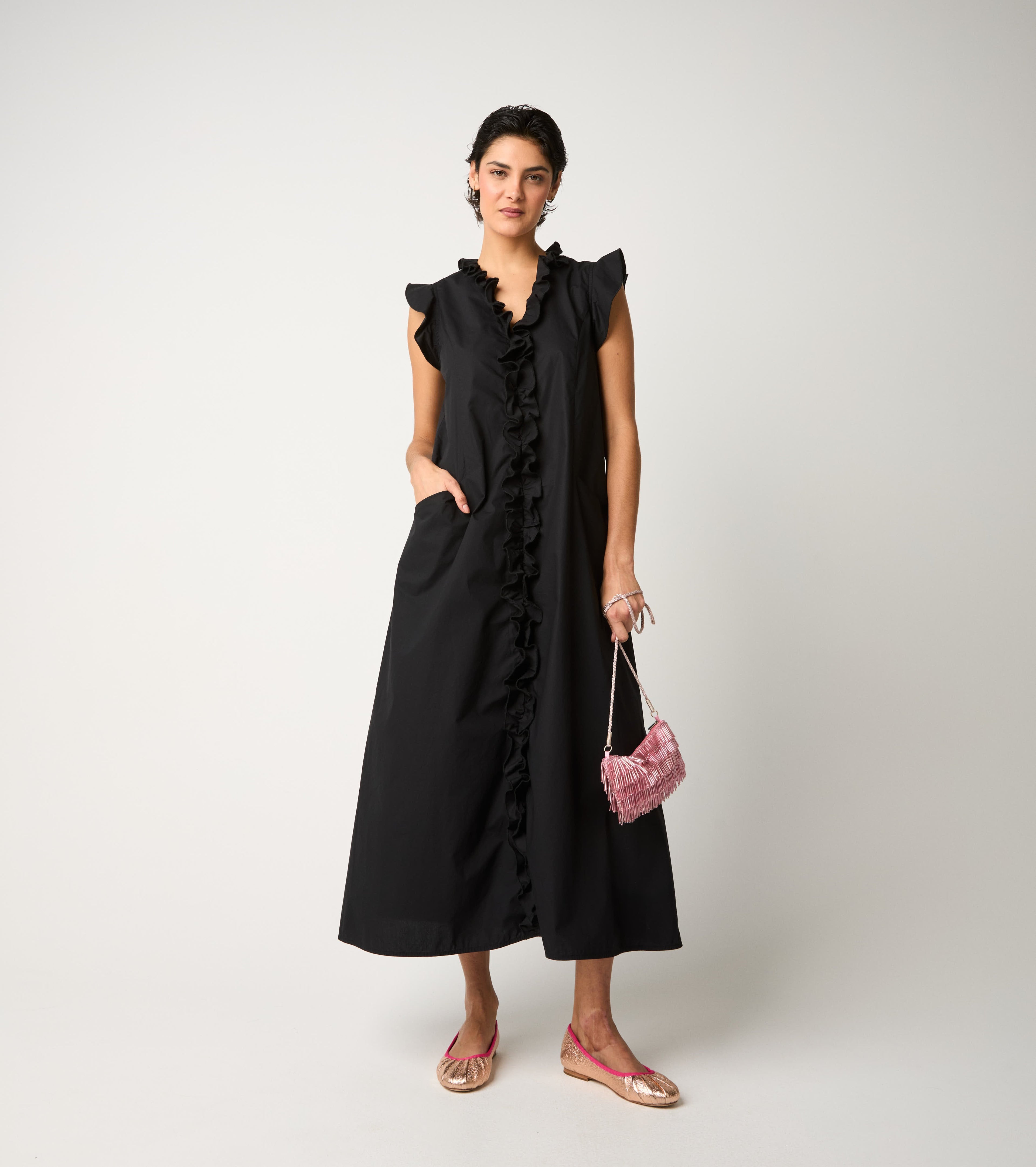 Il modello presenta scollo a V, tasche sui fianchi e romantiche rouches. Per un’eleganza femminile e sofisticata che scivola sul corpo con naturale grazia.