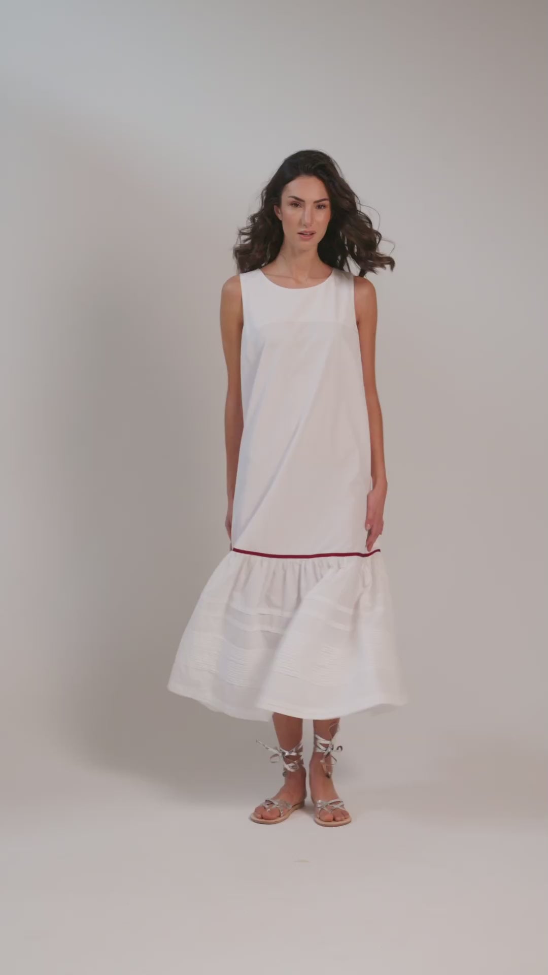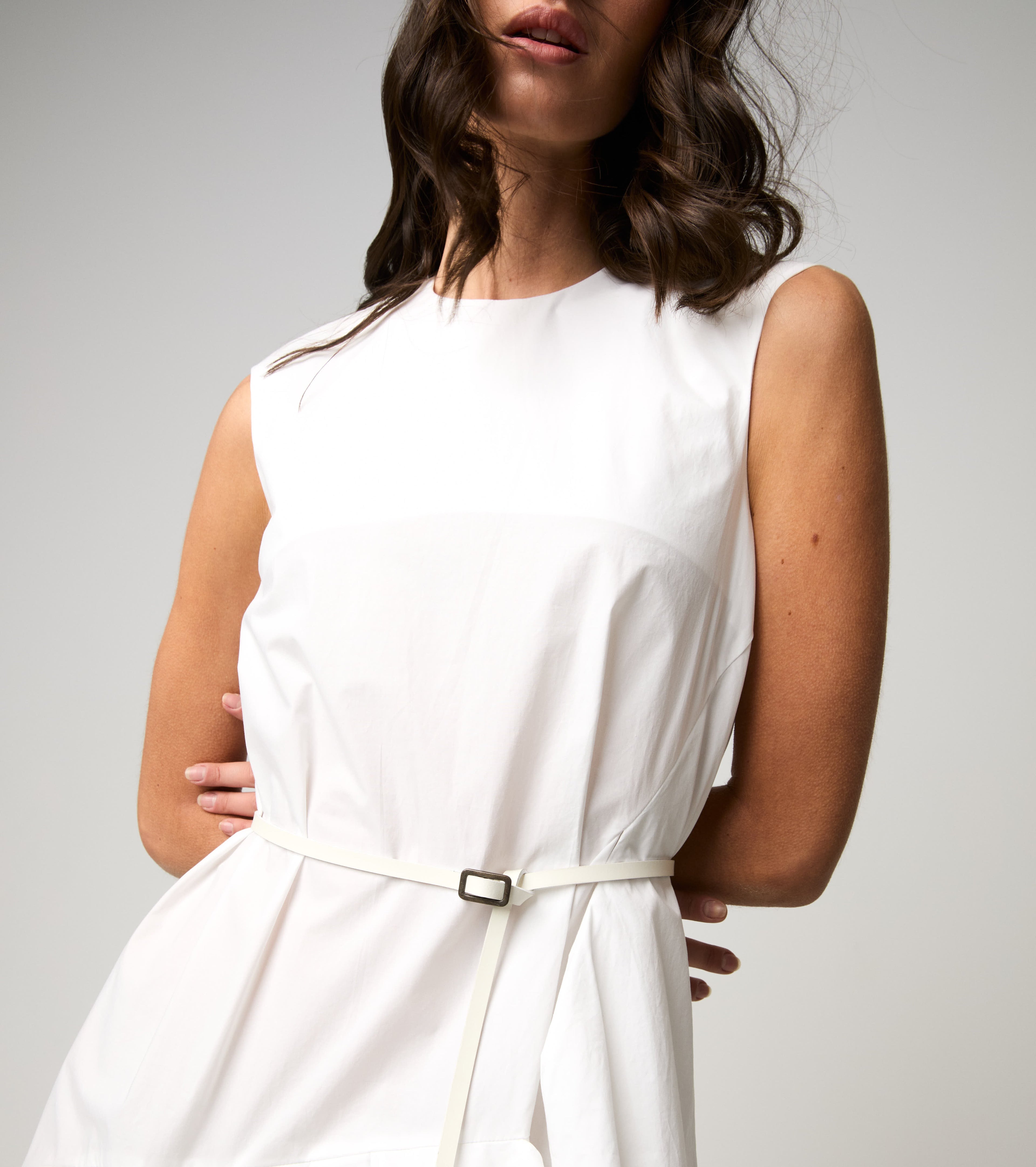 In una perfetta sintesi di comfort e leggerezza, il modello presenta collo a giro e drappeggi asimmetrici sul davanti.