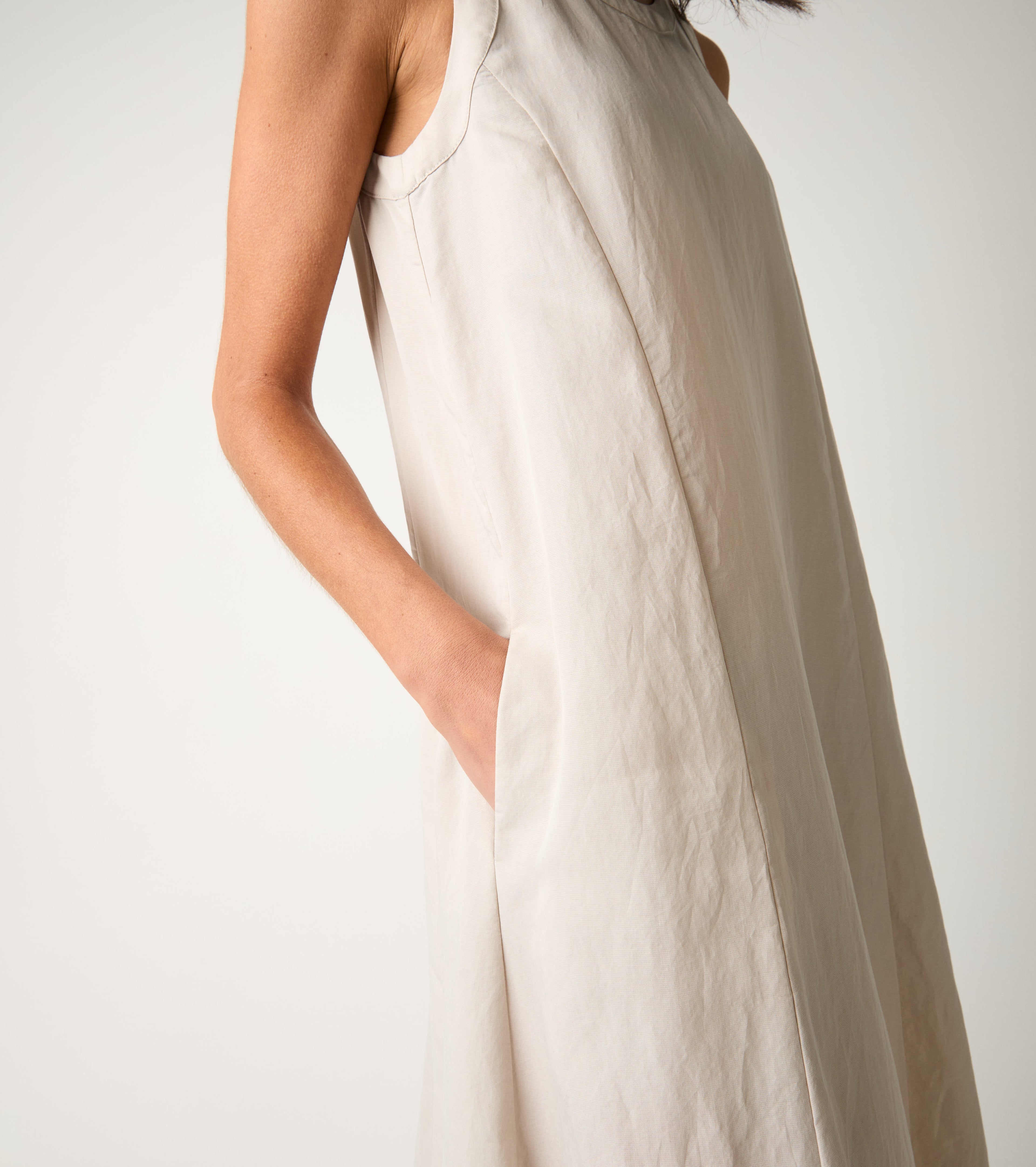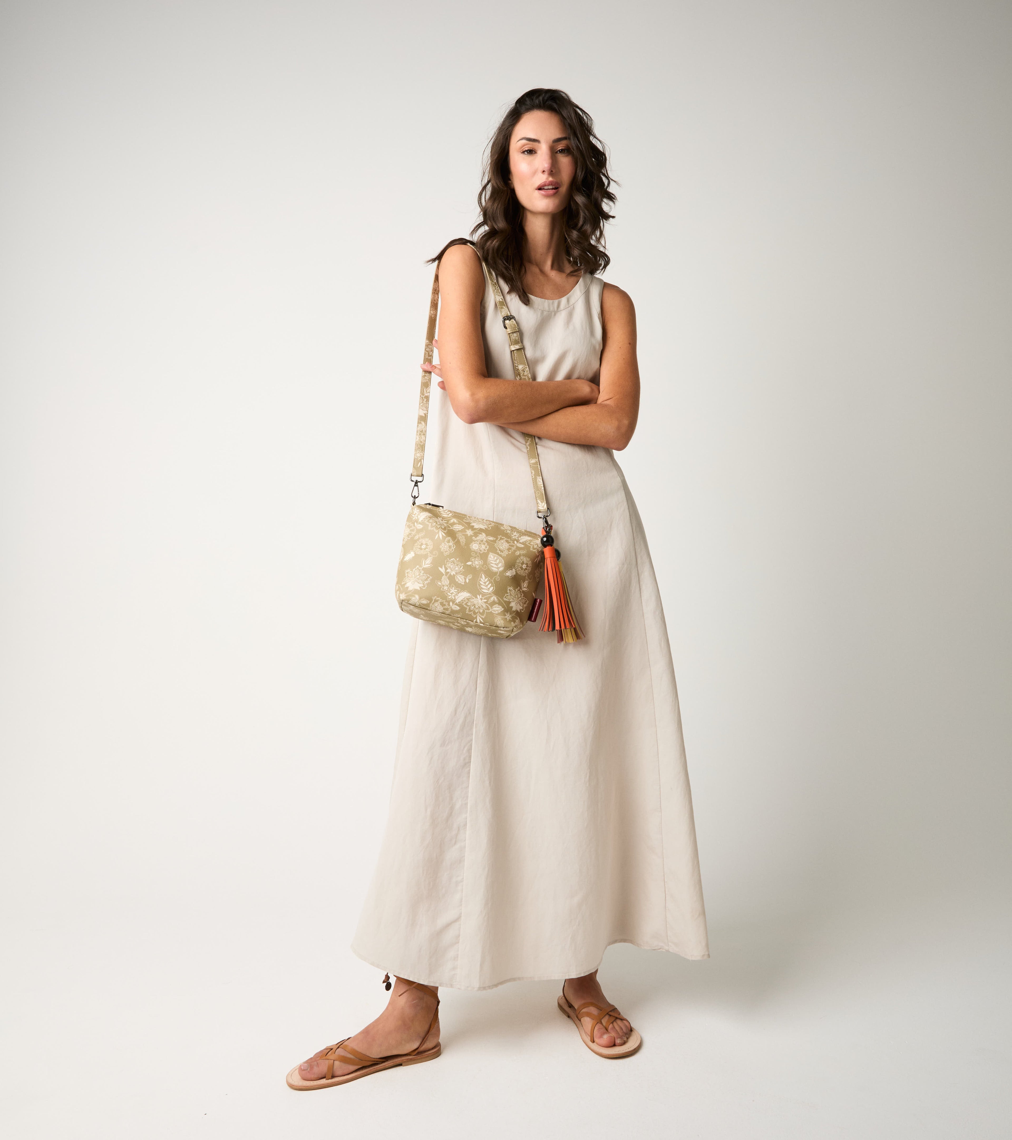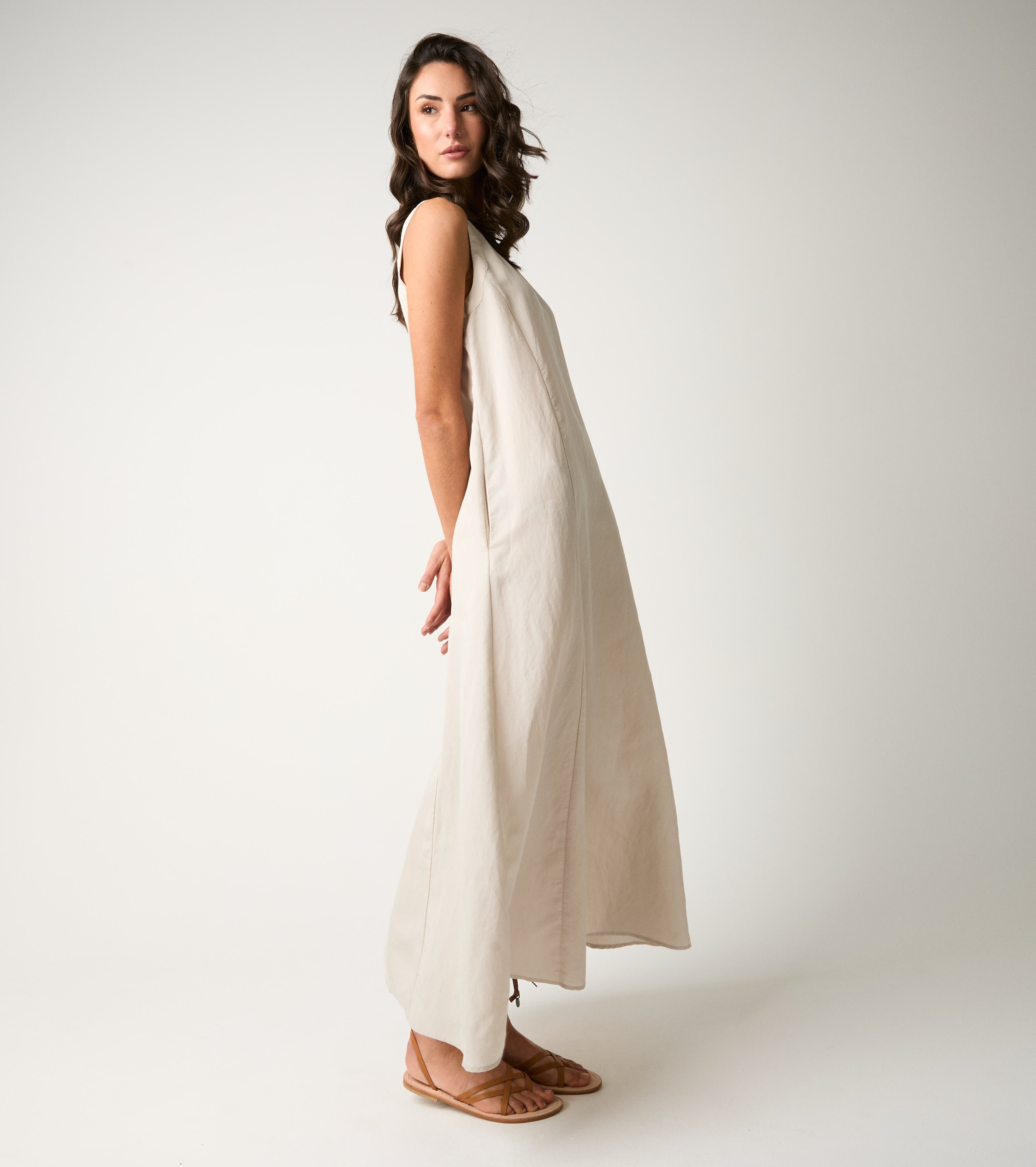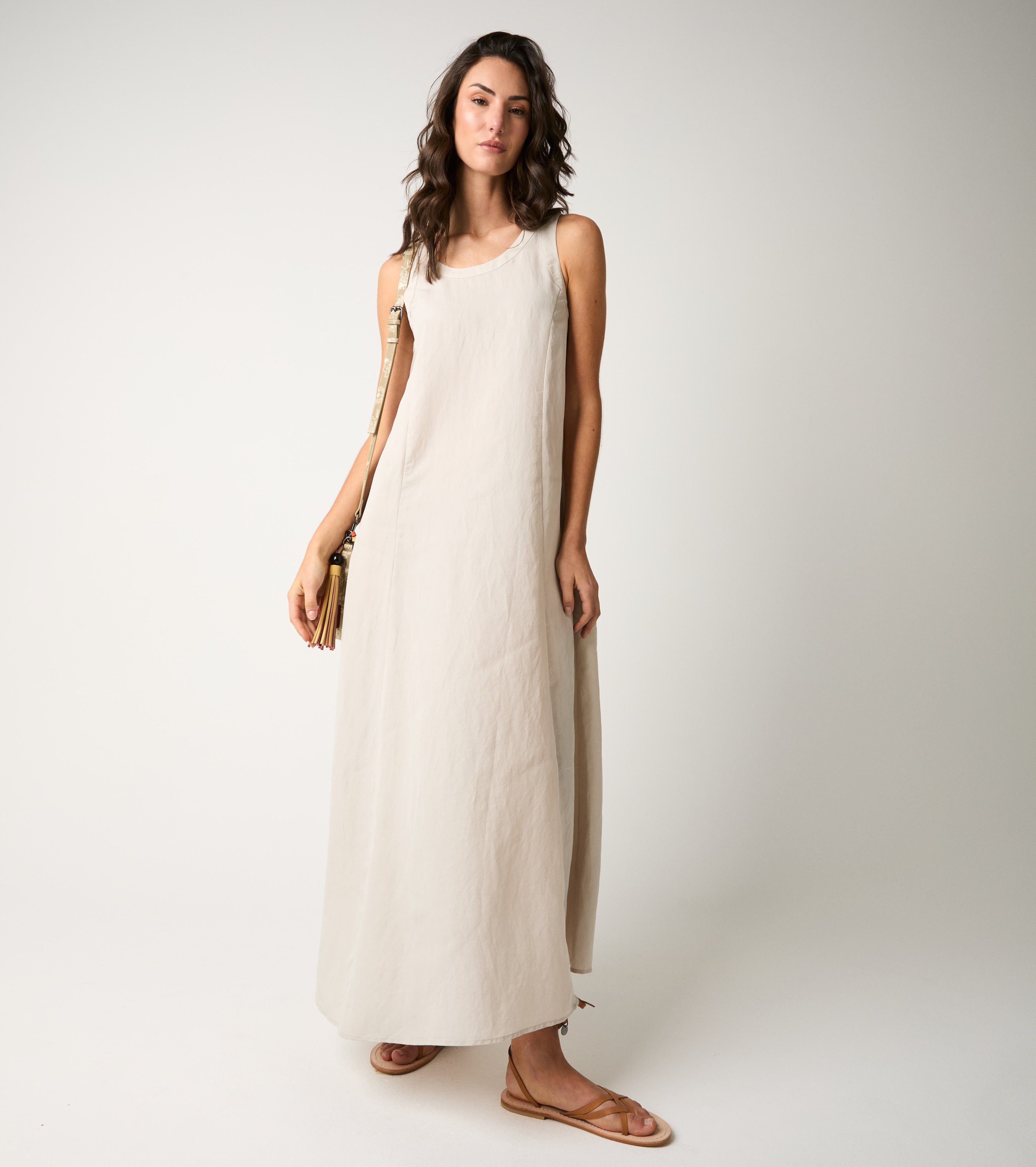Con linee essenziali e nuance delicate, questo abito lungo si abbina perfettamente alla borsa shopping e ai sandali flat per un look minimal, raffinato e senza tempo.