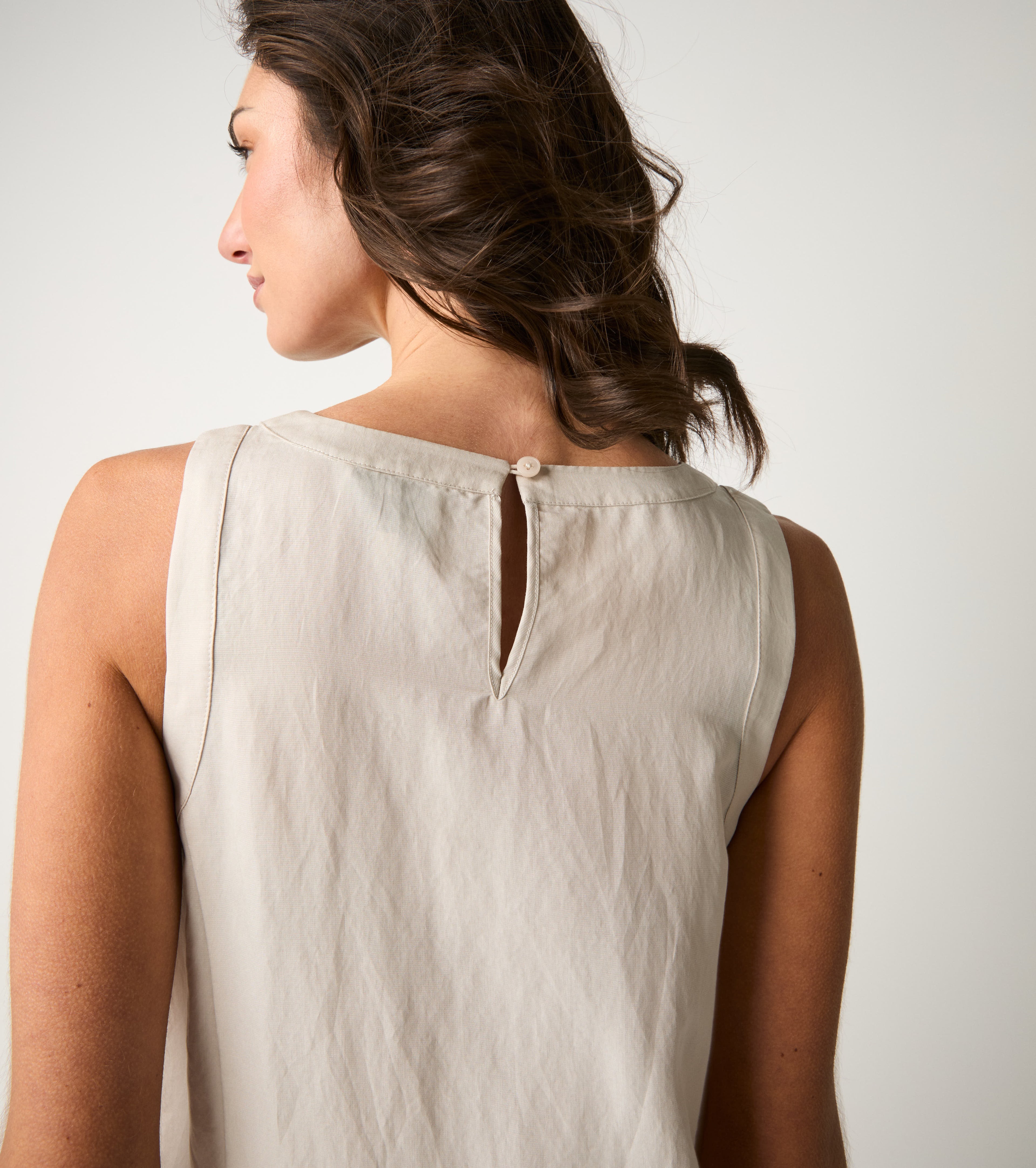 Il modello dalla linea svasata presenta scollo rotondo e dettagli minimal per una femminilità raffinata.