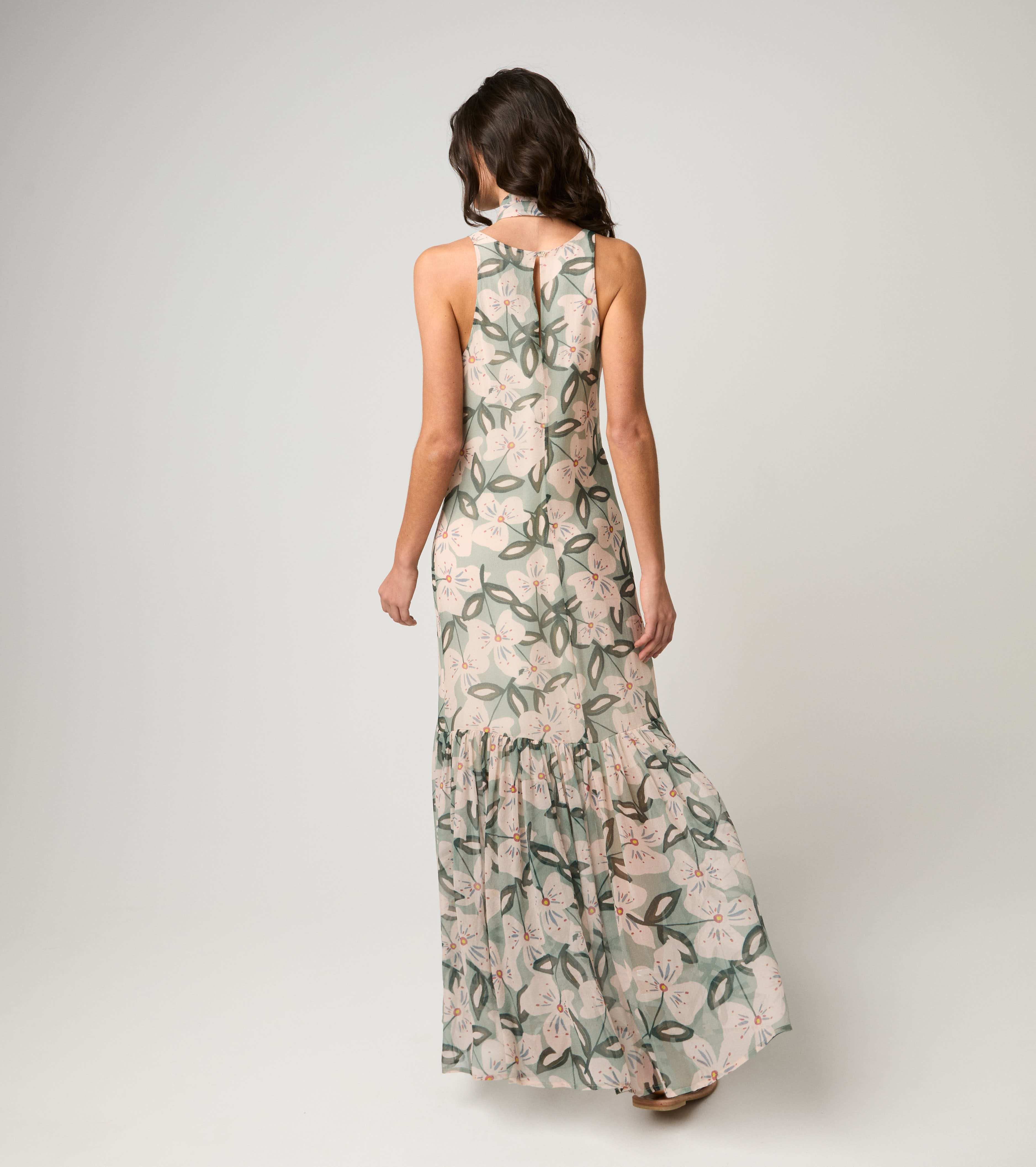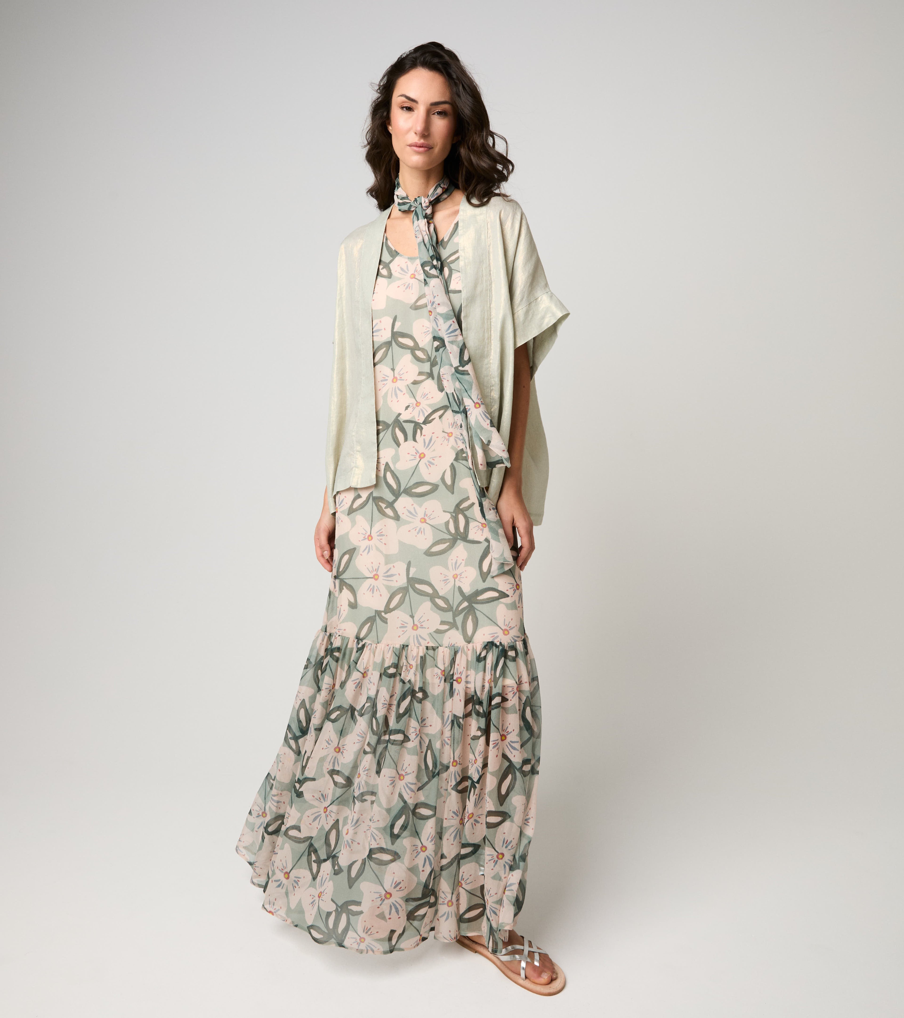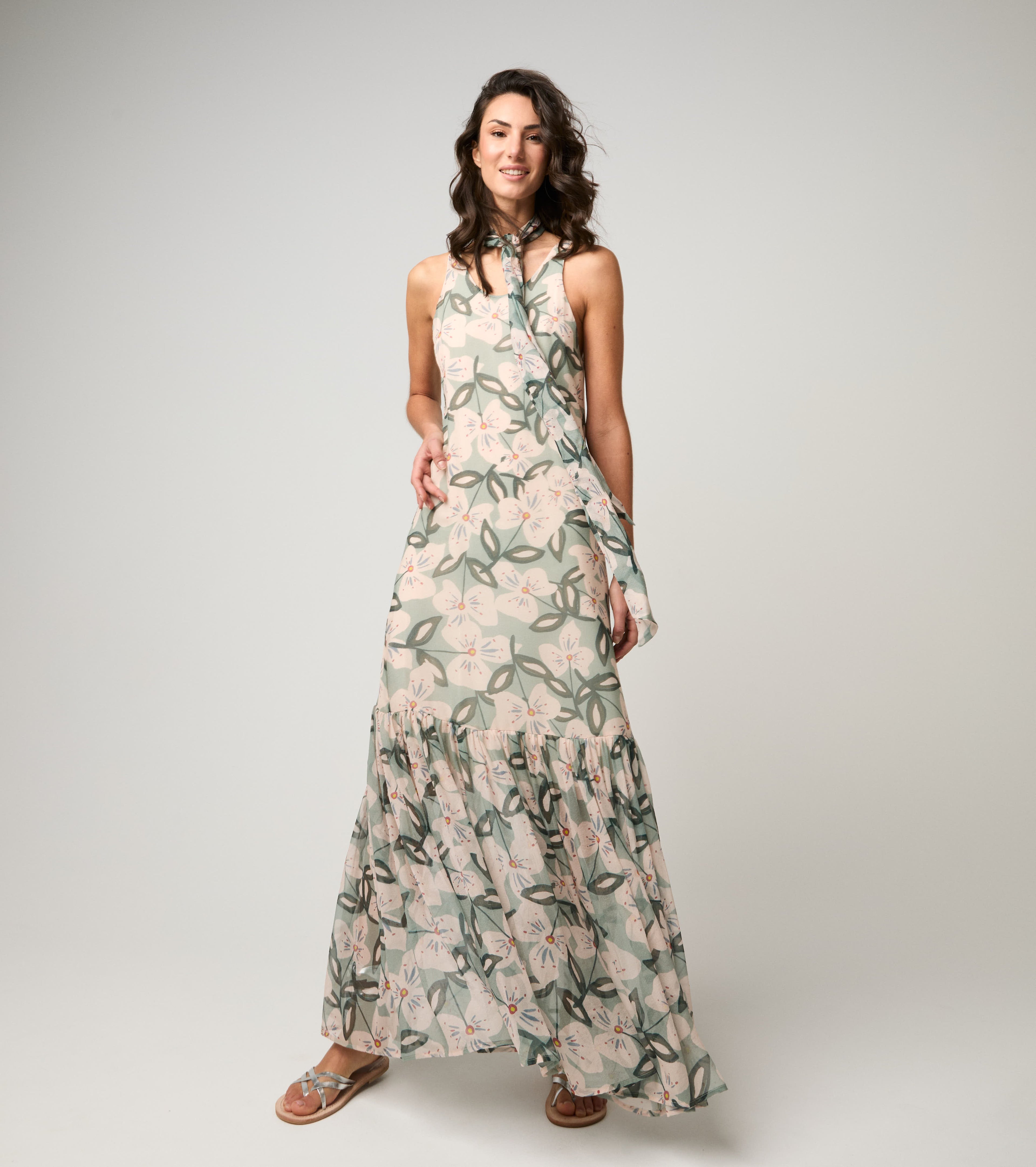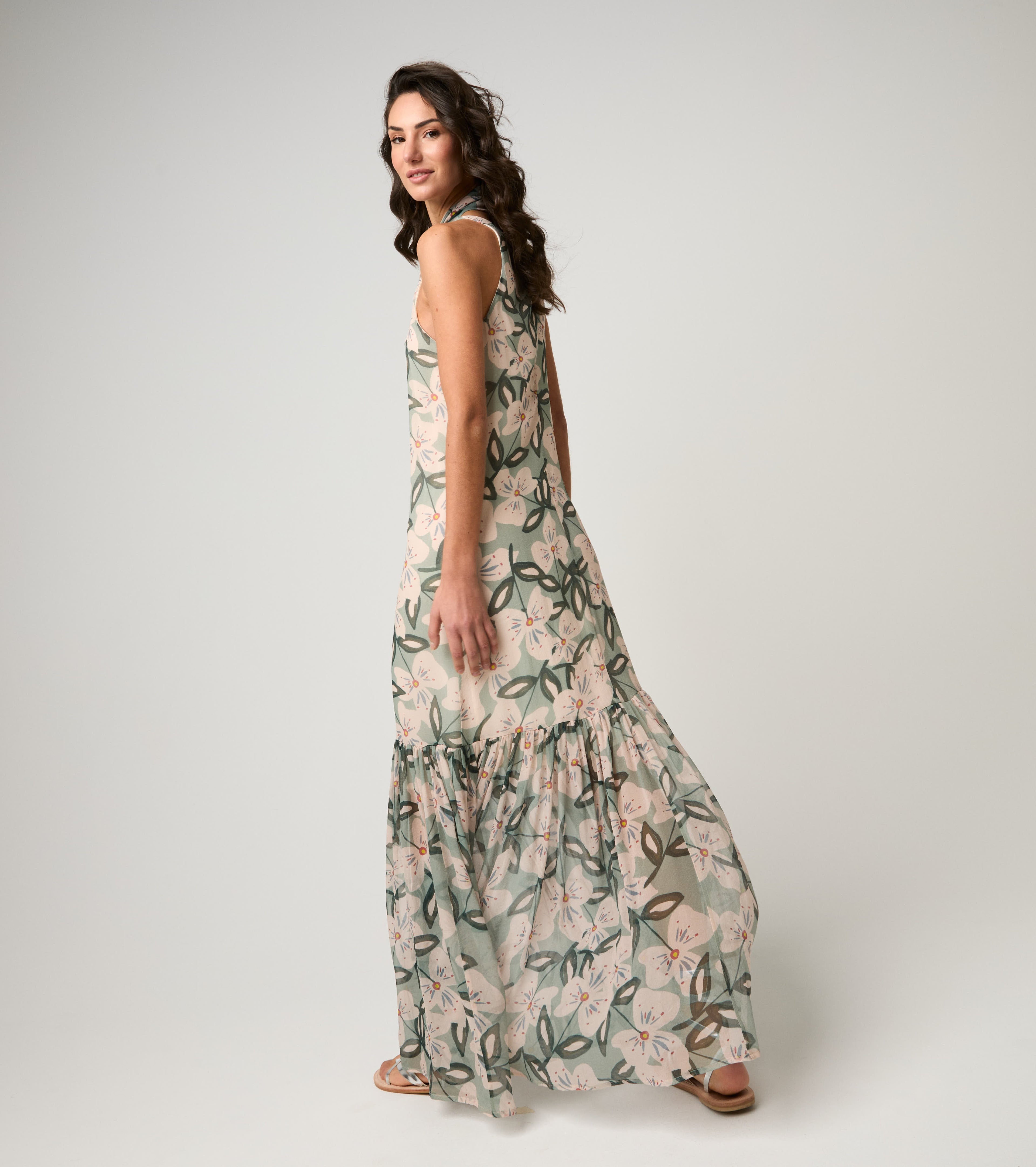 Abito lungo in seta floreale salvia