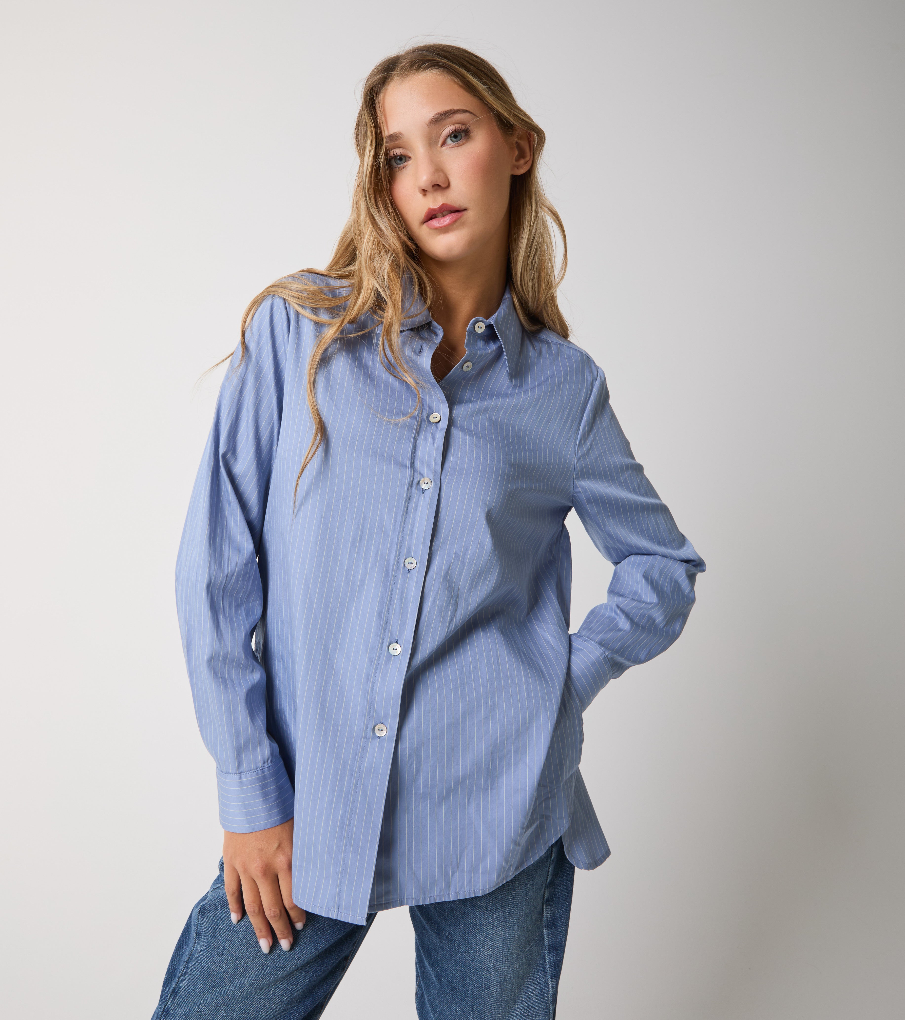 Modellen har en lige pasform, klassisk krave, lange ærmer og knaplukning. Et tidløst, maskulint inspireret stykke tøj til et casual-chikt look.