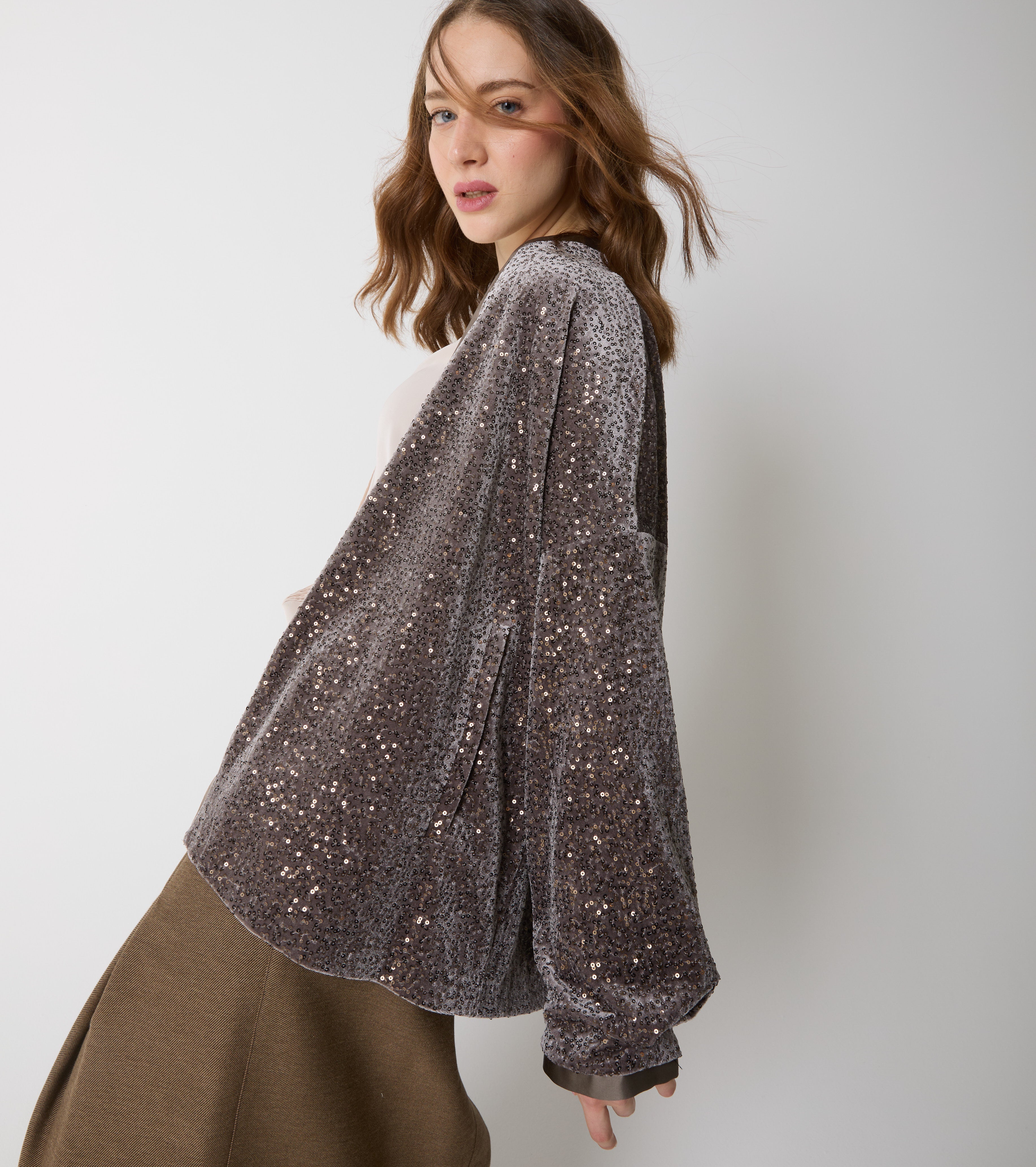 Vælg jakken i stretchfløjl, der er pyntet med tone-i-tone mikropailletter.