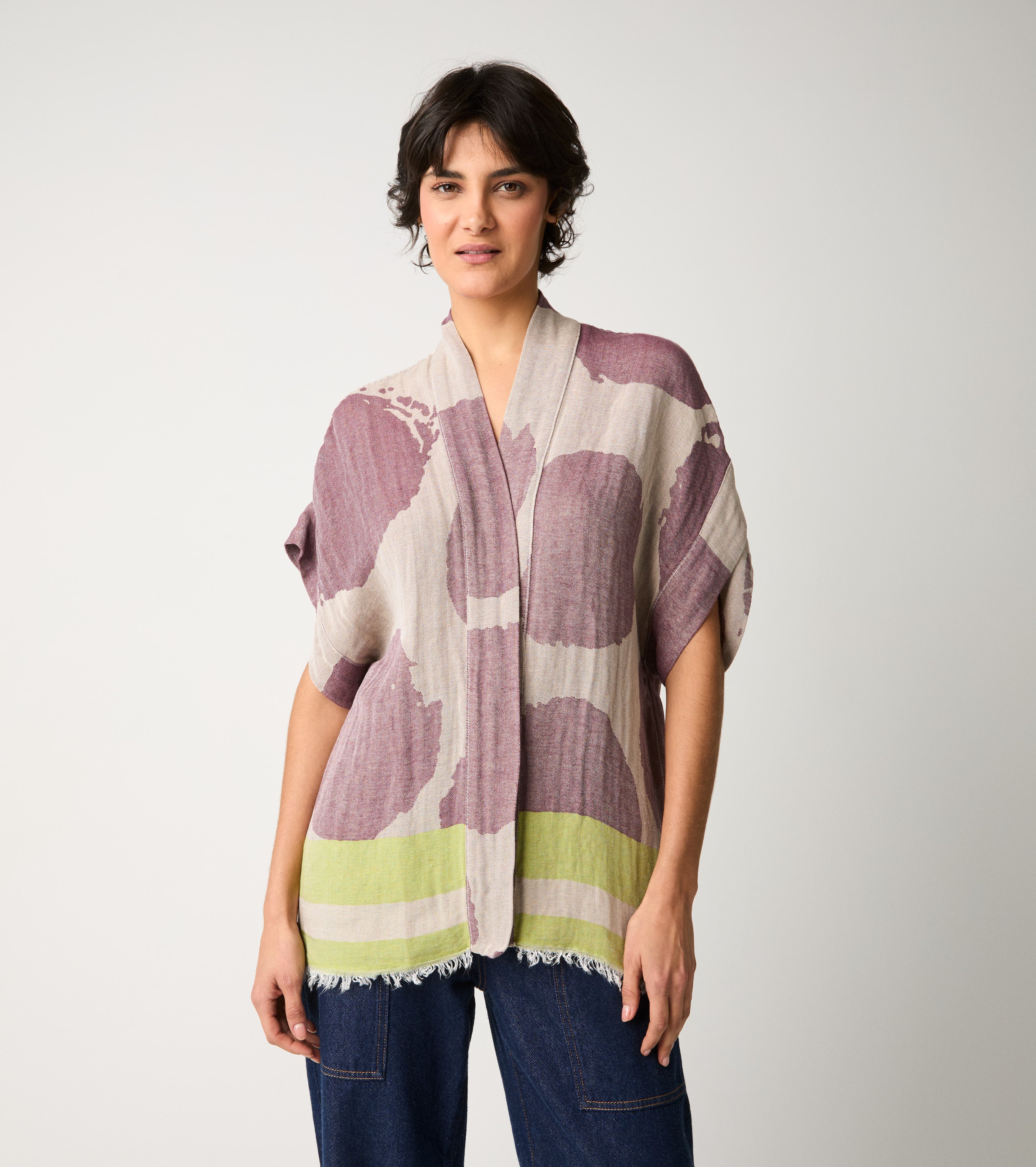 Il modello ha una linea morbida a kimono con scollo a V, maniche corte e fondo sfrangiato. Curato in ogni dettaglio, è la nota di colore che completa il guardaroba del passaggio di stagione.