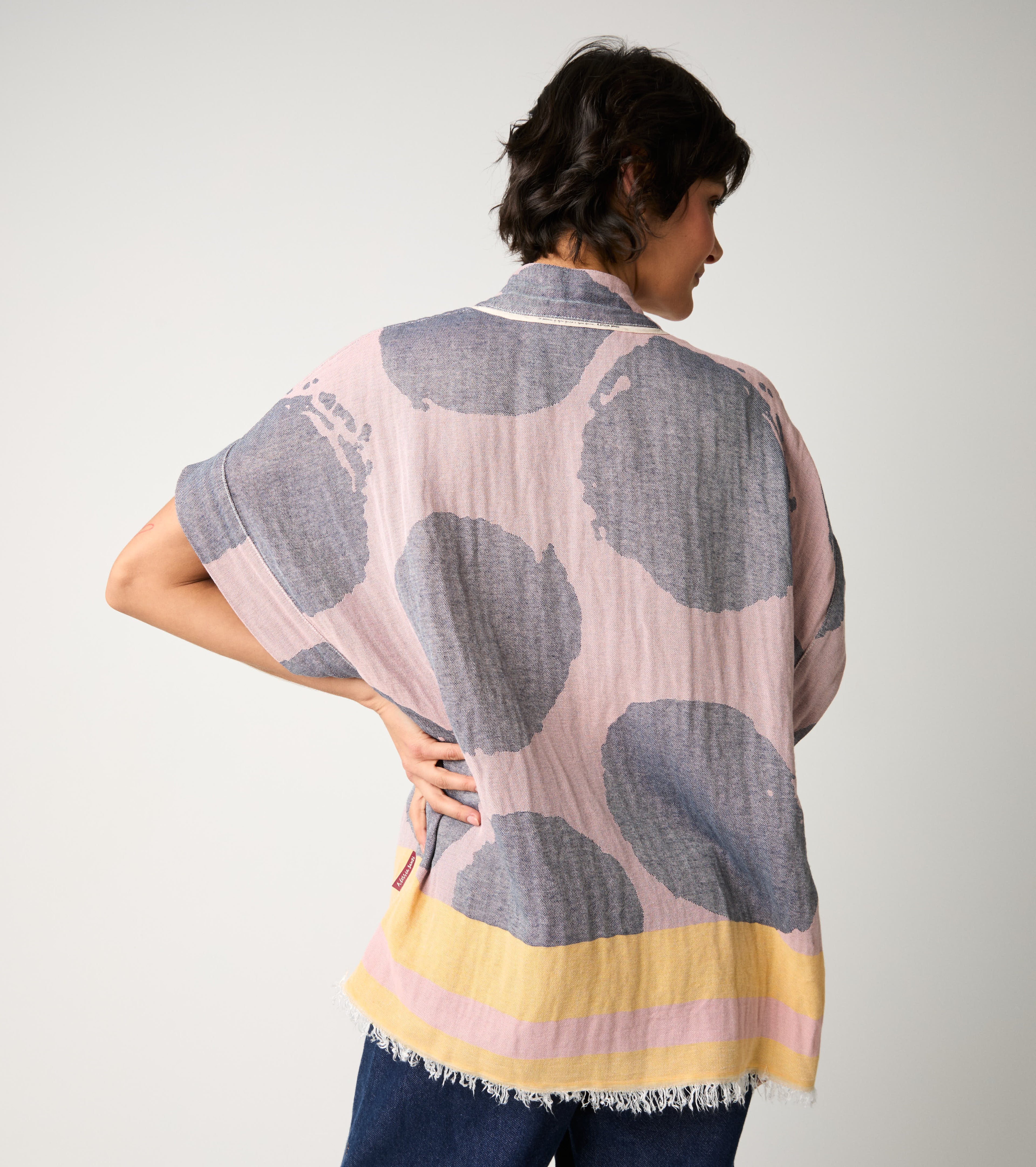 Il modello ha una linea morbida a kimono con scollo a V, maniche corte e fondo sfrangiato. Curato in ogni dettaglio, è la nota di colore che completa il guardaroba del passaggio di stagione.