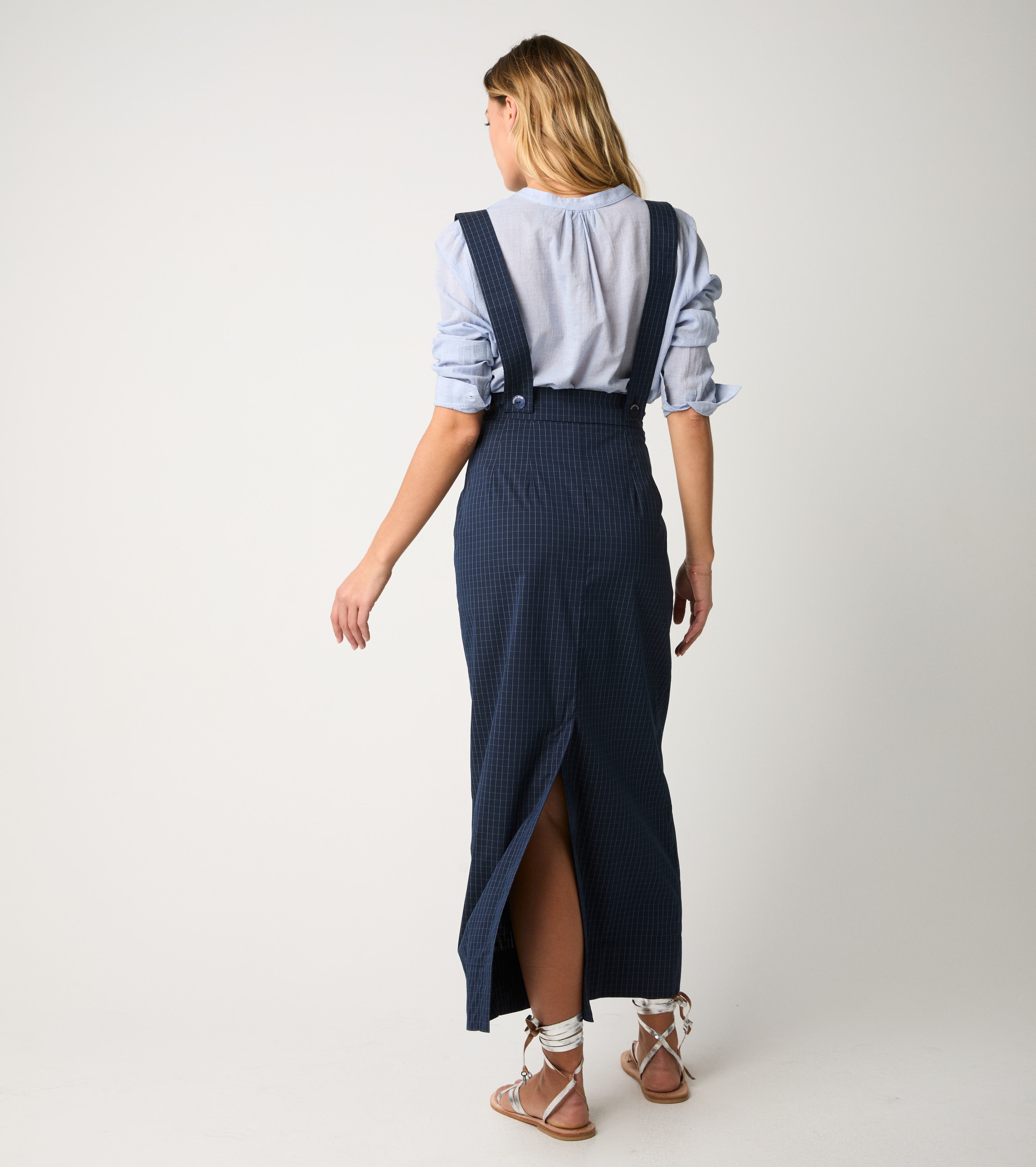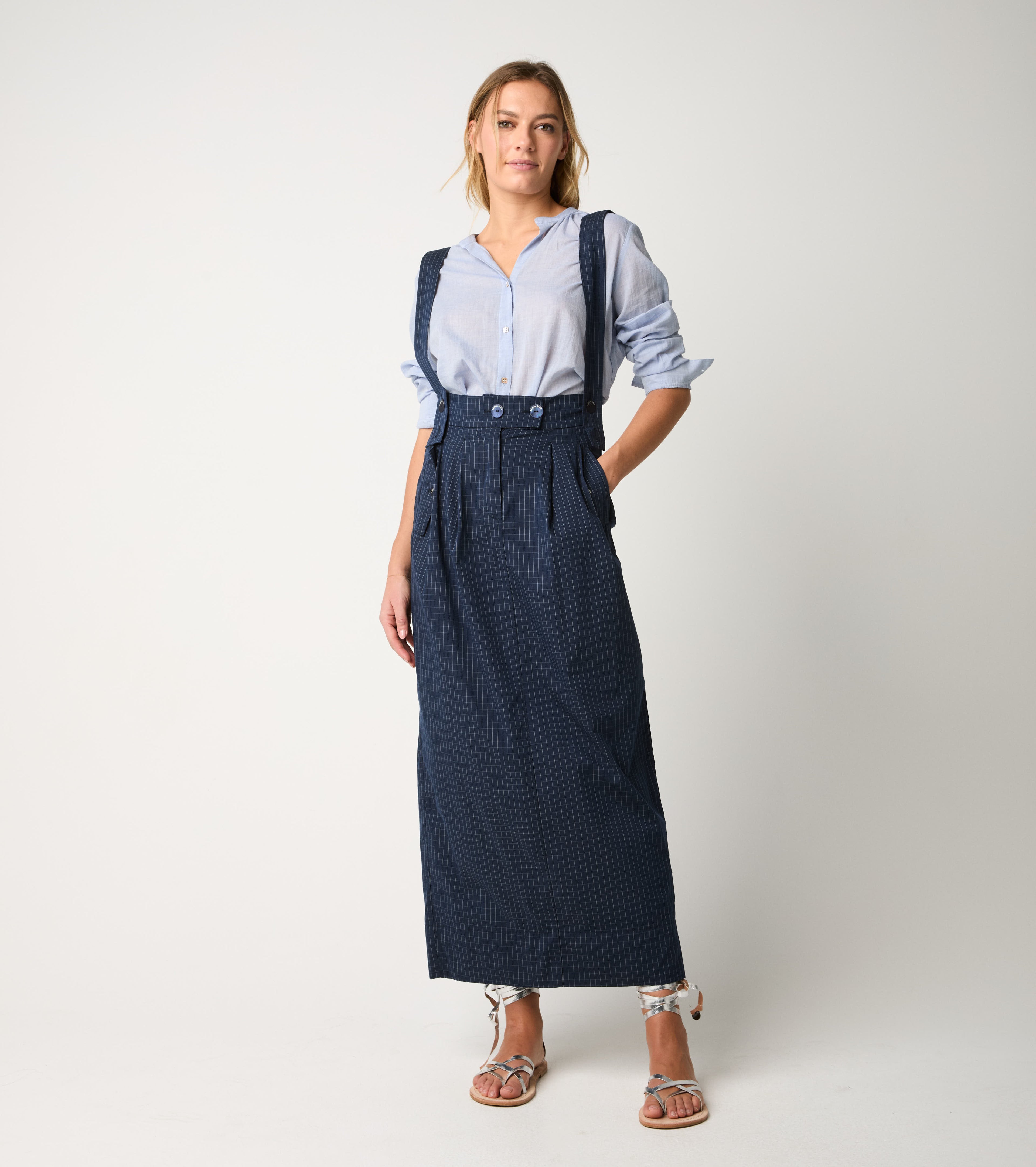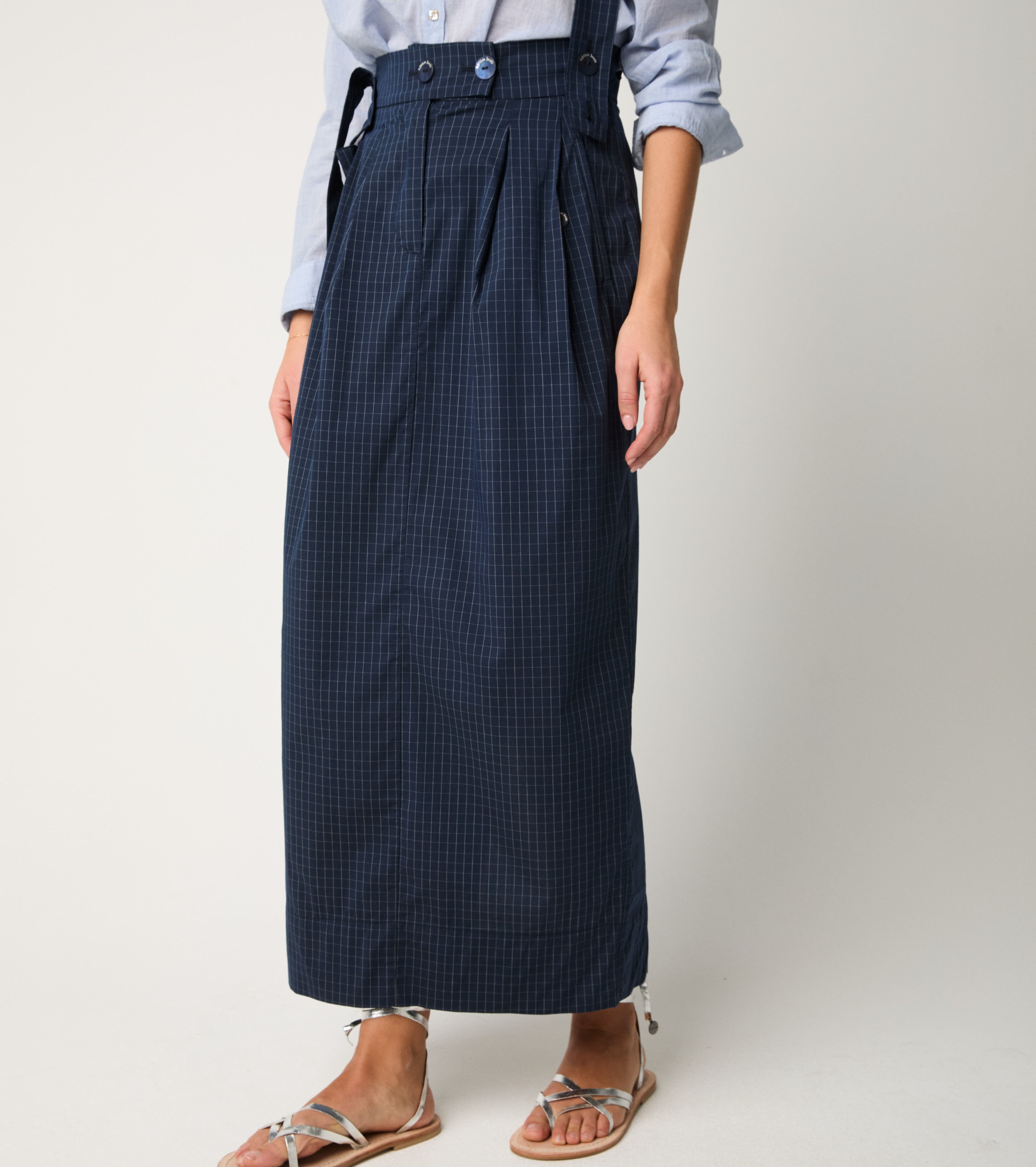 Gonna check con bretelle blu