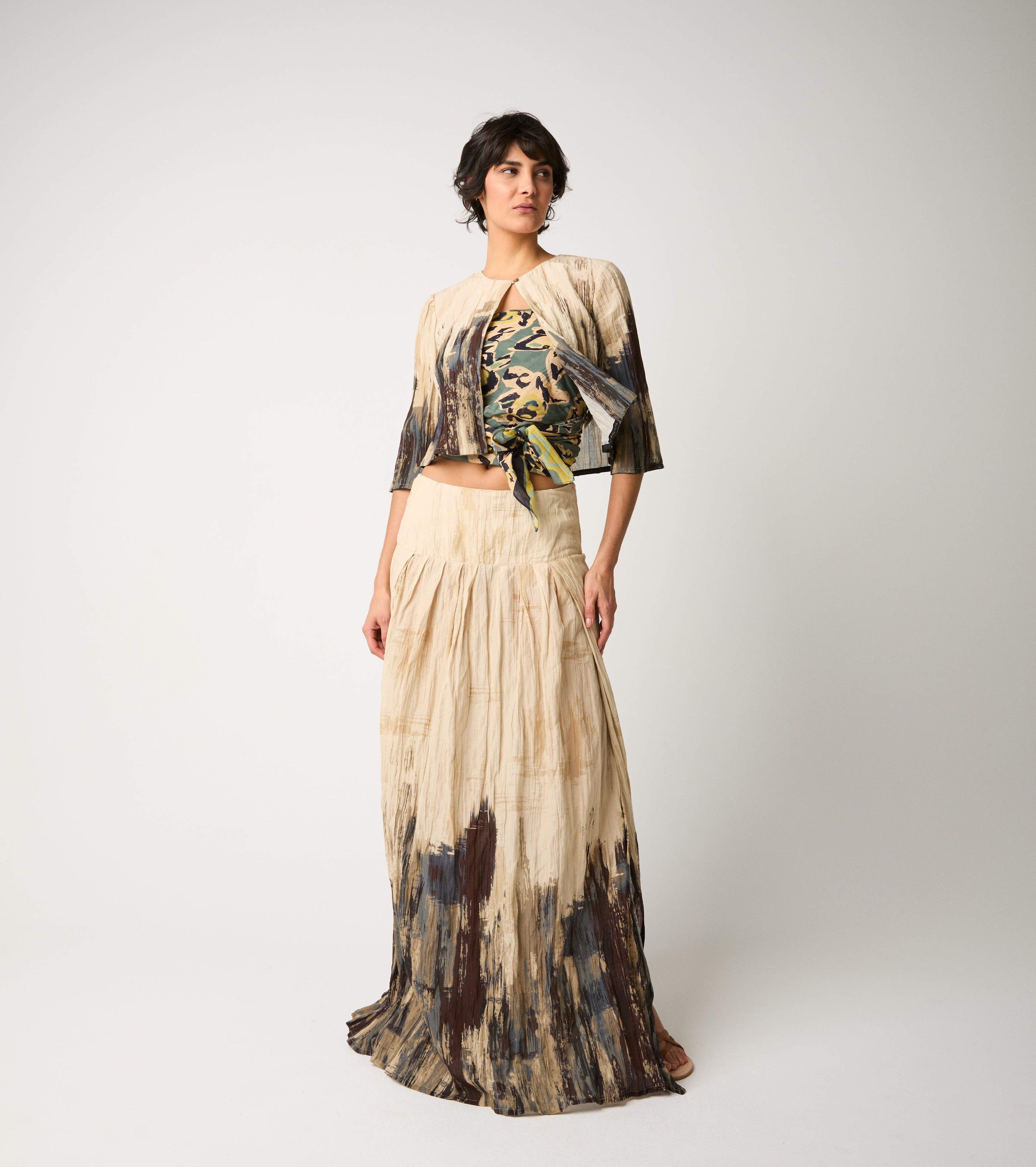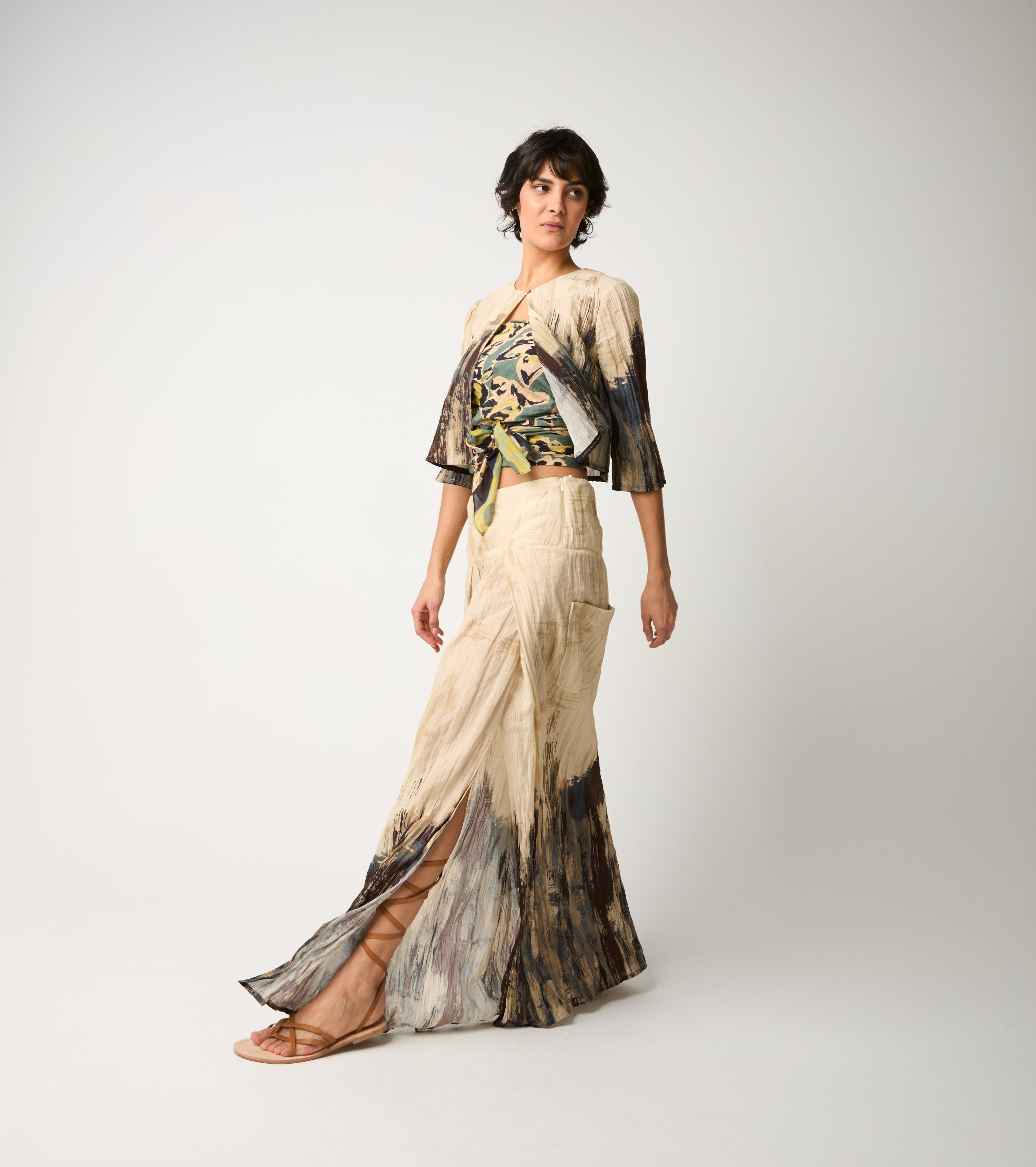 Per un effetto total look sofisticato e contemporaneo, la gonna lunga si abbina perfettamente alla giacca cropped coordinata. Completa lo styling con una borsa in pelle.