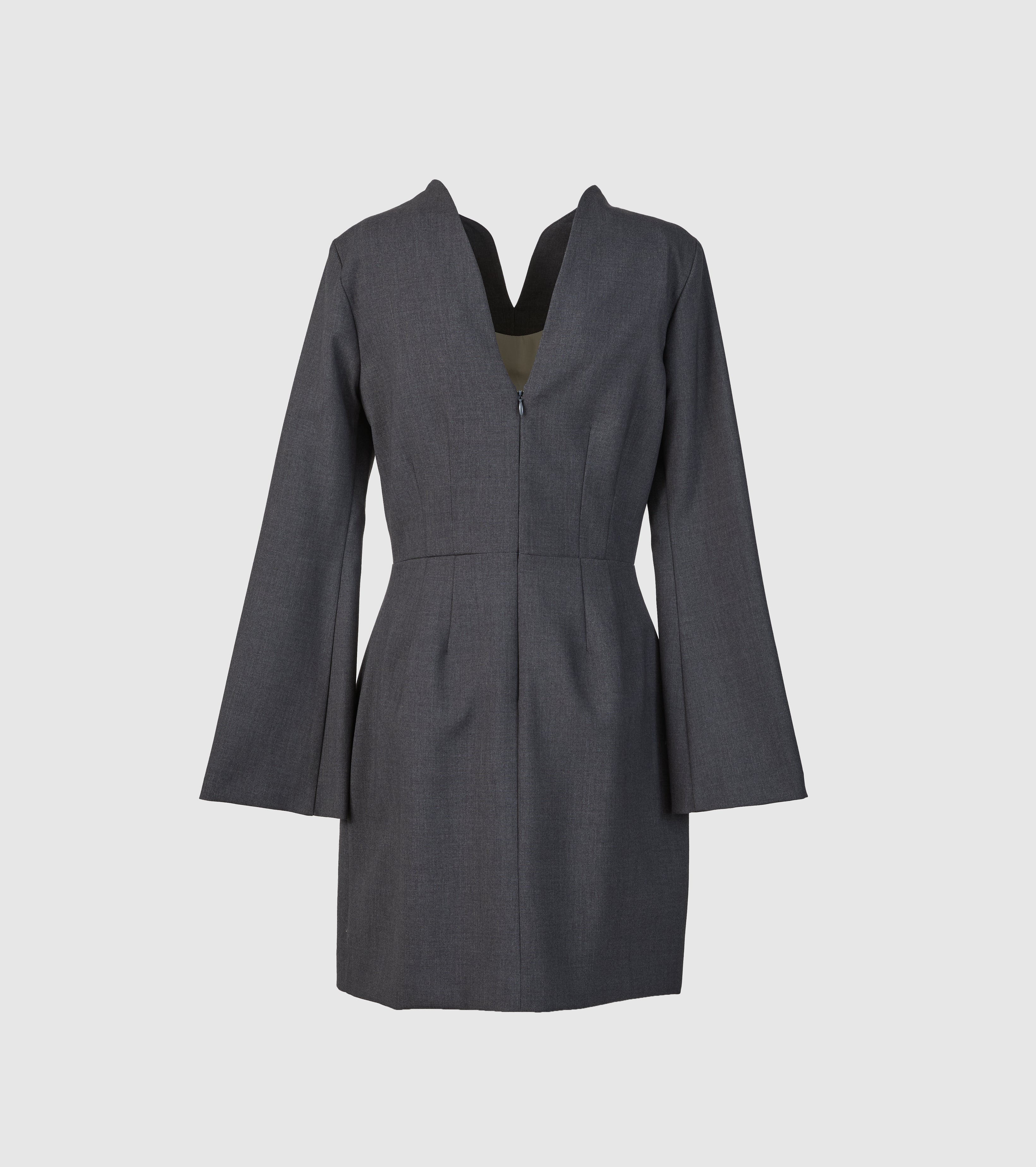 Kort kjole i teknisk stof med udsvunget silhuet, V-udskæring og lange, løse ærmer. Påsatte lommer og læg i taljen giver struktur og definition til silhuetten. Et stykke tøj med en markant og feminin stil, der er ideelt til at genfortolke urban elegance med et moderne touch.