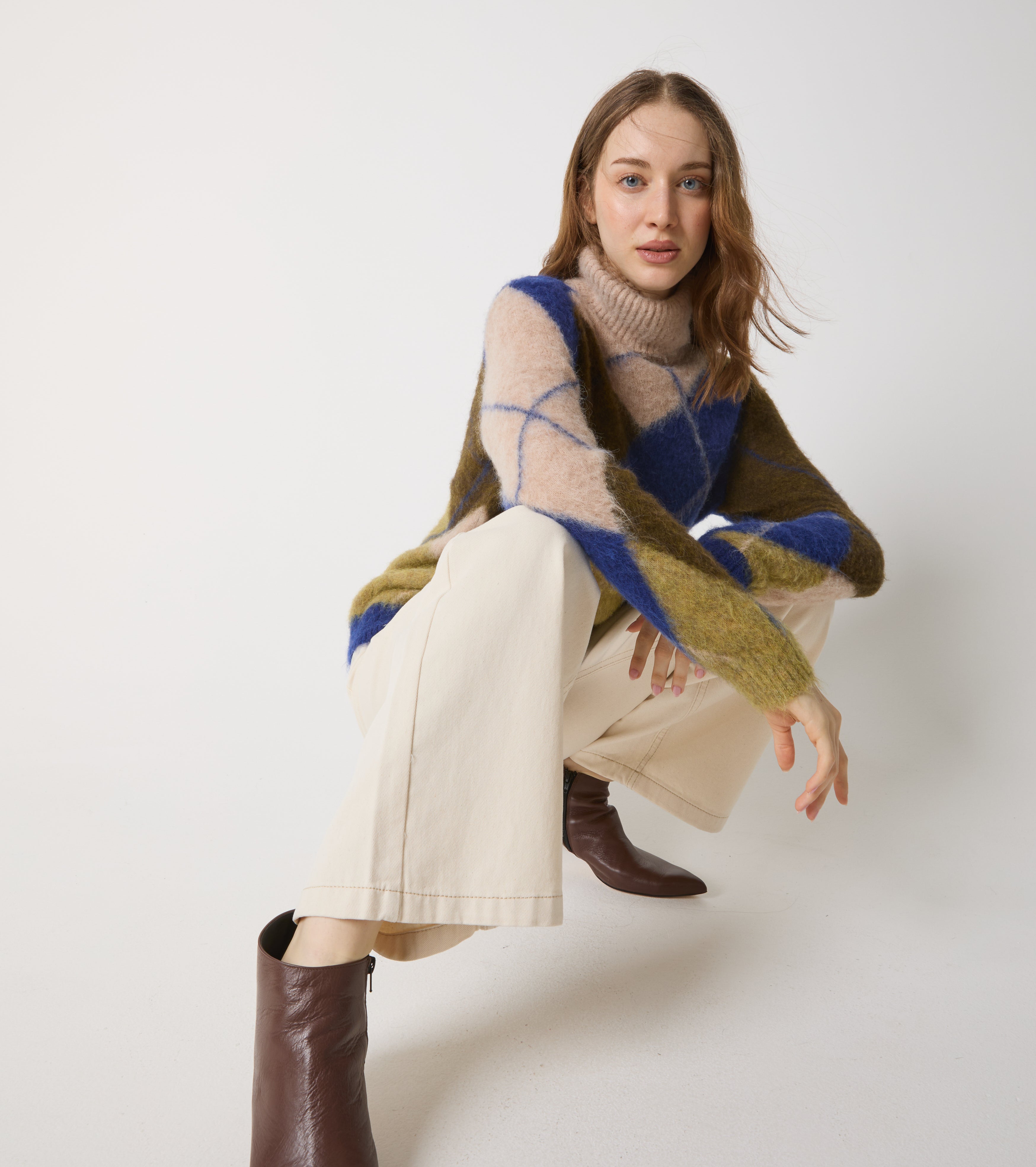 Vælg denne bluse i blødt blandet uld- og alpakagarn med stort rombemønster i varme, livlige farver.