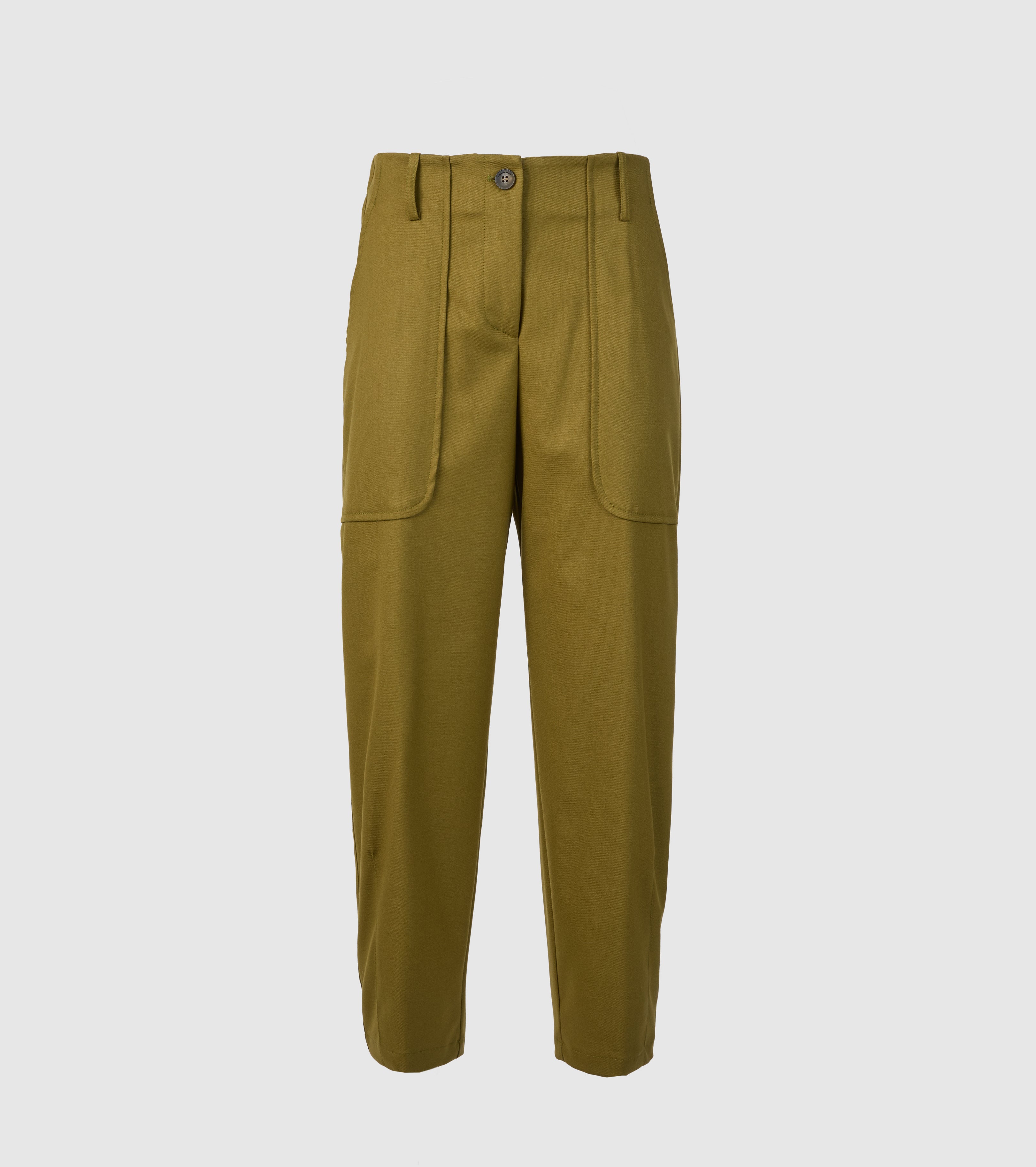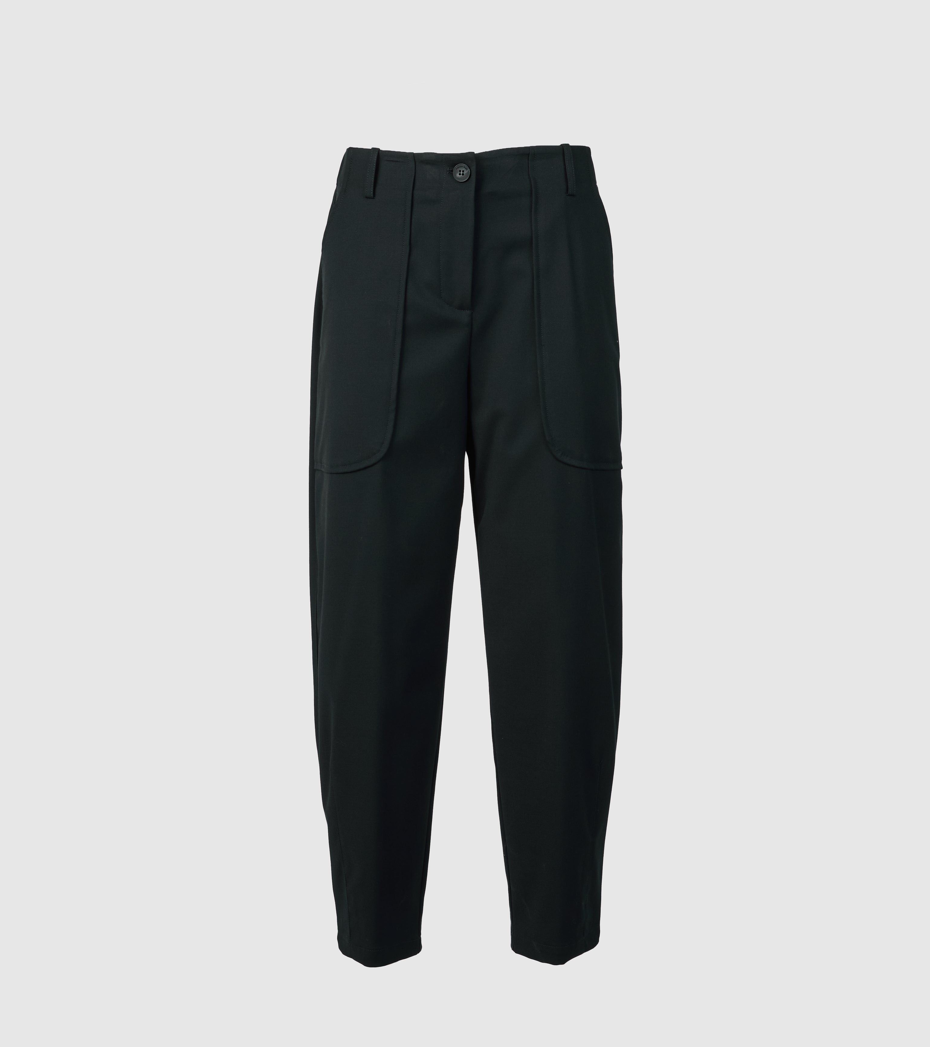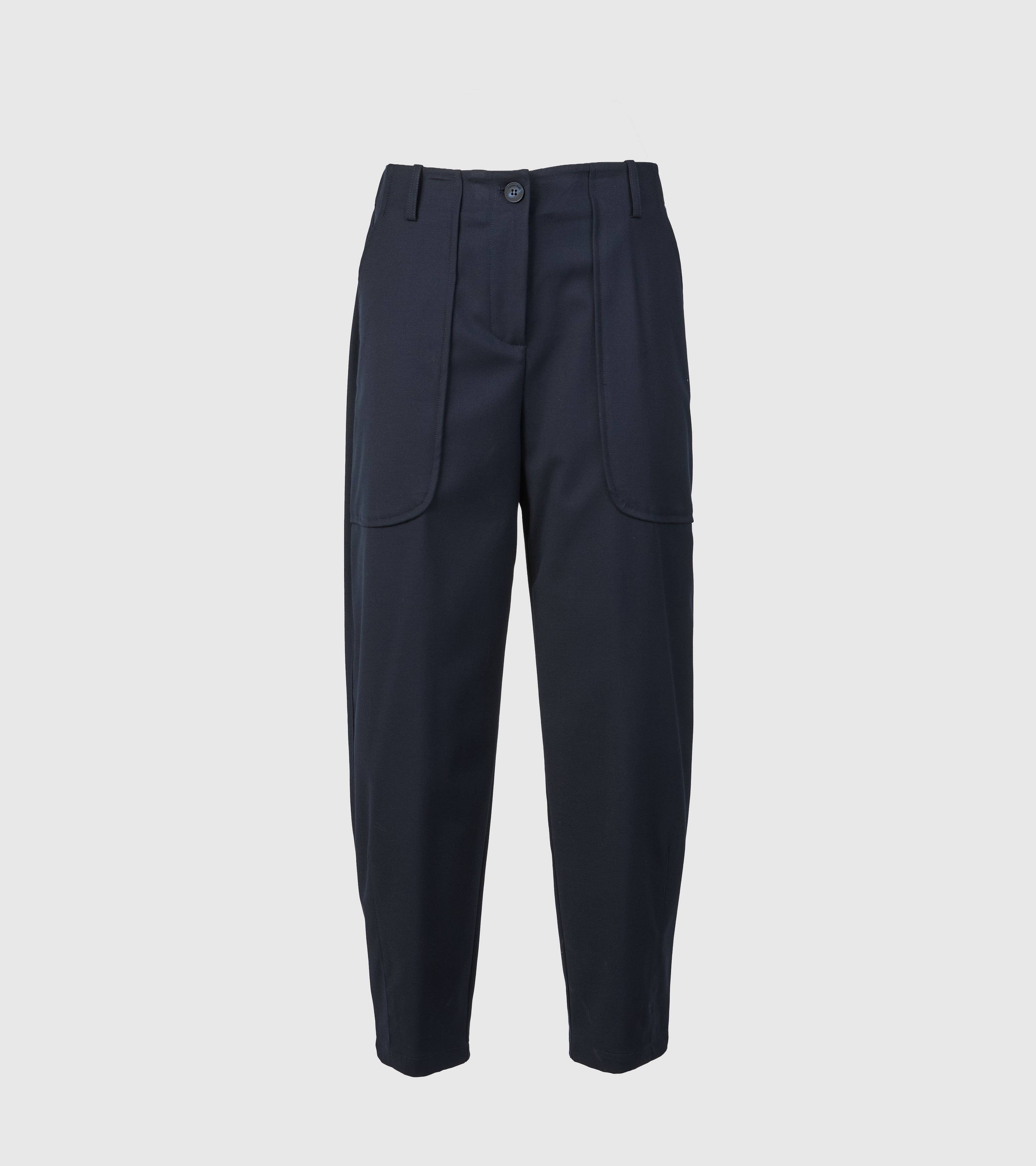 Modellen har et cropped design med normal talje og lommer i siden. Den er smal i benene for et moderne og alsidigt look, der fremhæver silhuetten.