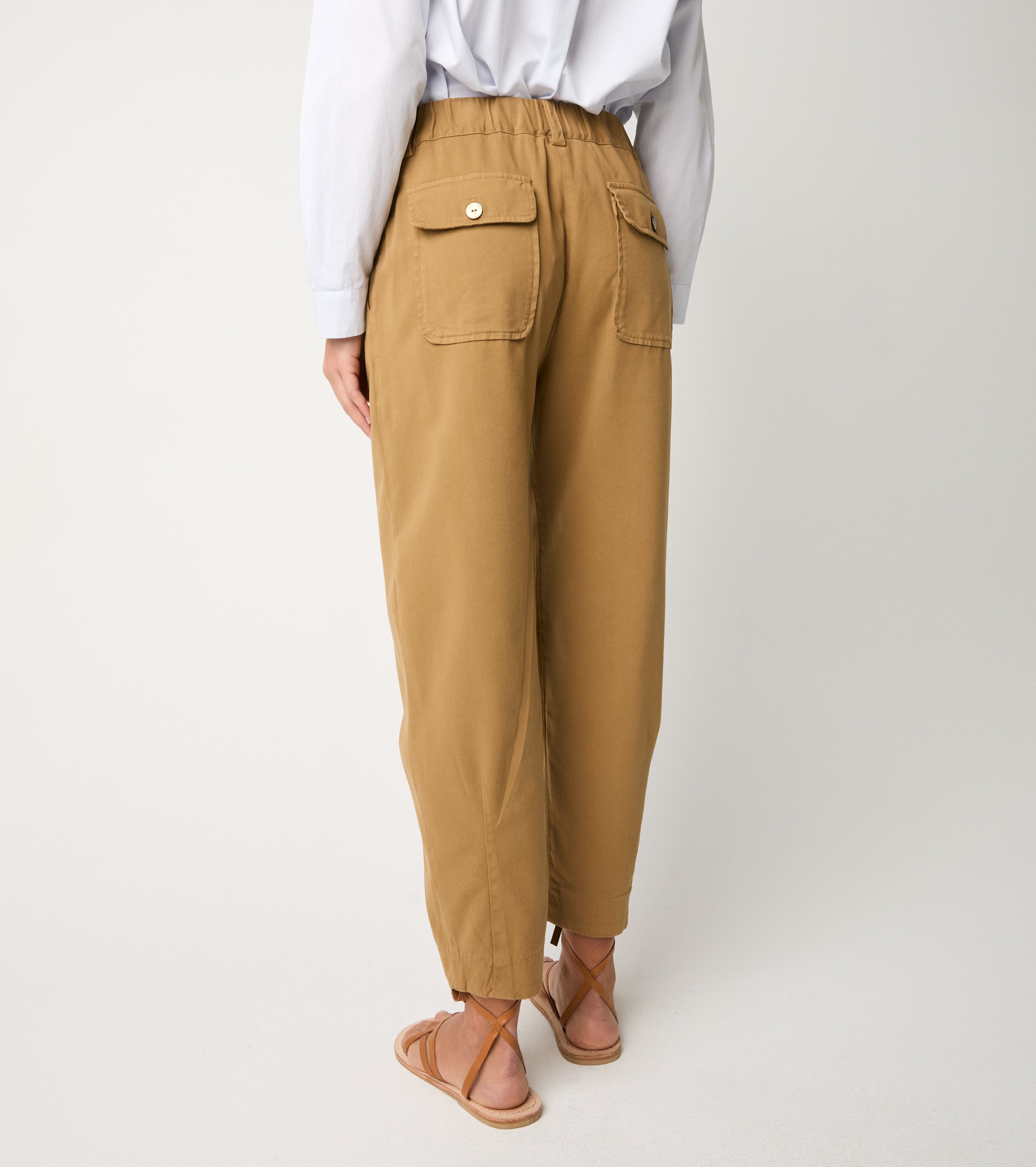 Il modello dal design affusolato e cropped presenta pinces e tasche sui fianchi. Comfort quotidiano per un'eleganza rilassata dal gusto contemporaneo.