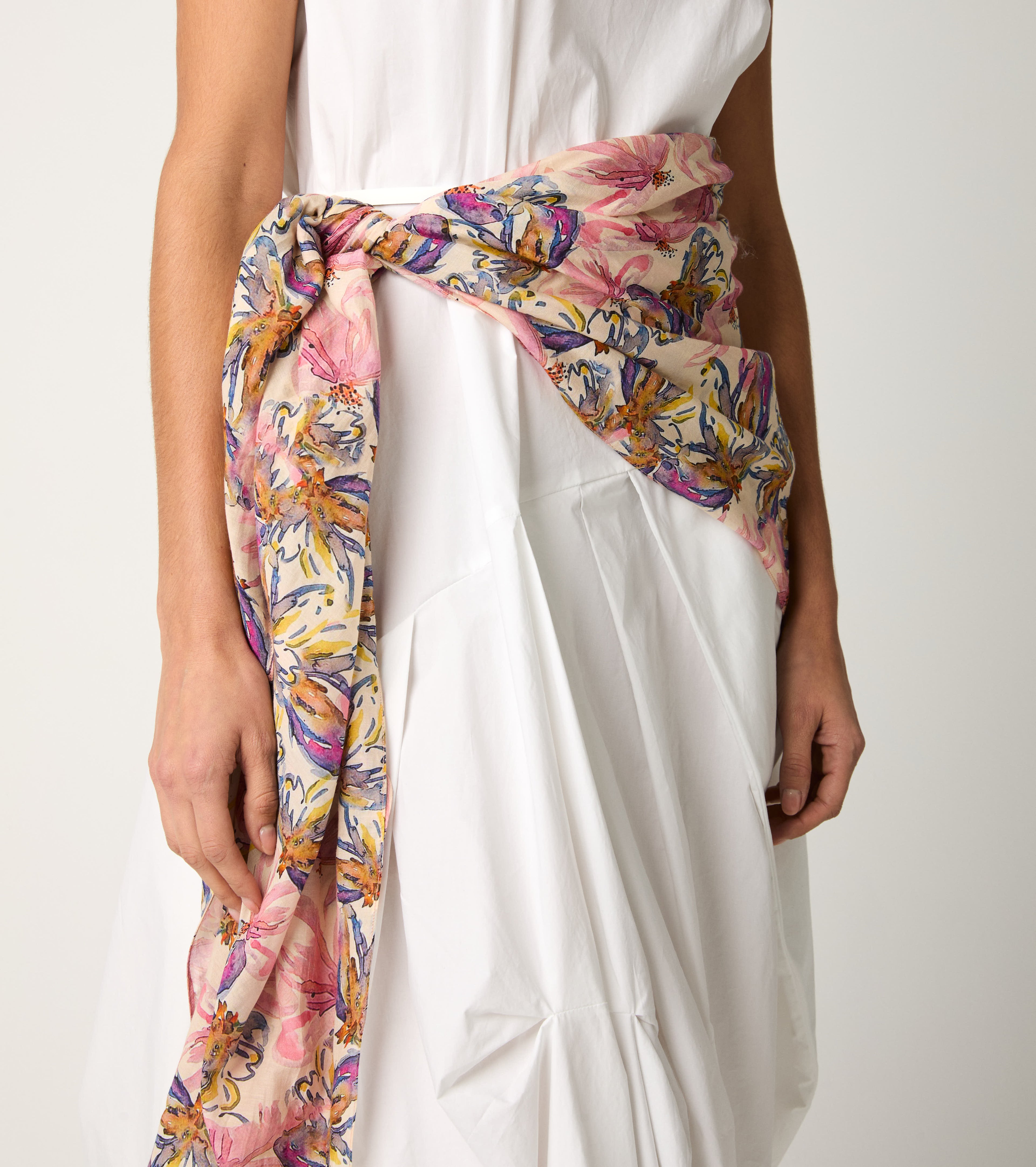 Scegli la sciarpa realizzata in voile di cotone e seta con una vibrante stampa floreale.