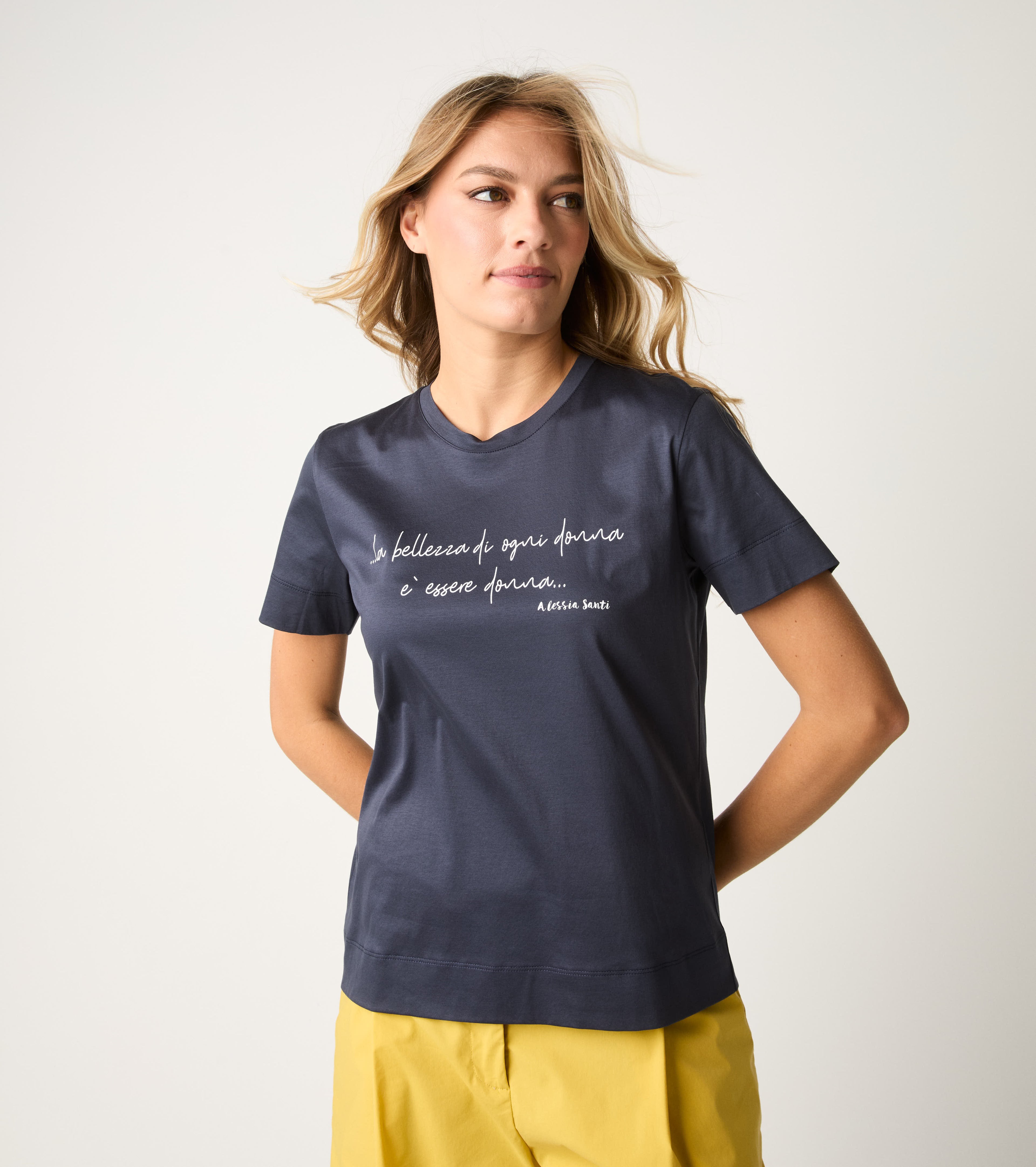 Scegli la t-shirt realizzata in morbido cotone con stampa lettering sul davanti, espressione distintiva dello stile raffinato Alessia Santi.