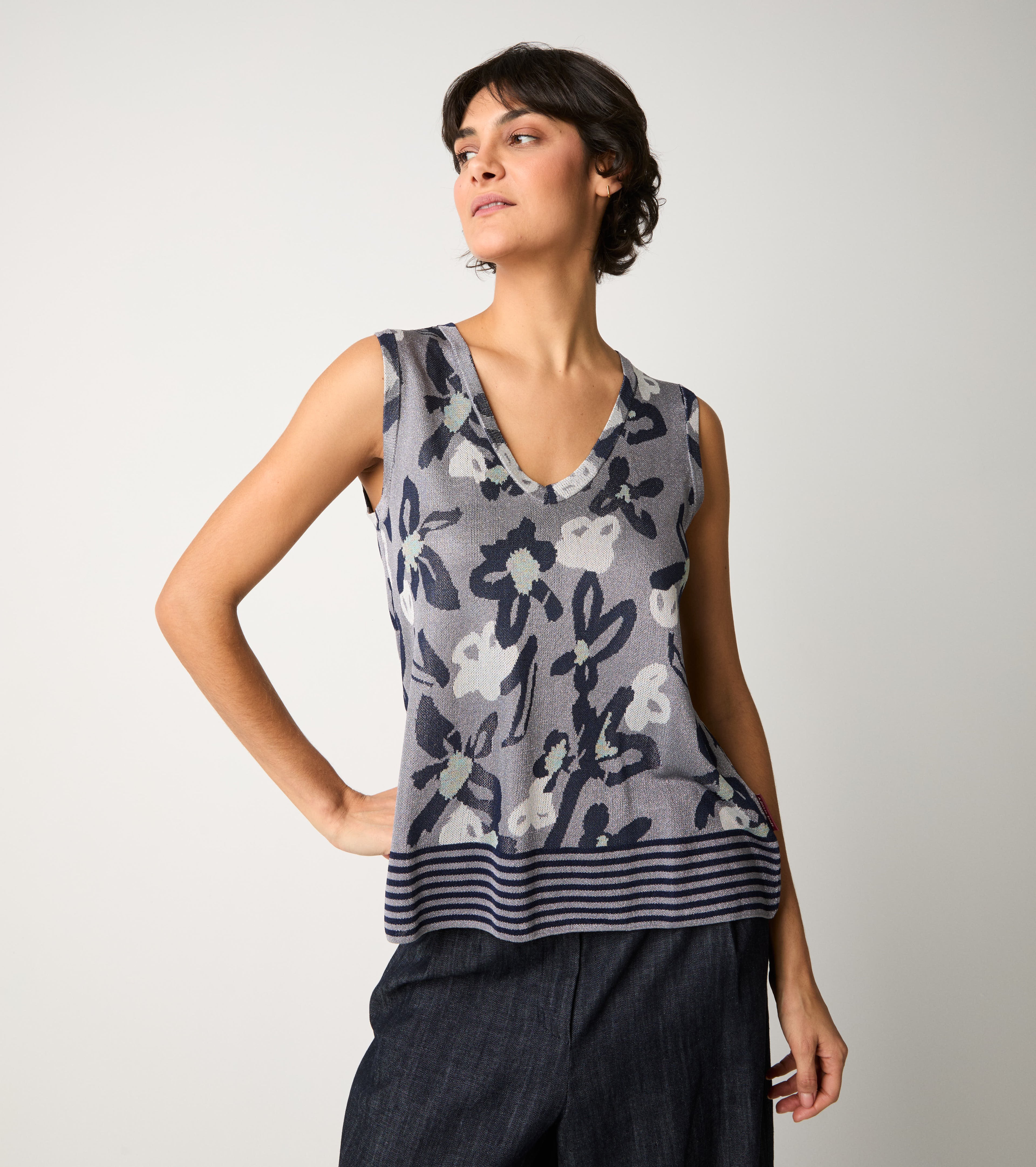 Scegli il top realizzato in maglia di misto viscosa e lurex con un elegante motivo floreale jacquard.