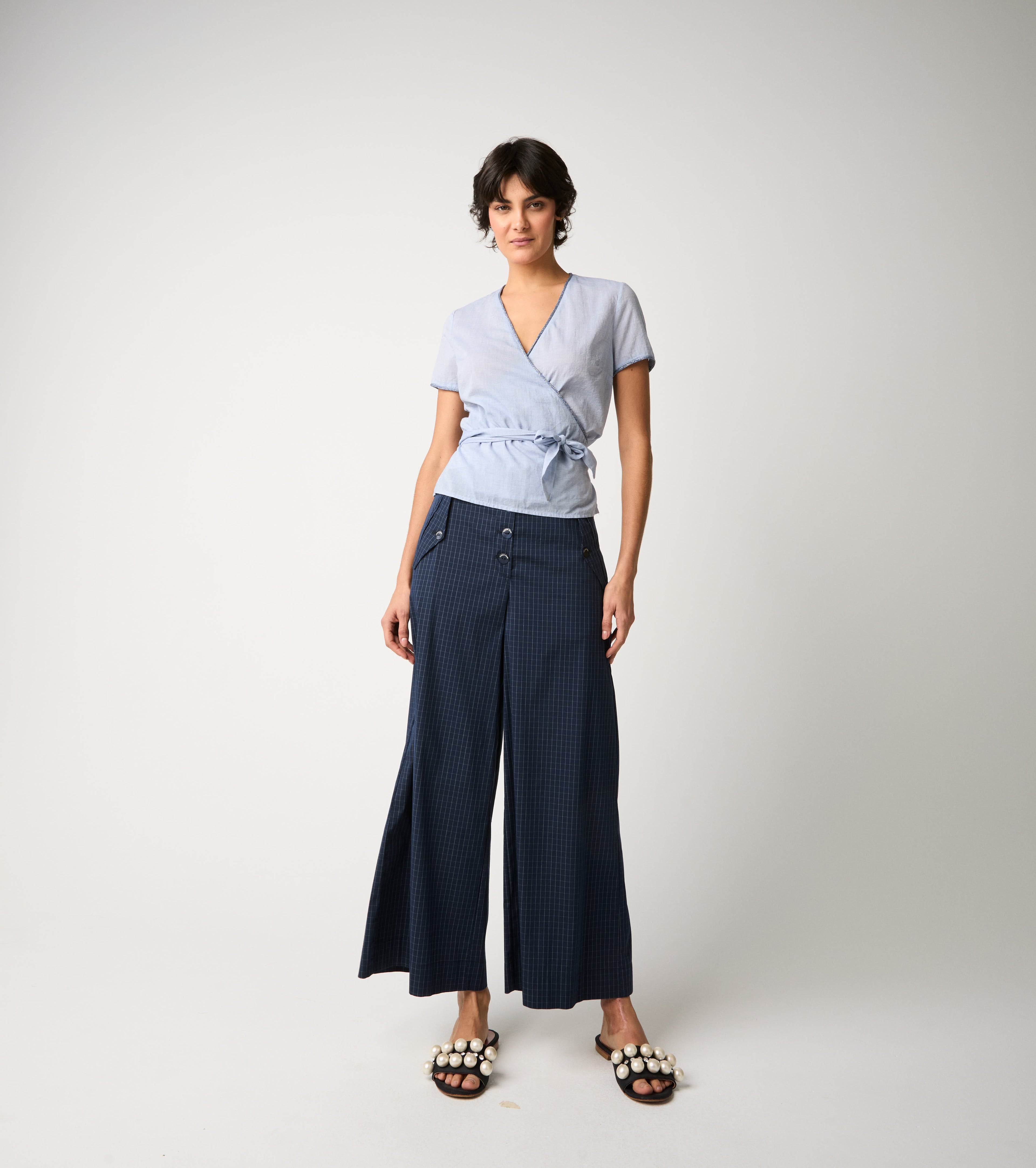 Casual elegance takes shape in combination with light denim trousers with pleats. Complete the styling with flat sandals for a refined and contemporary look.