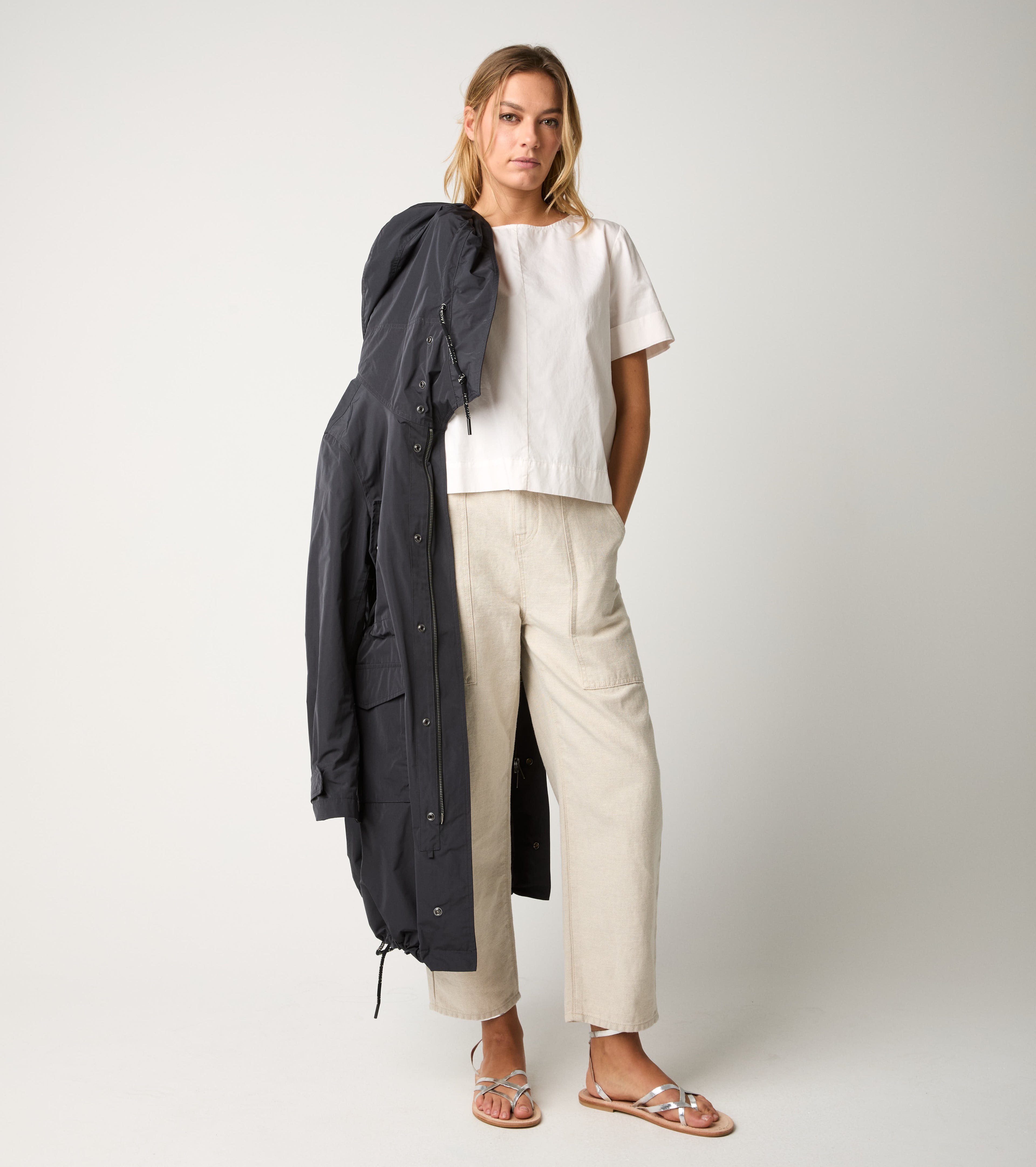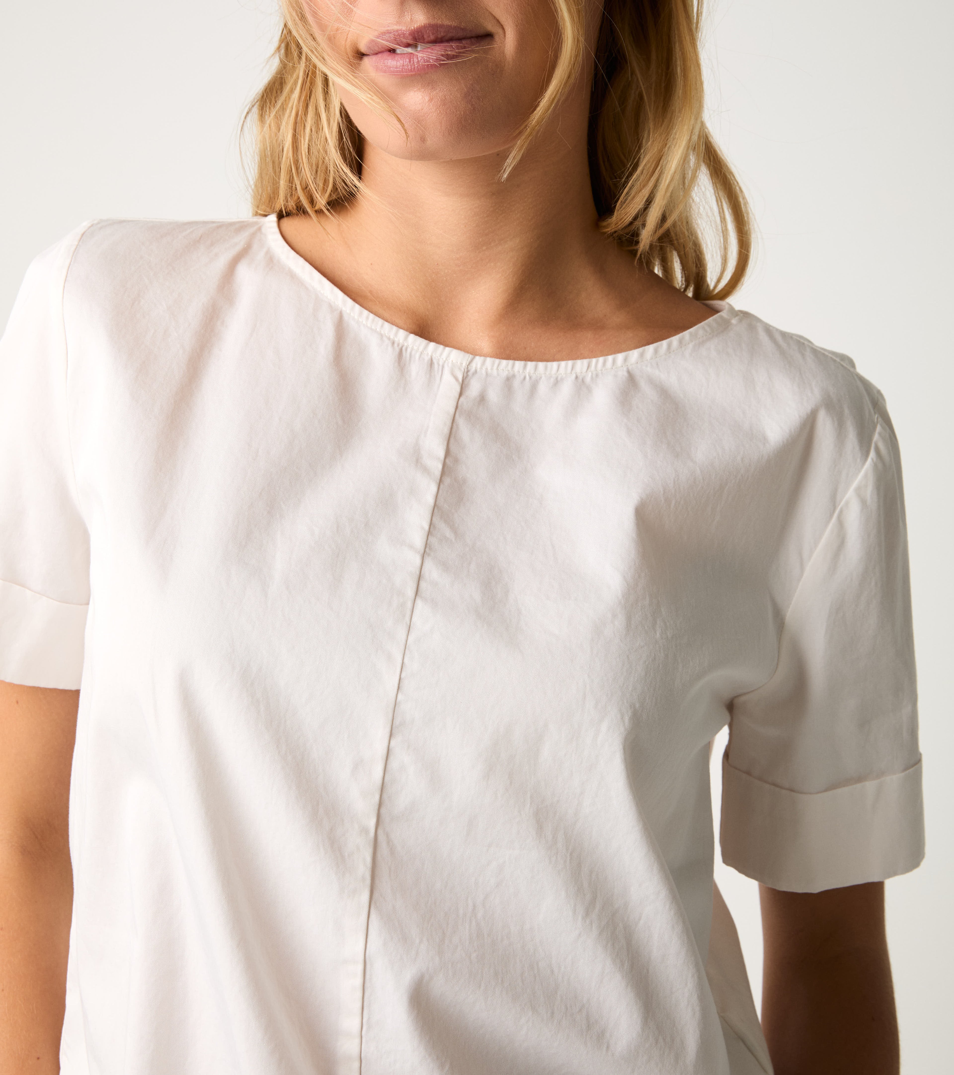 Choose the cotton blouse with a boat neckline and short sleeves with turn-ups.