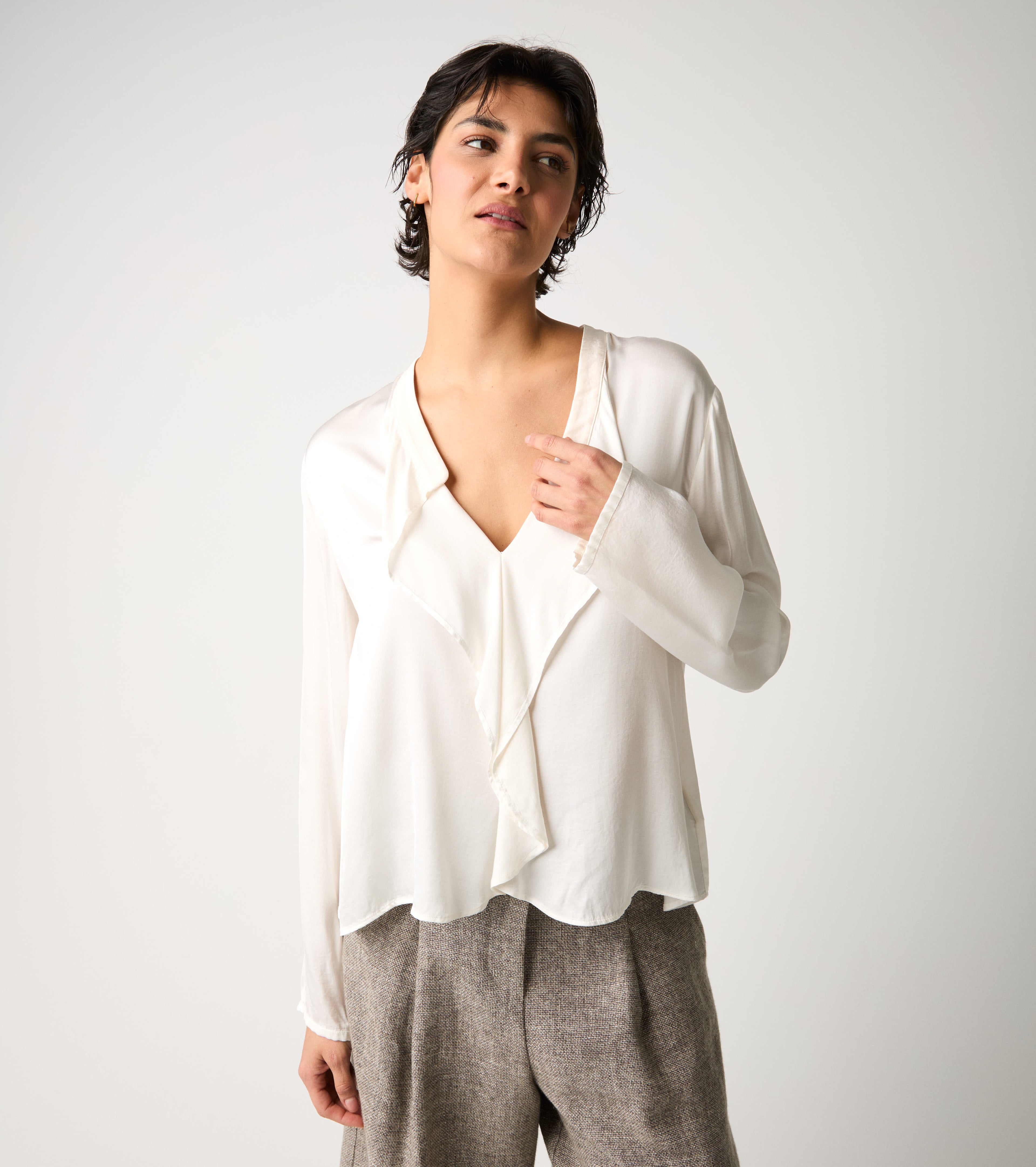 Essential and versatile, this model features a V-neck, long sleeves and ruffles that add movement and femininity.