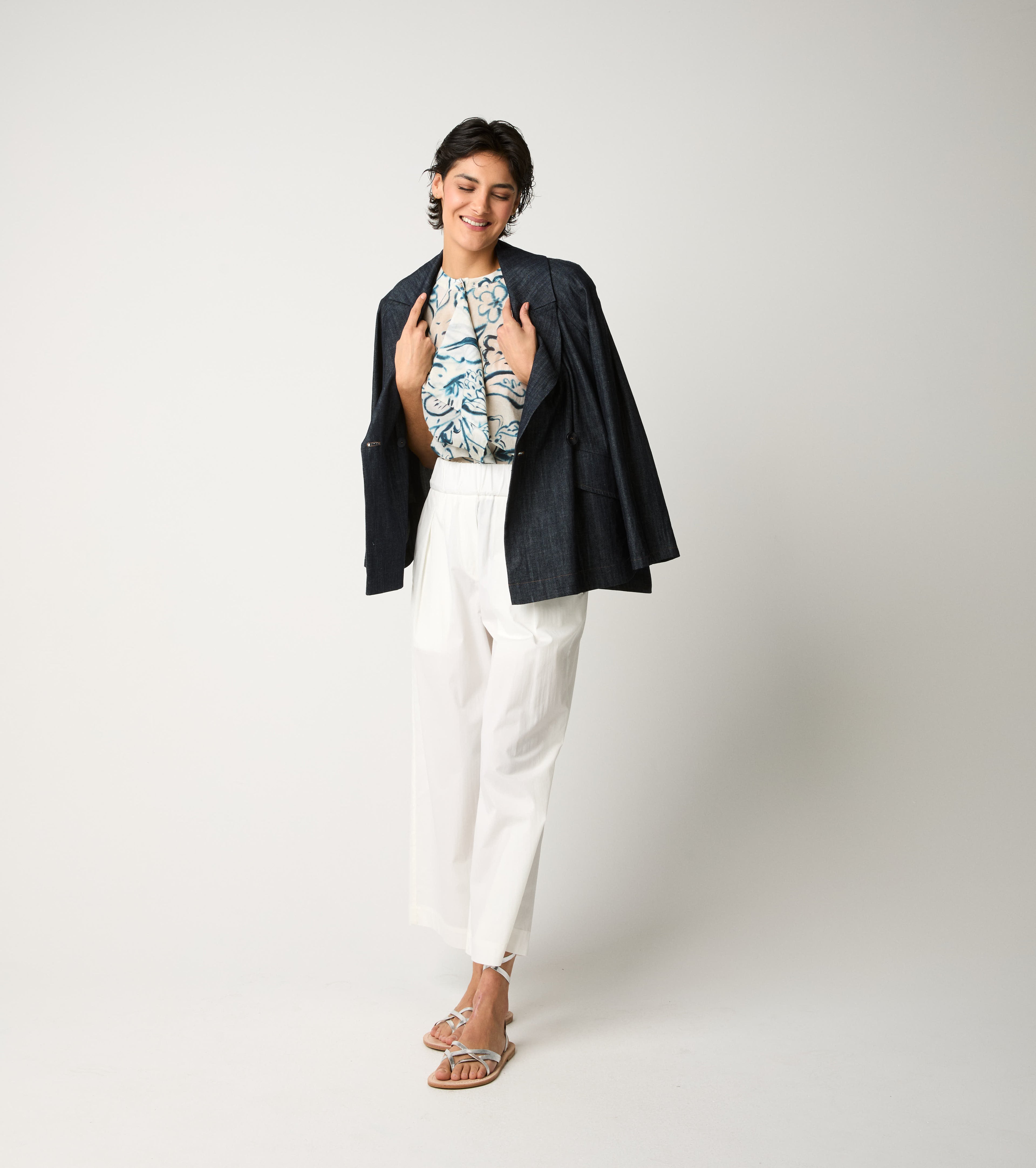 For natural, timeless elegance with a lively touch, wear it with matching blazer and cropped trousers.