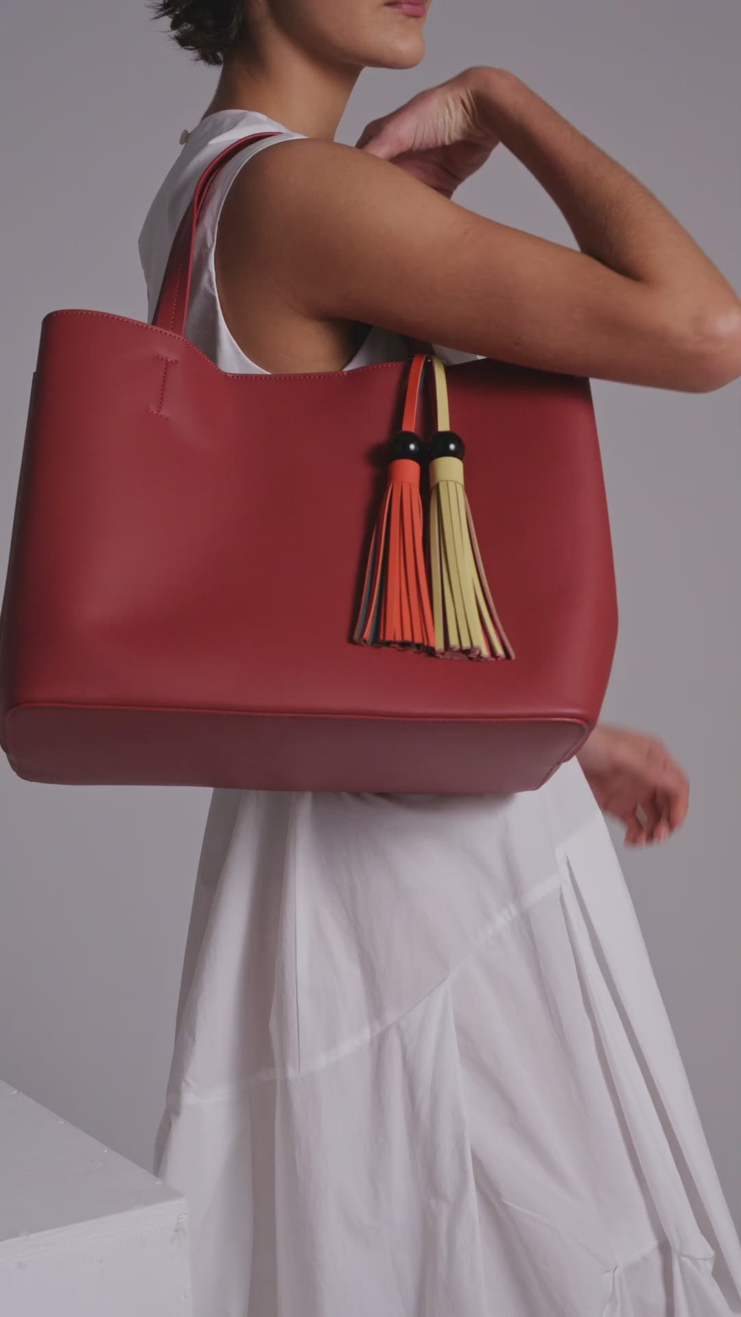 Il modello ha un design capiente e versatile con manici lunghi e charms a forma di nappine.