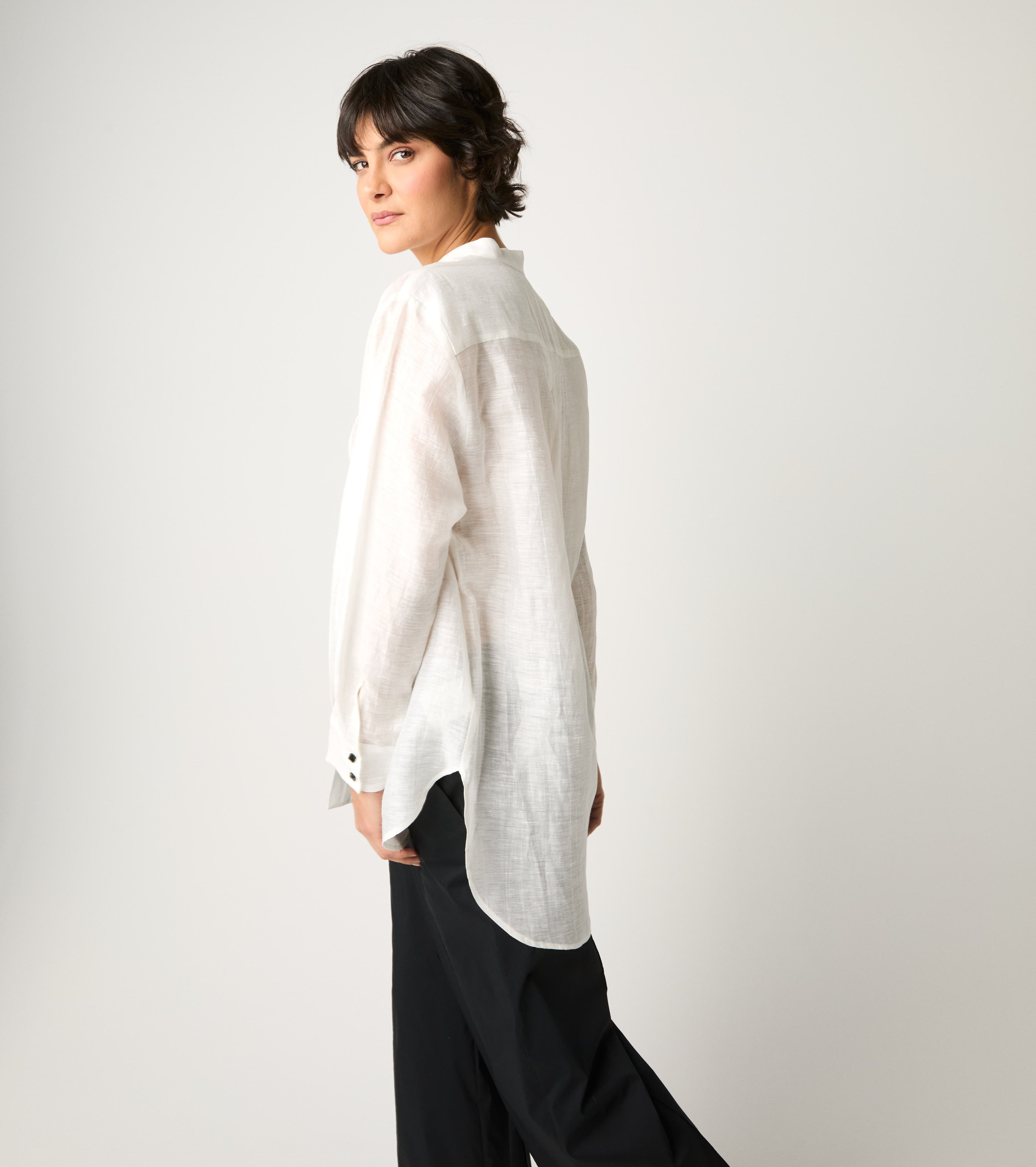 This style features a mandarin collar, long sleeves and covered button fastening. Perfect for a refined and comfortable look, ideal from morning to evening.