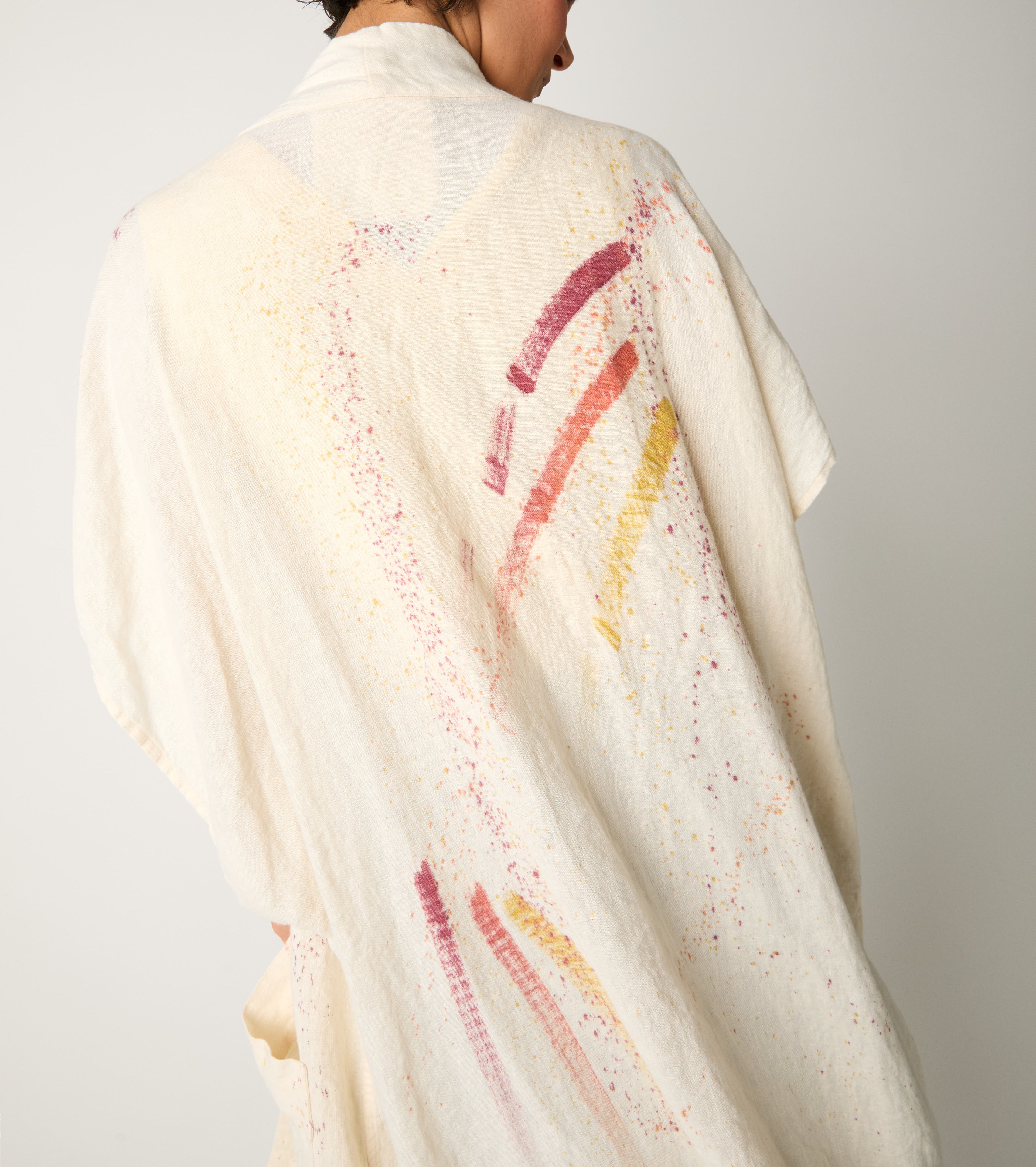 Choose the long kimono jacket made of linen and embellished with an abstract print.