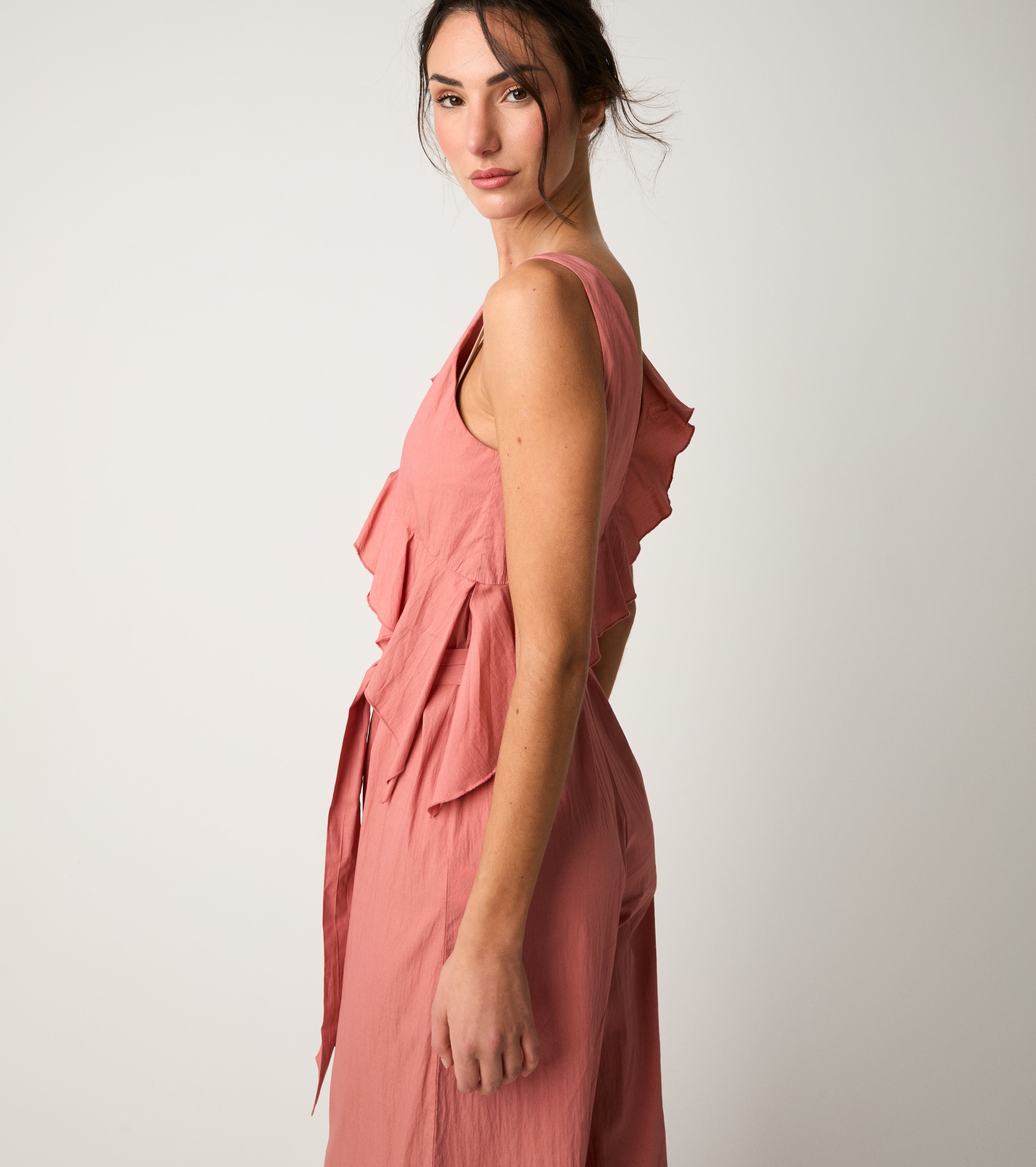 The model has a V-neck with asymmetrical ruffles, a waist belt and wide trousers. For feminine elegance that combines comfort and contemporary charm.