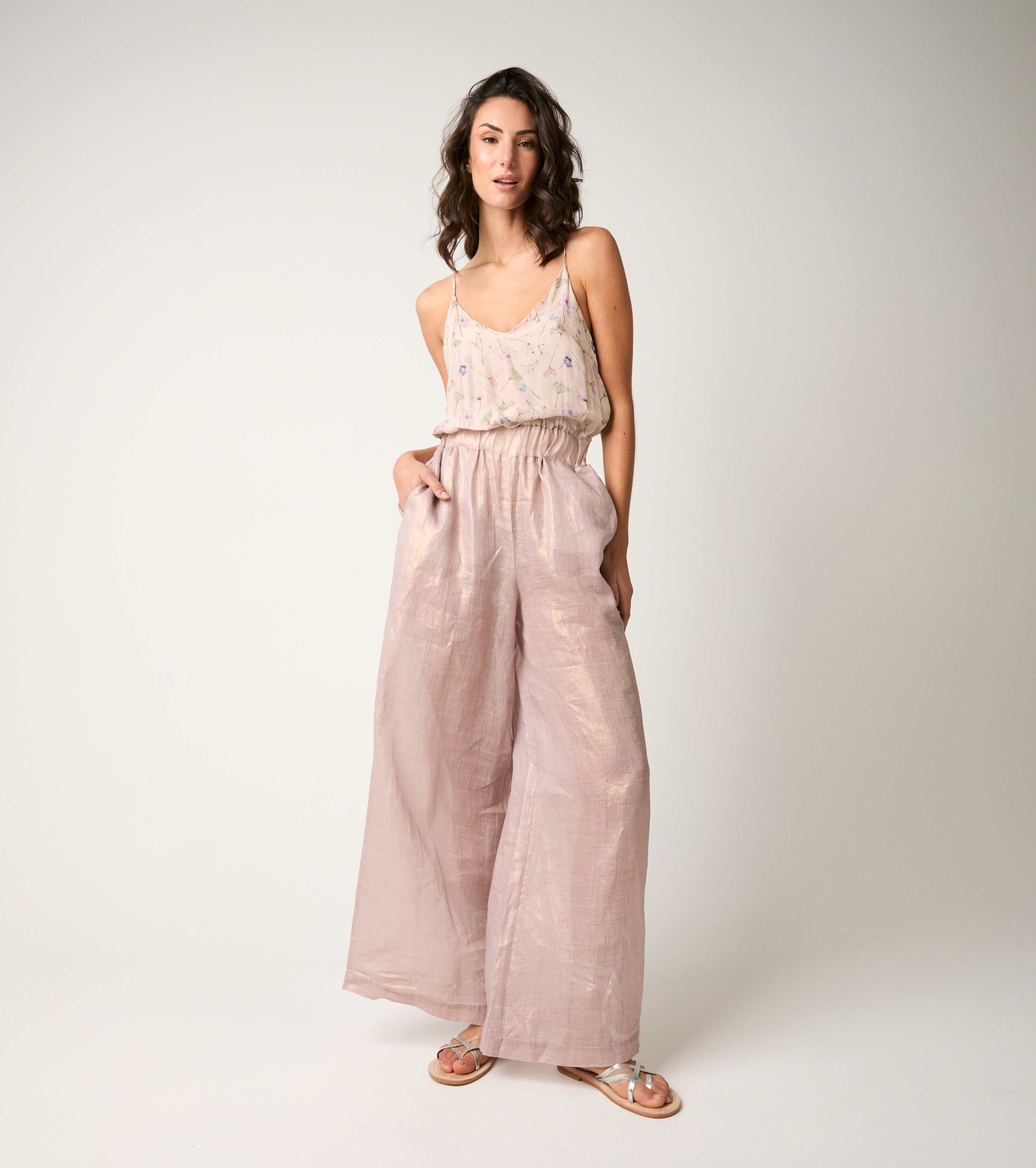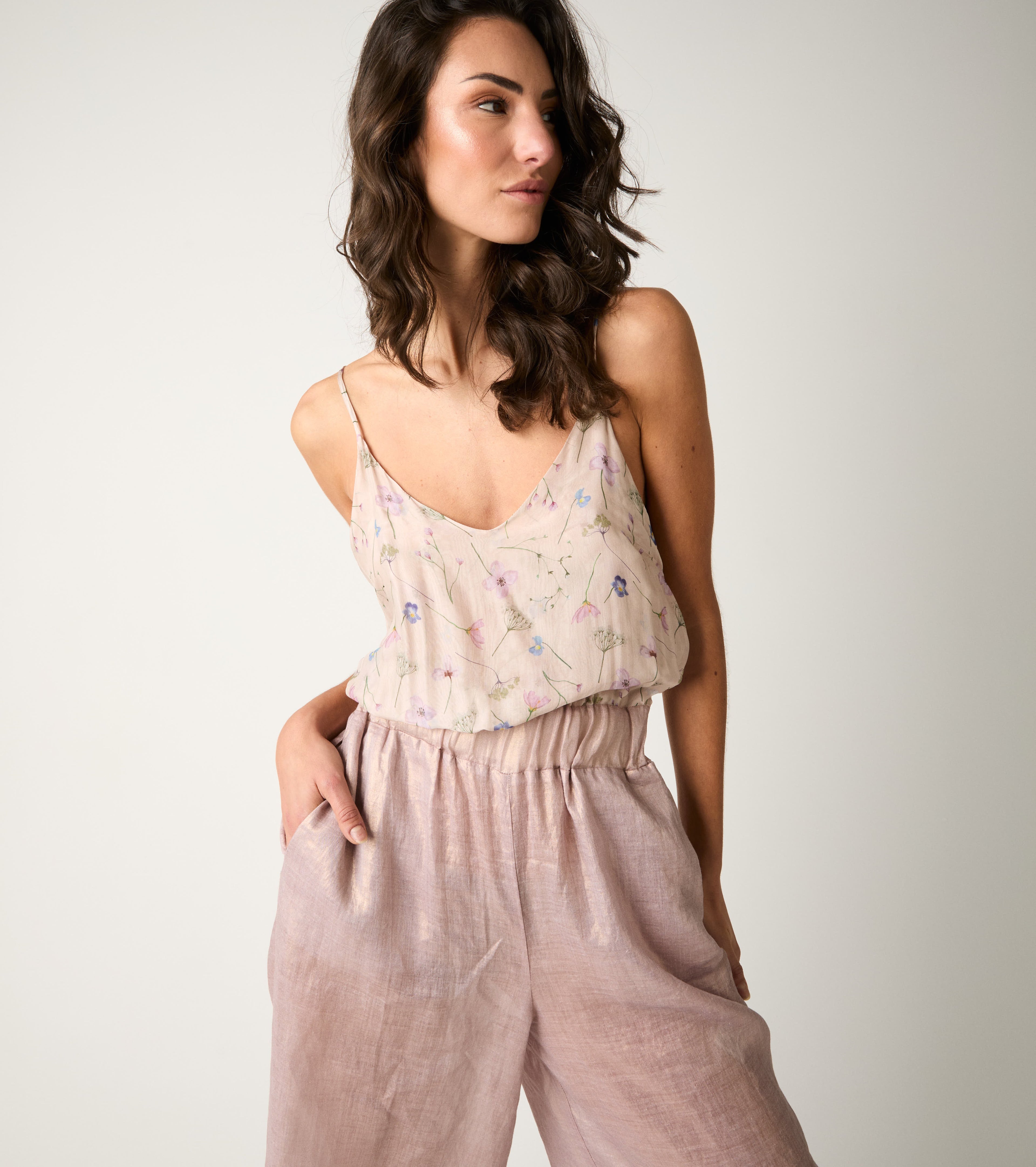 The model features a floral top with thin shoulder straps, an elasticated waist, and wide-leg trousers. For an ethereal and refined look that expresses delicate femininity and natural lightness.