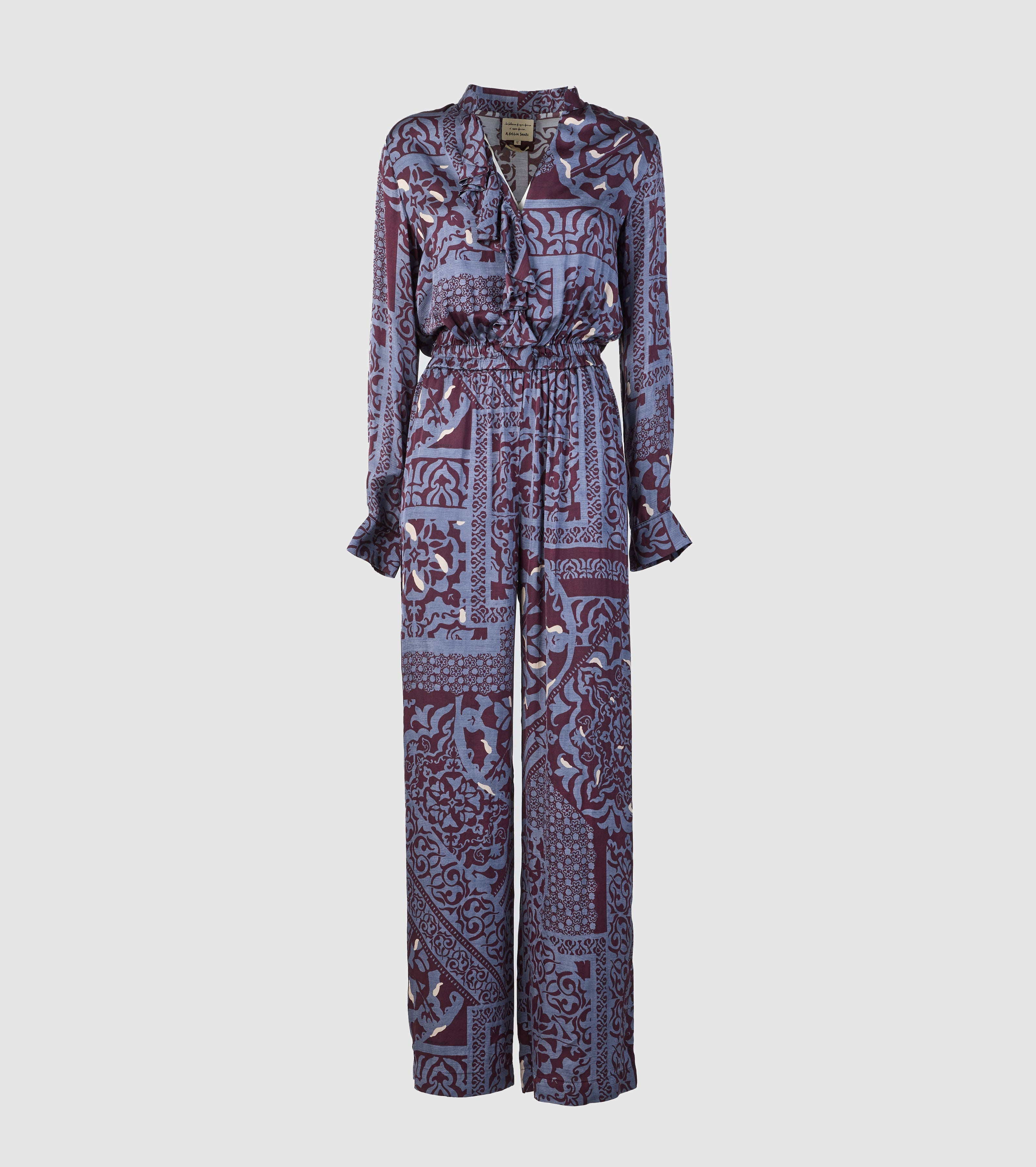 Tuta in raso di viscosa dal design fluido, caratterizzata da una stampa geometrica nei toni del prugna e dell’azzurro polvere. Il modello presenta scollo a V con revers, maniche lunghe e vita elastica definita da una cintura coordinata. Il fit morbido e la texture luminosa esaltano la femminilità in chiave sofisticata, per un look contemporaneo e versatile, perfetto dal giorno alla sera.