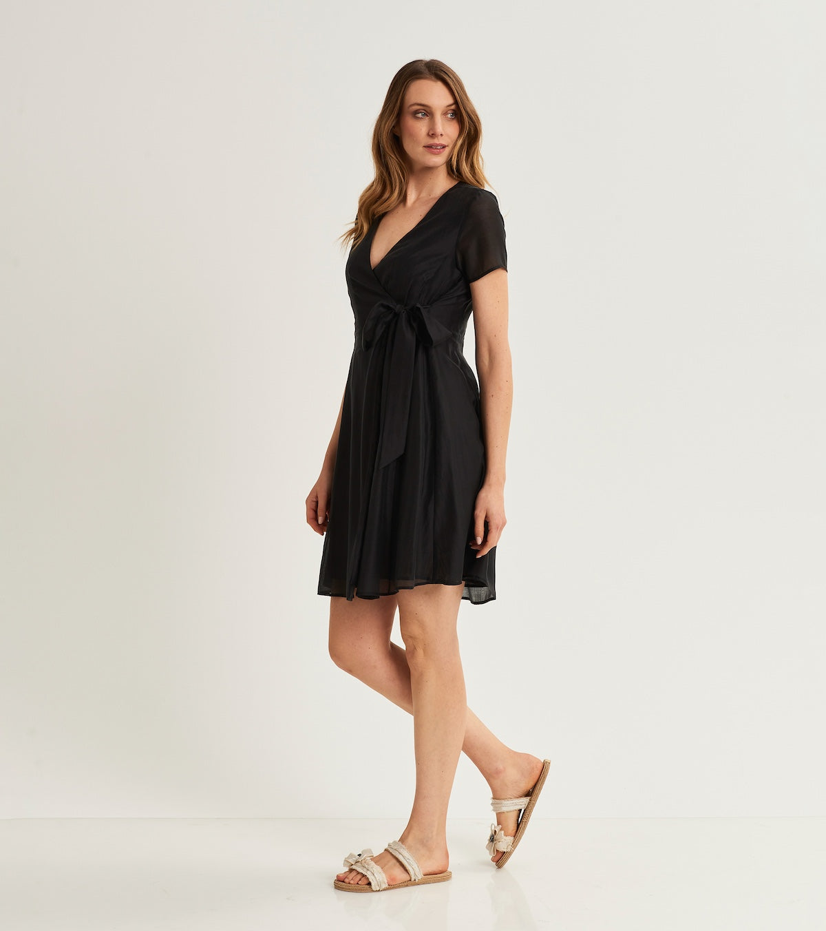 It features a crossover V-neckline, short sleeves and adjustable ties at the waist. Your new shortcut to a refined, versatile look.