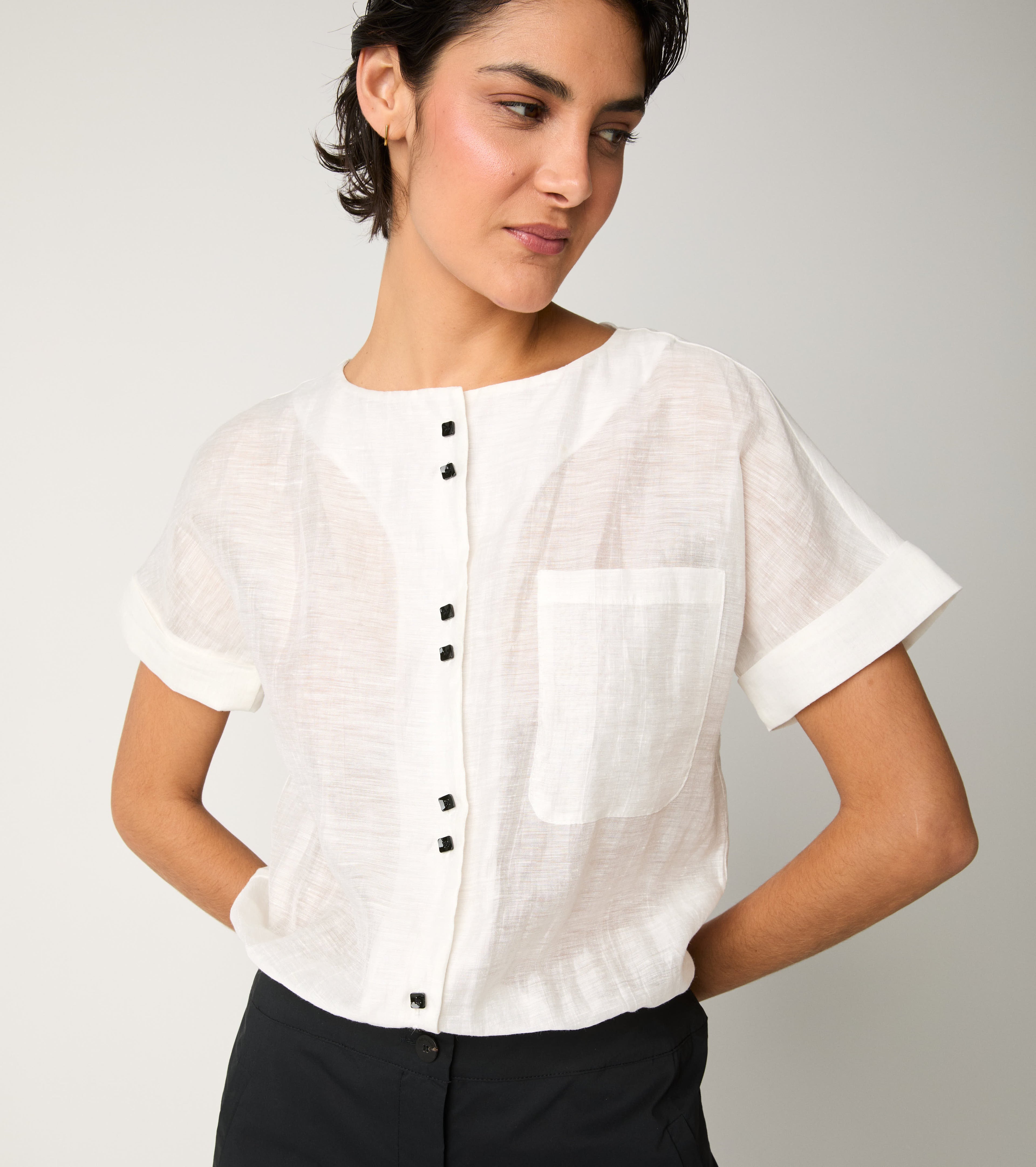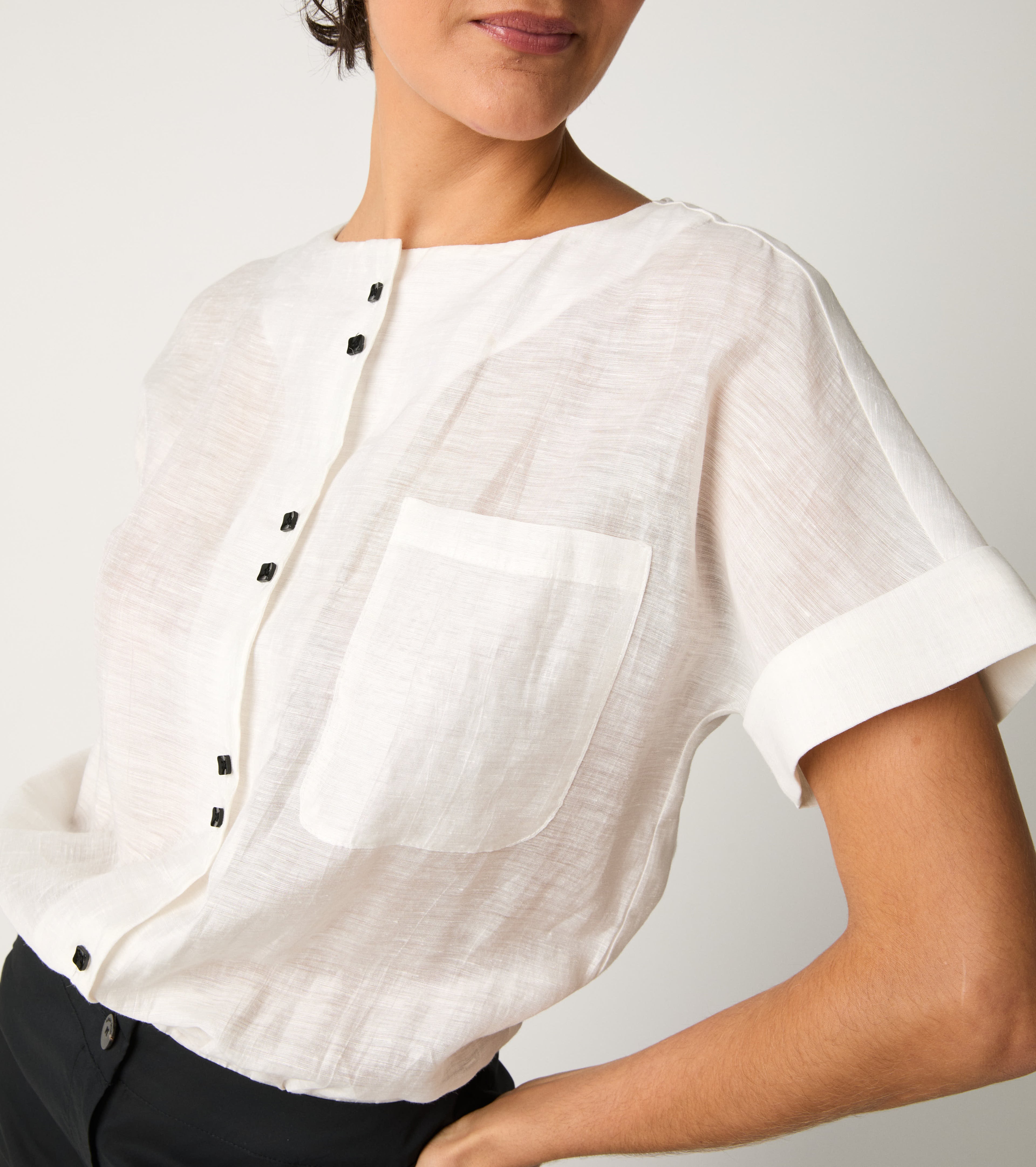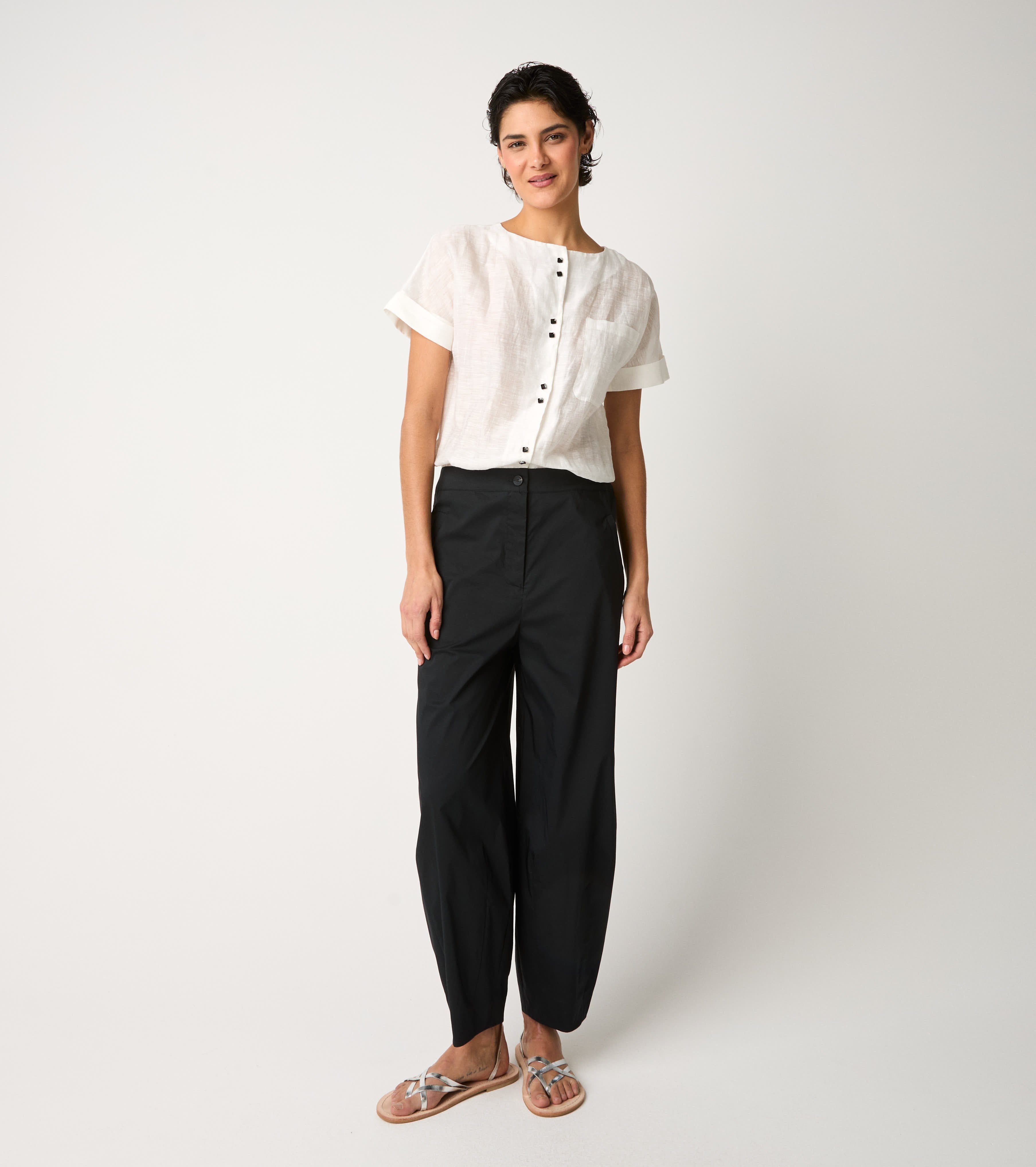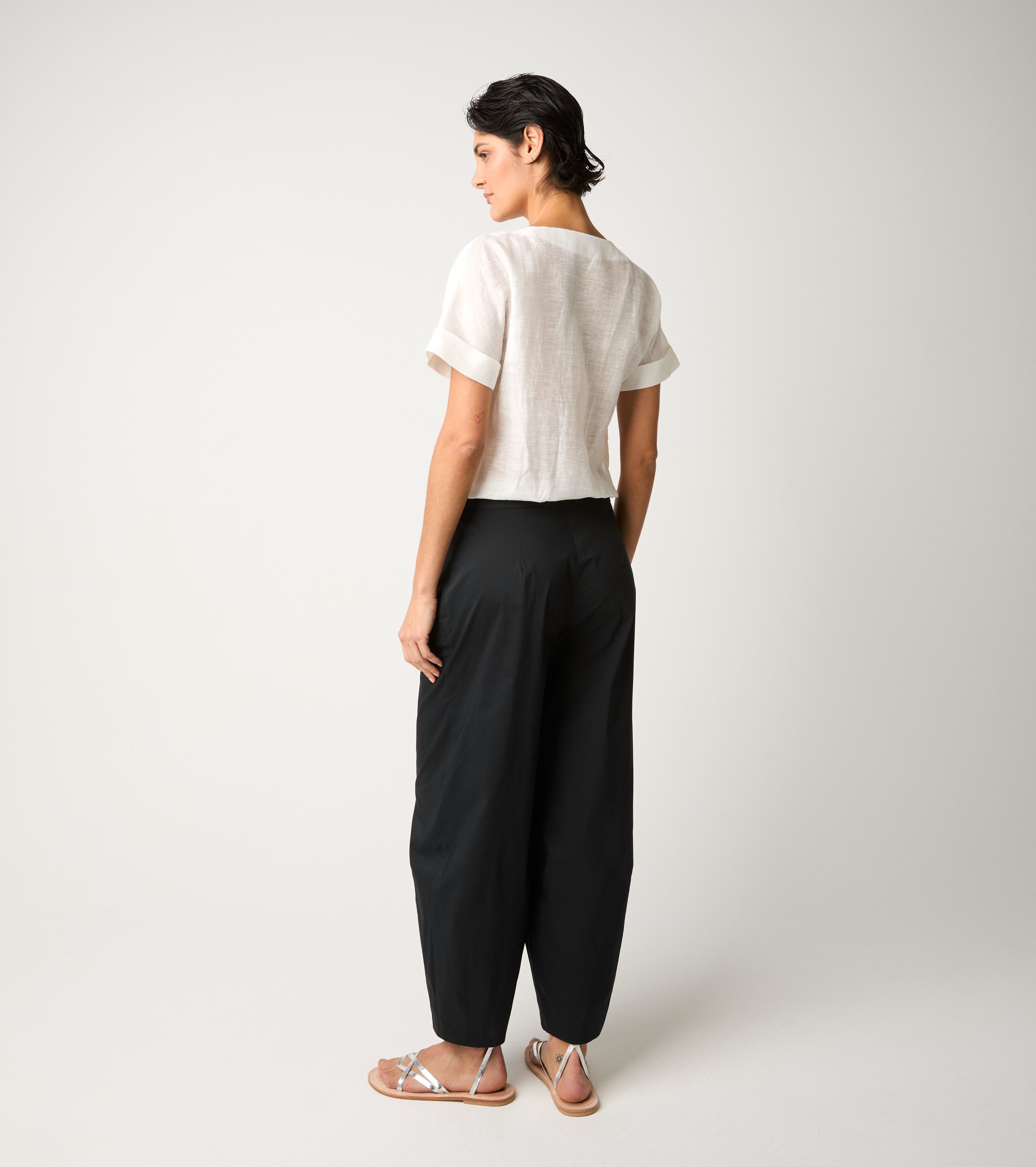 Scegli la tuta con top in lino e pantaloni in popeline di cotone.