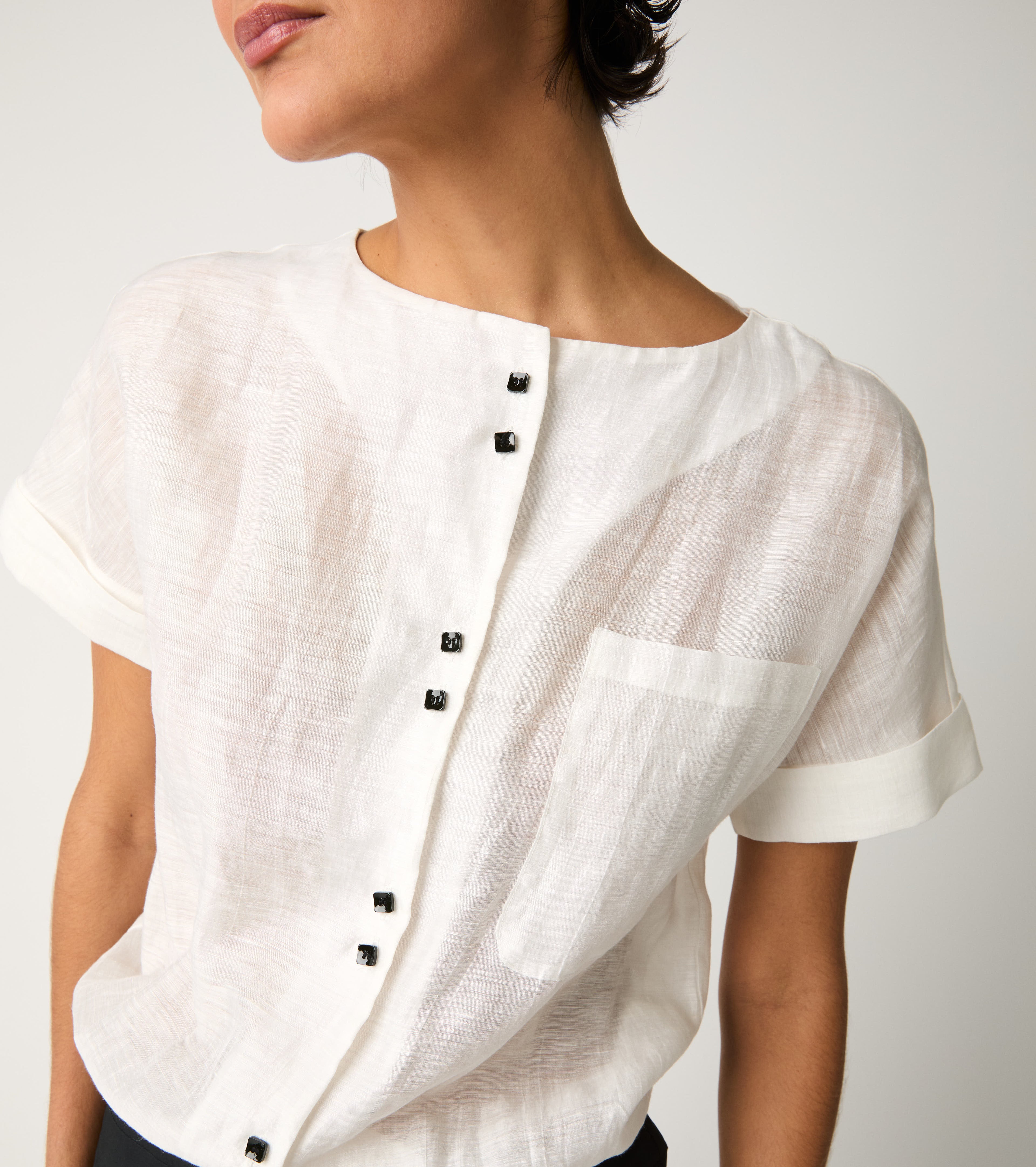 Il modello ha scollo a barca, maniche corte, bottoni a contrasto e pantaloni dal design ampio. Un equilibrio raffinato che combina leggerezza e comfort.
