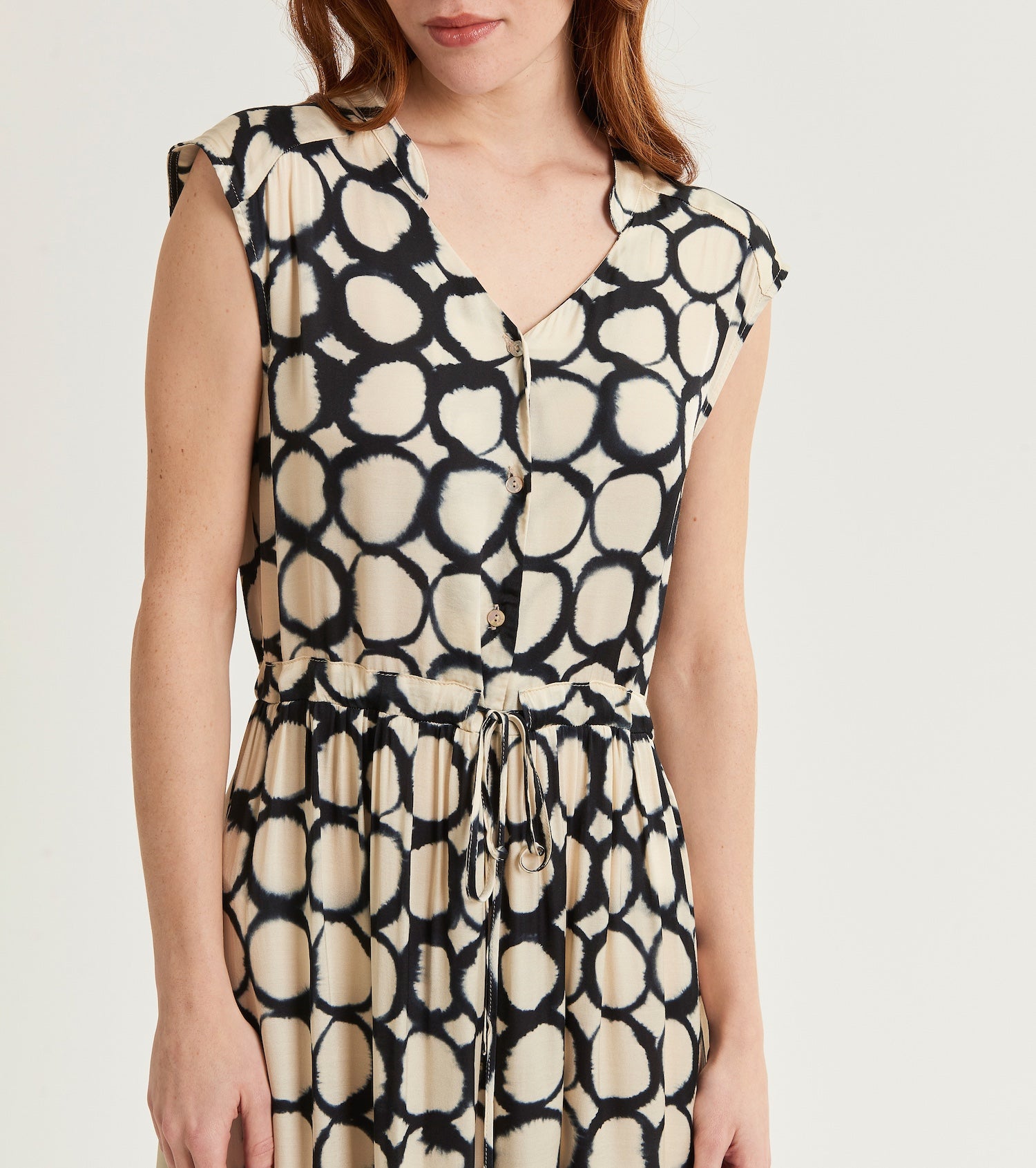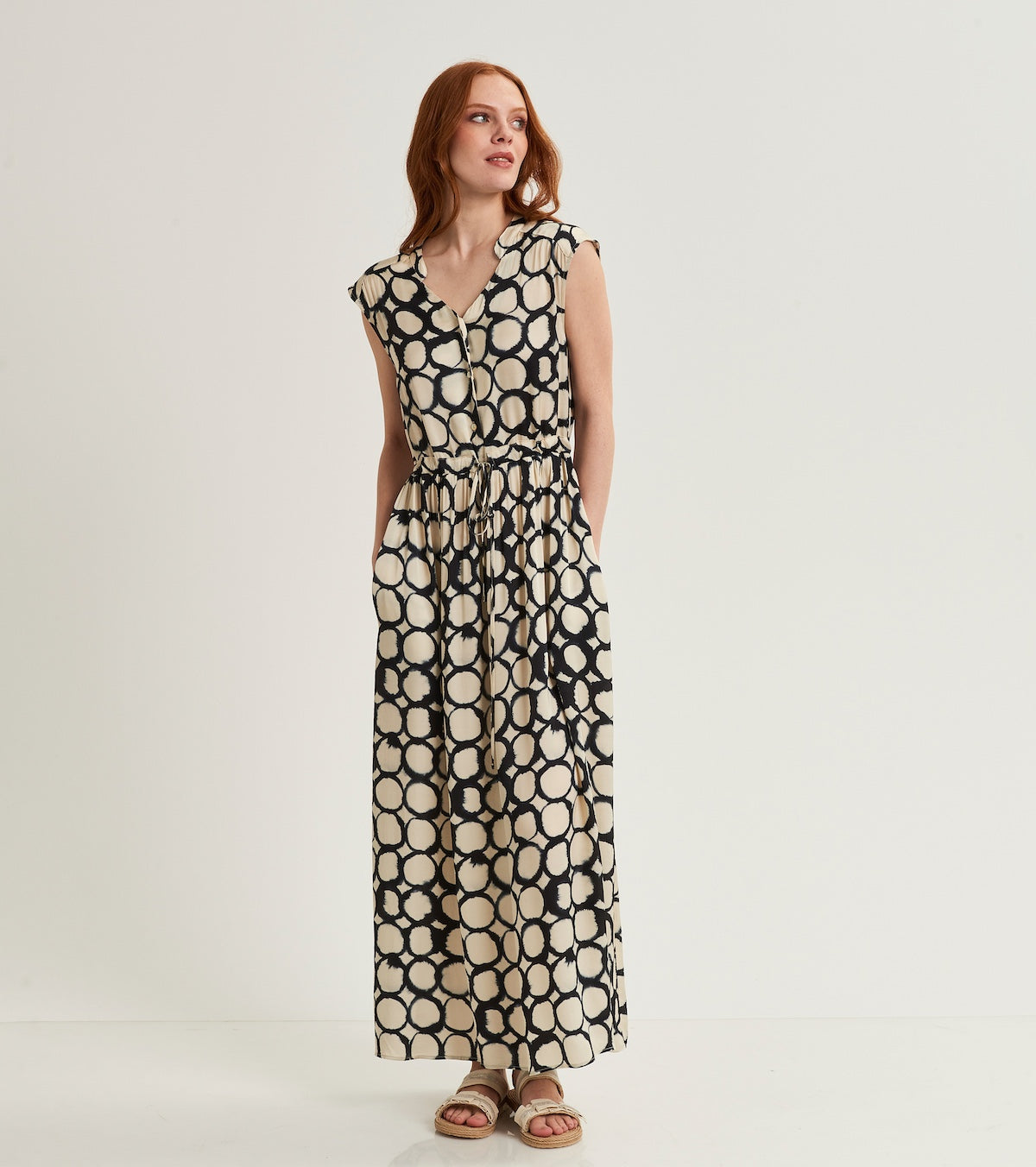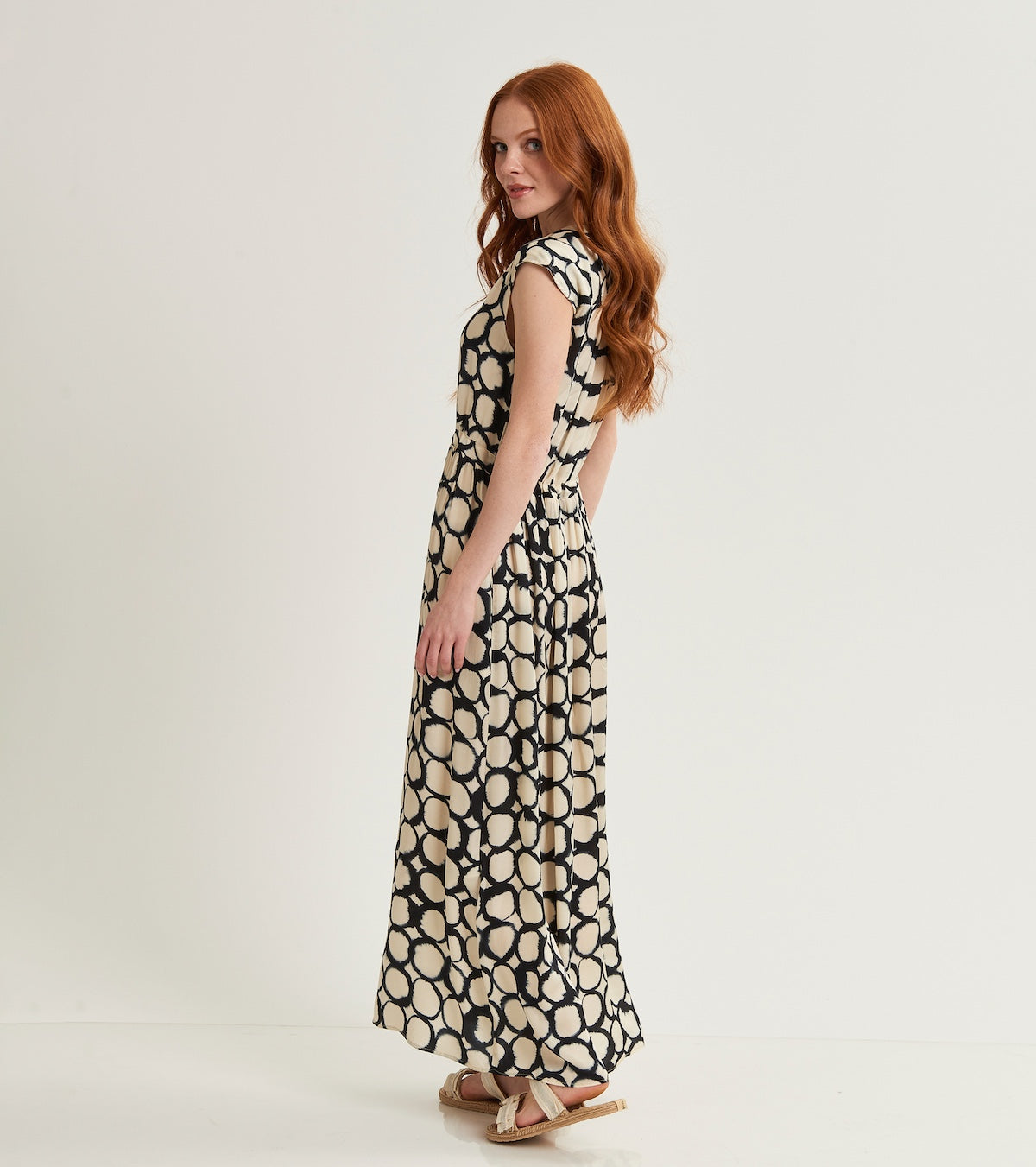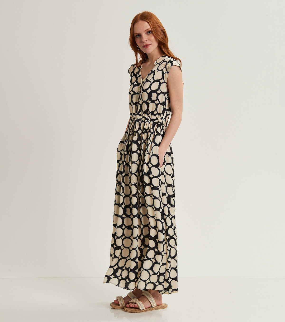 Fresco e chic, l'abito a pois si abbina perfettamente alla leggerezza della giacca kimono in voile e alla sciarpa coordinata. Un look che celebra l'armonia del black & white.