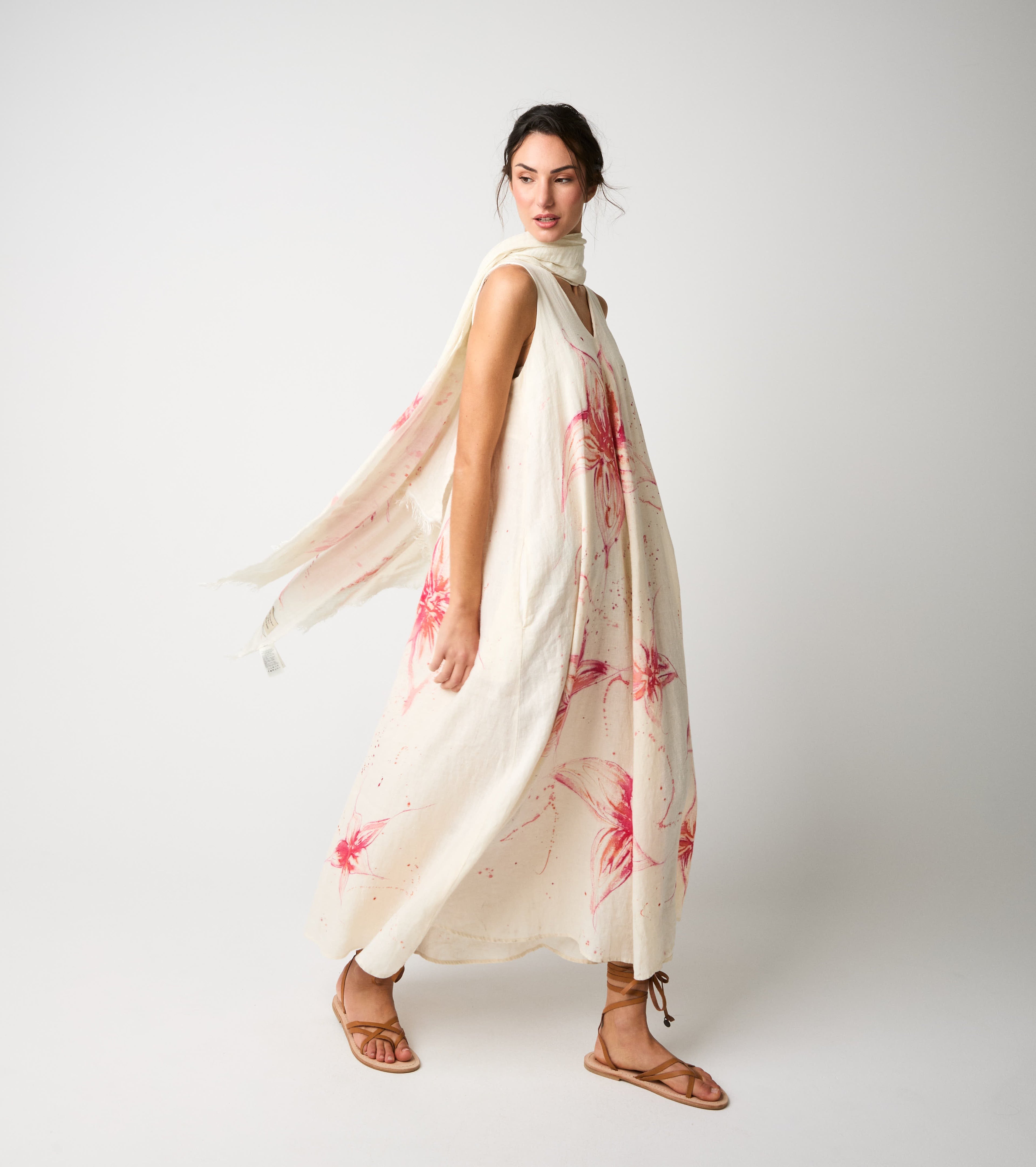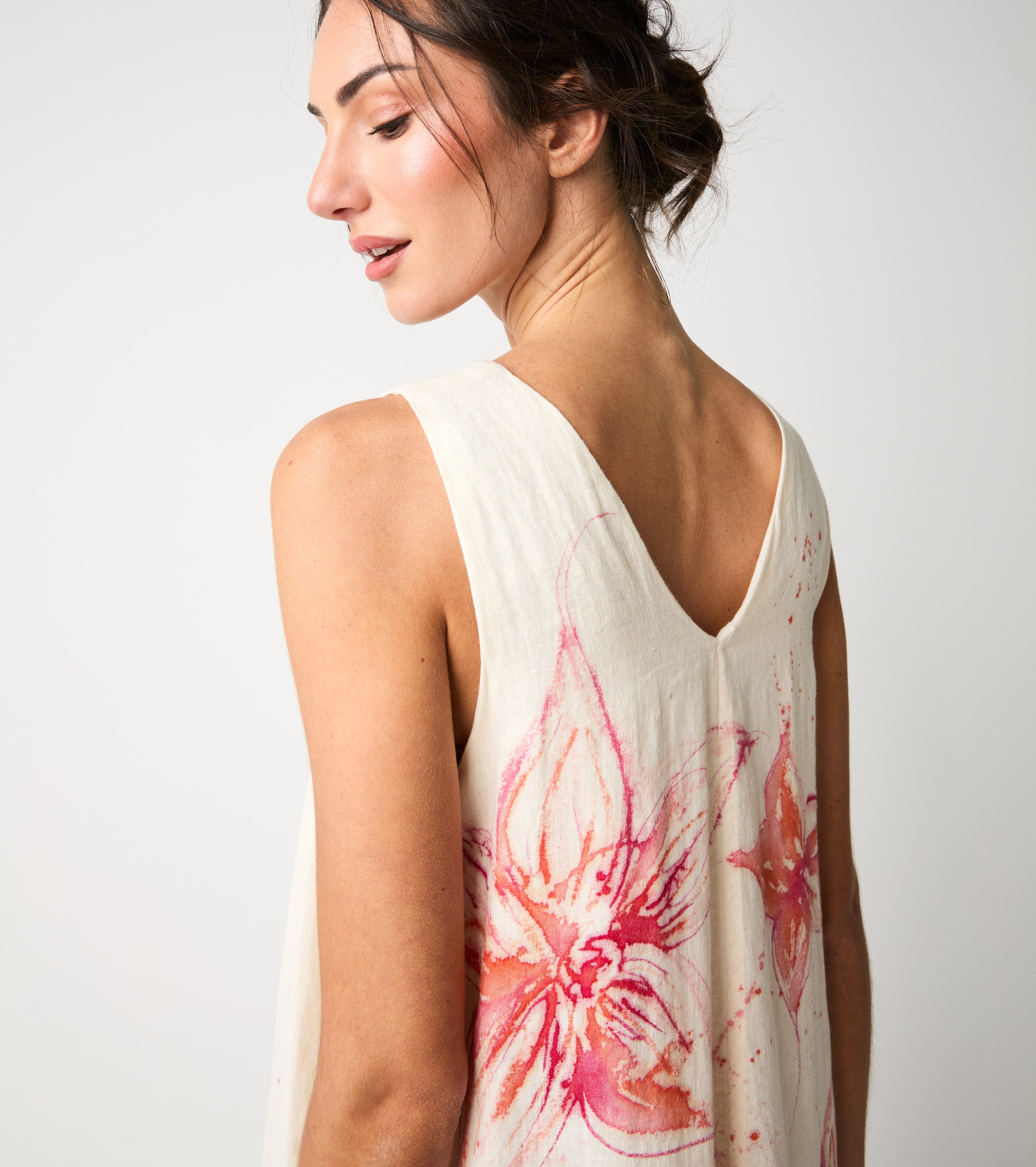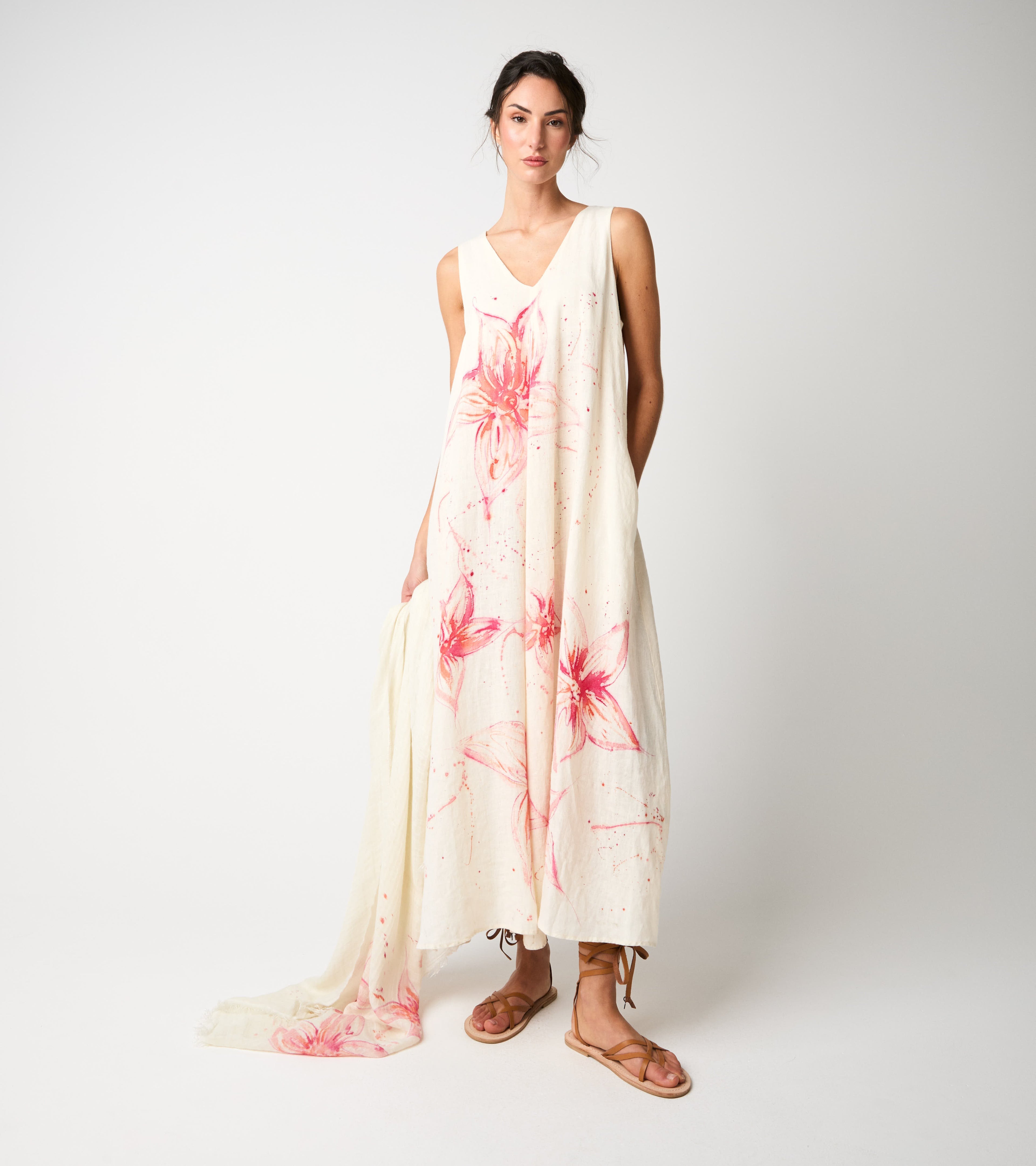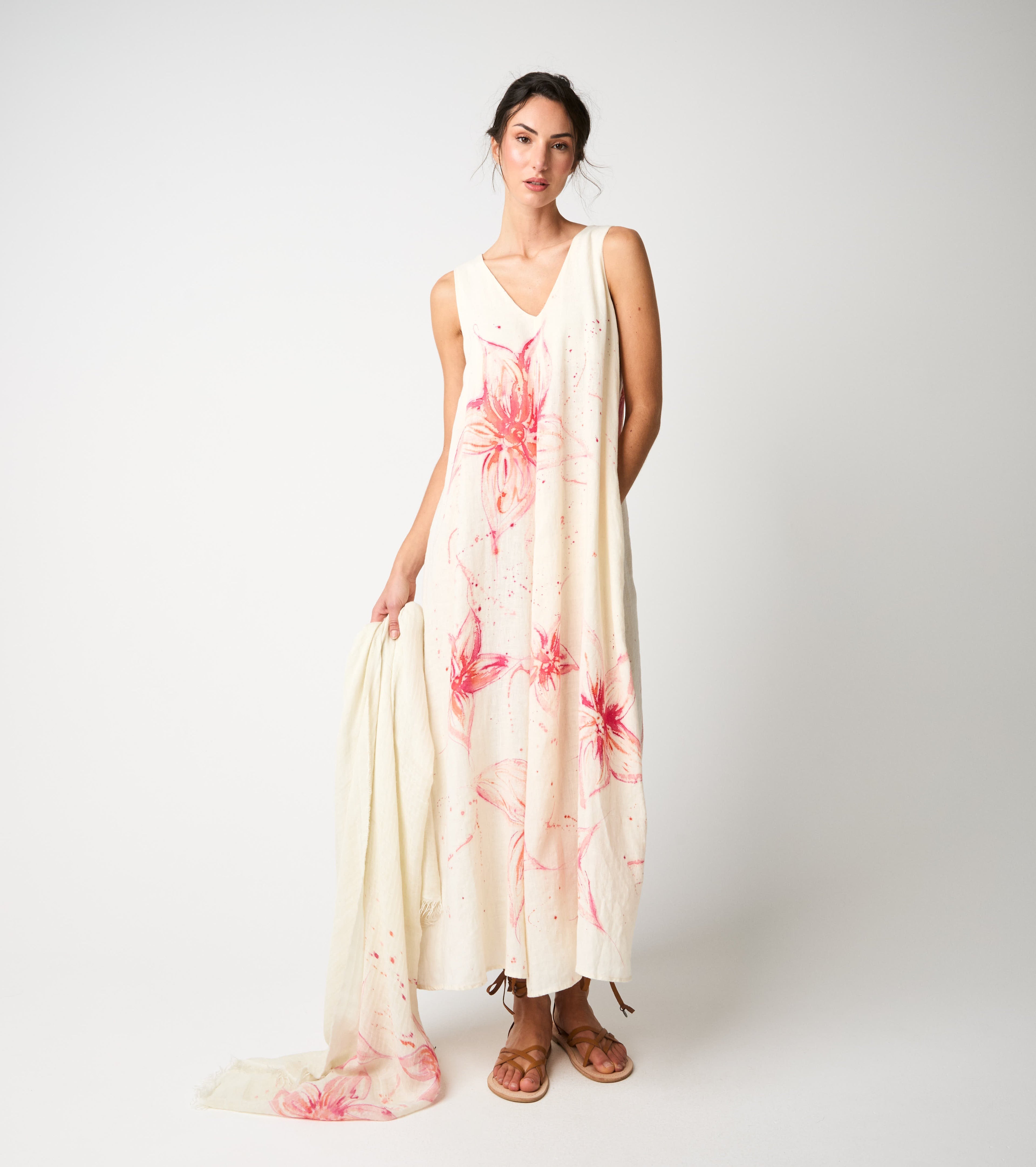 Scegli l'abito lungo realizzato in lino e impreziosito da una romantica stampa floreale.