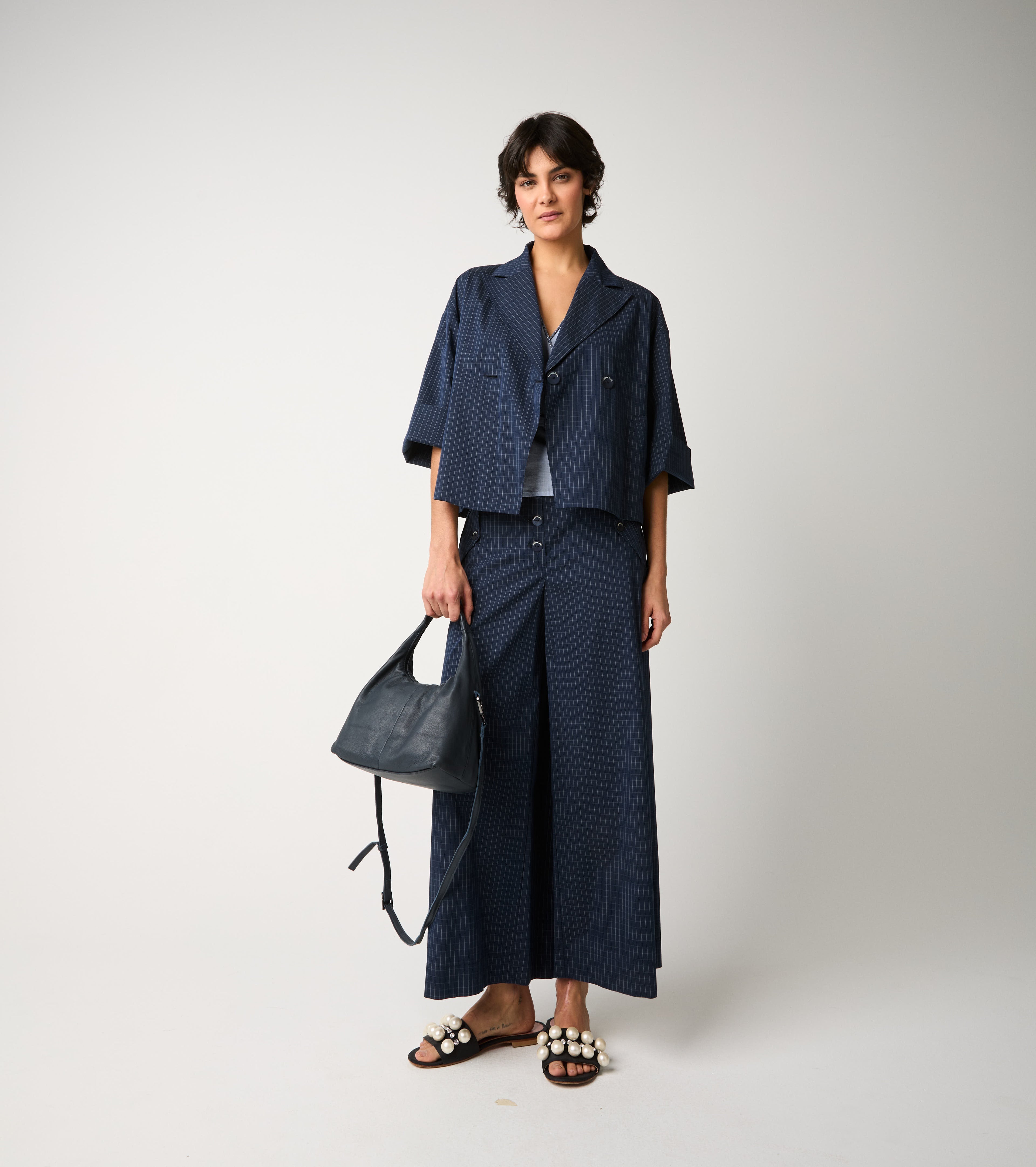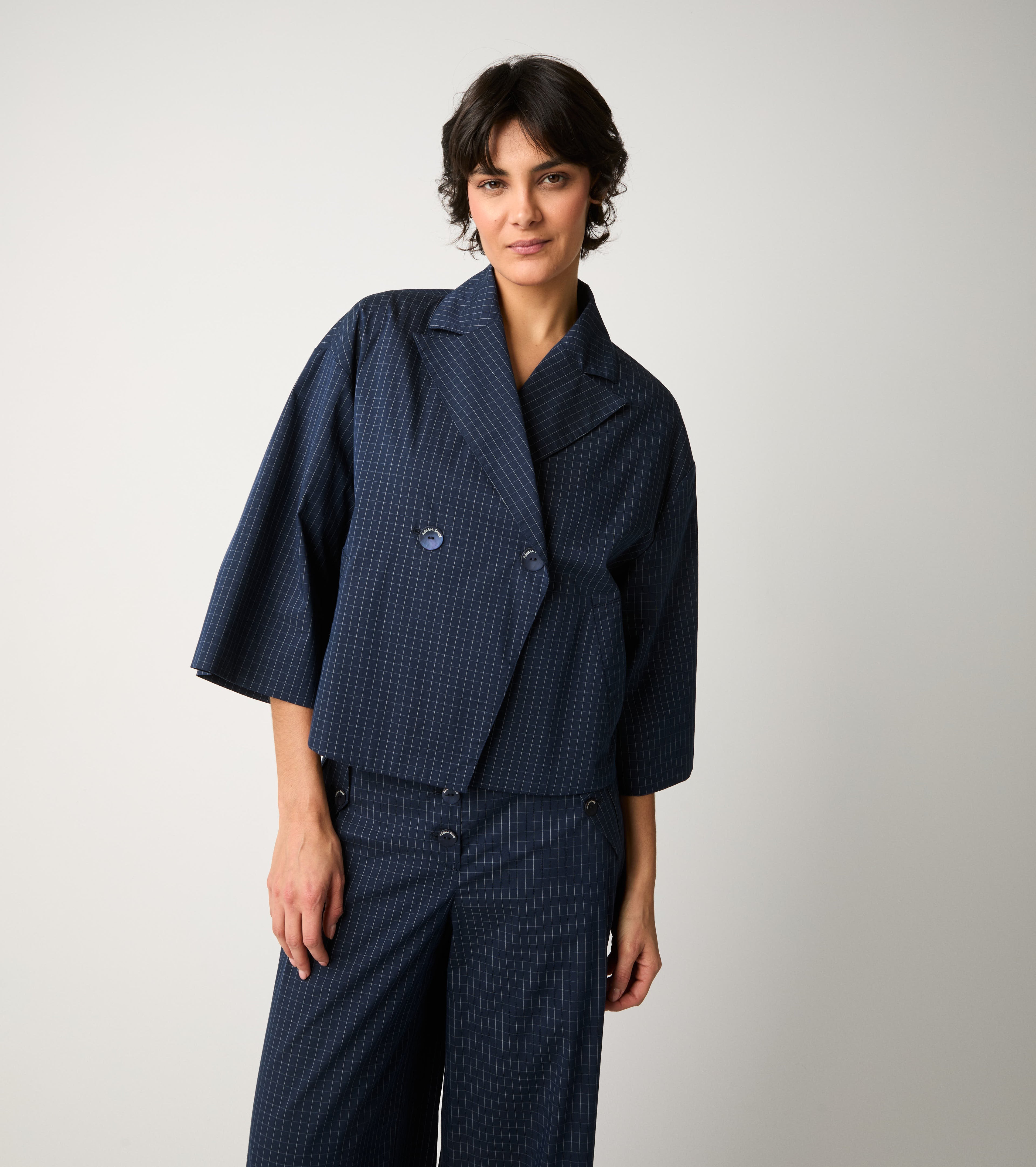 Il modello dal design cropped presenta revers classico, tasche a filetto e maniche a tre quarti. Per un'eleganza moderna e disinvolta.